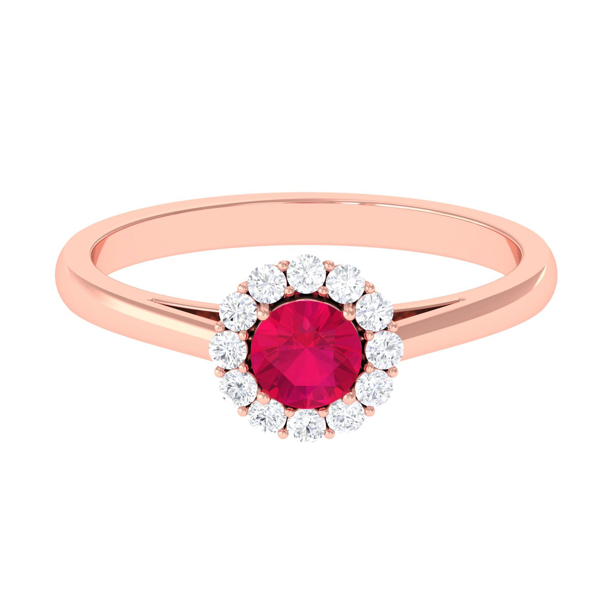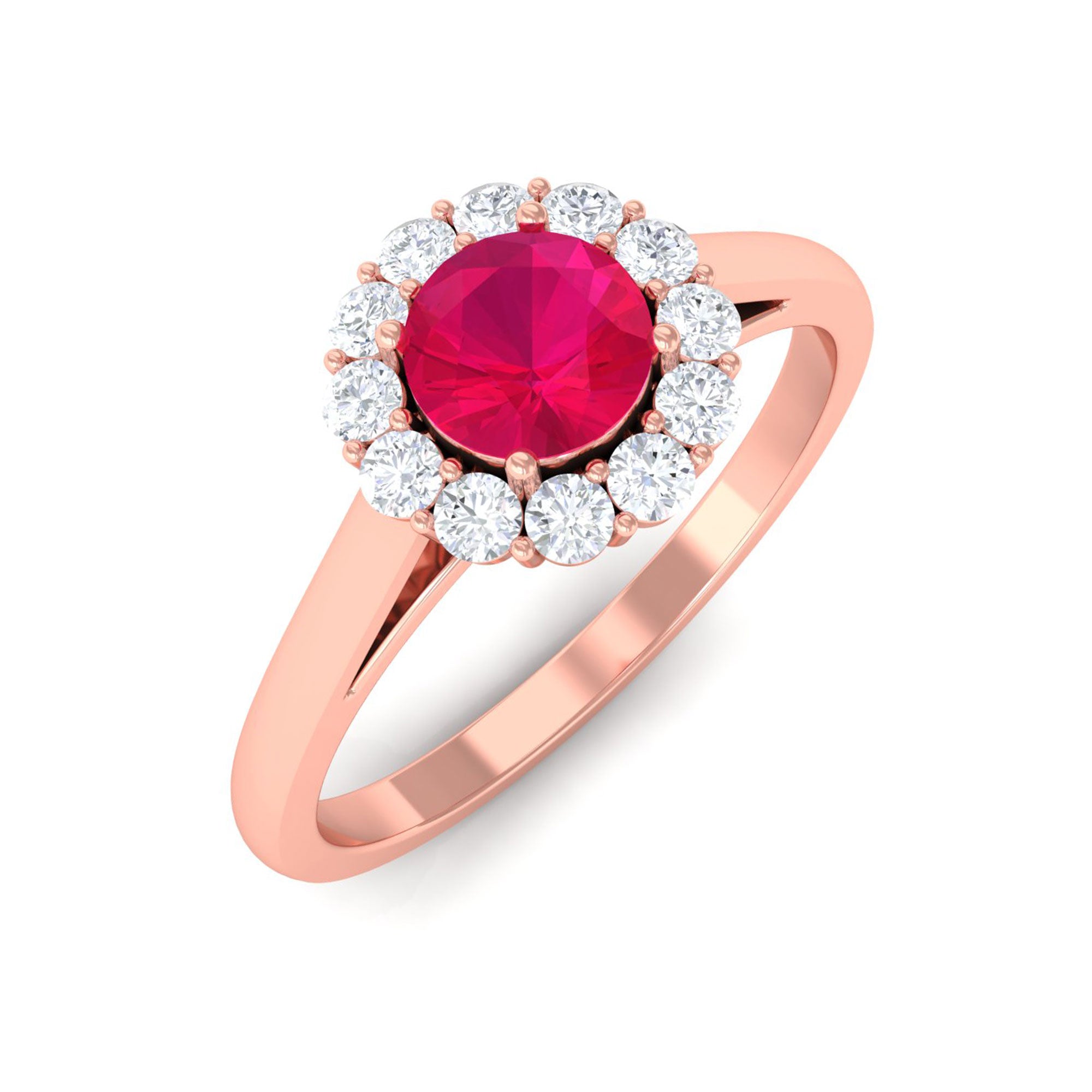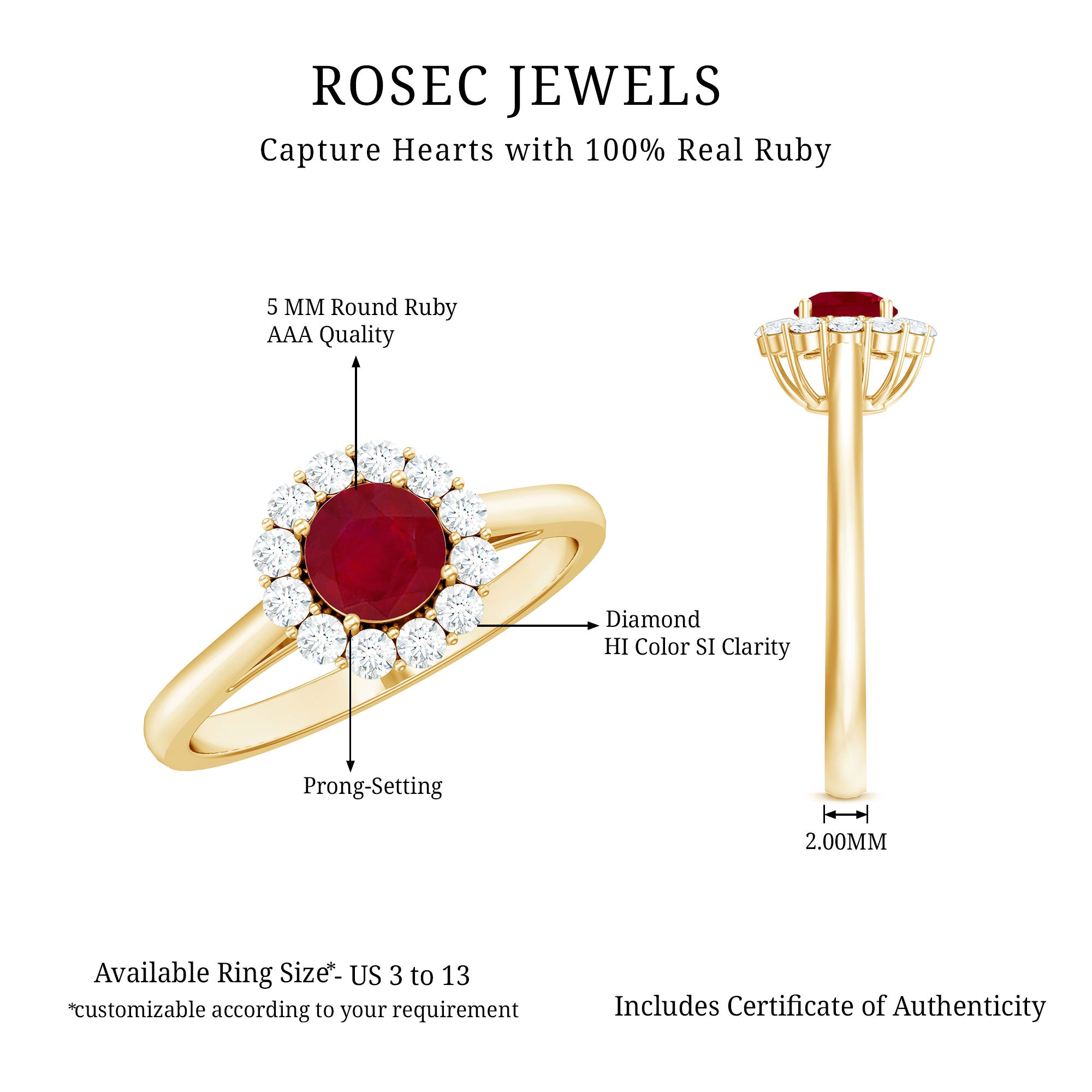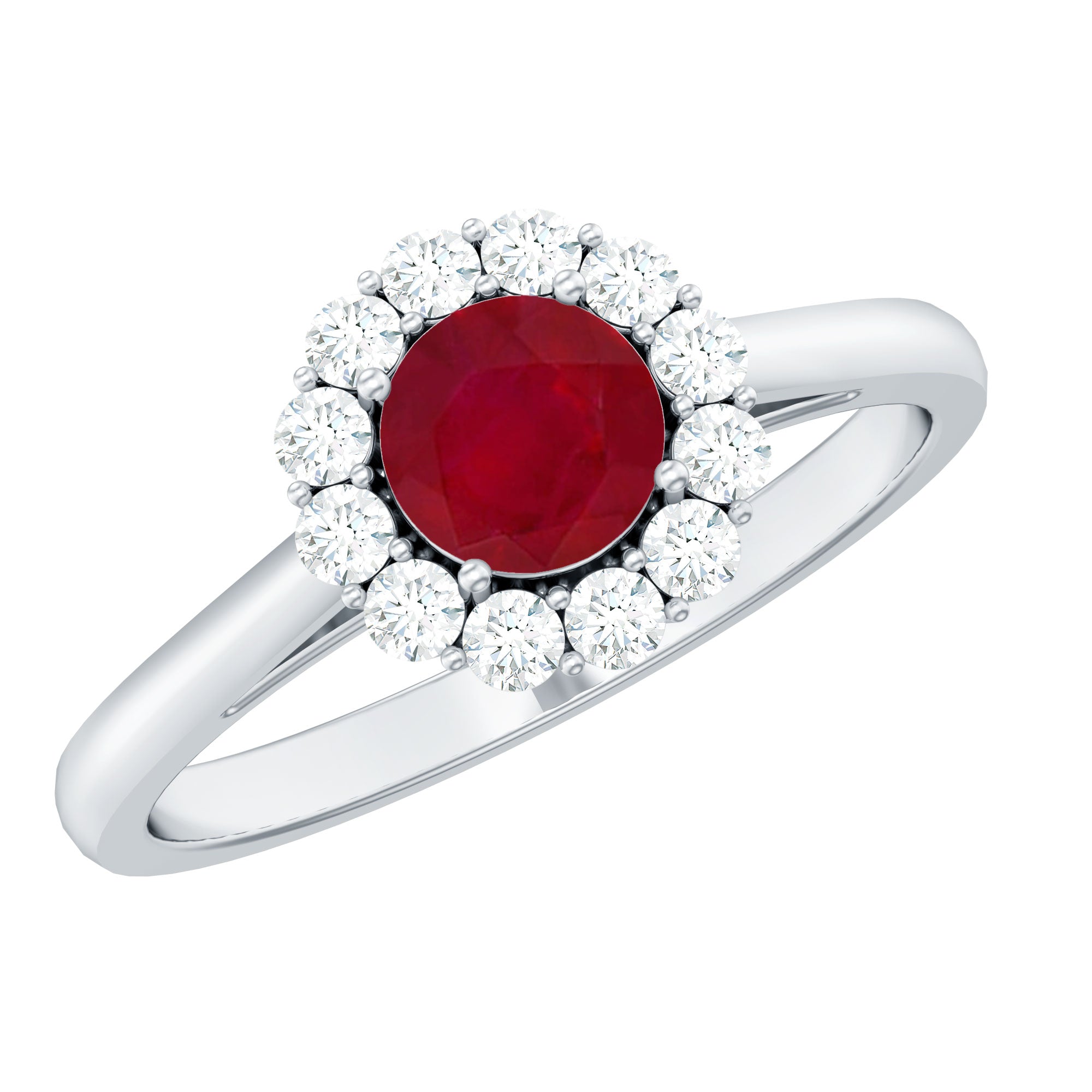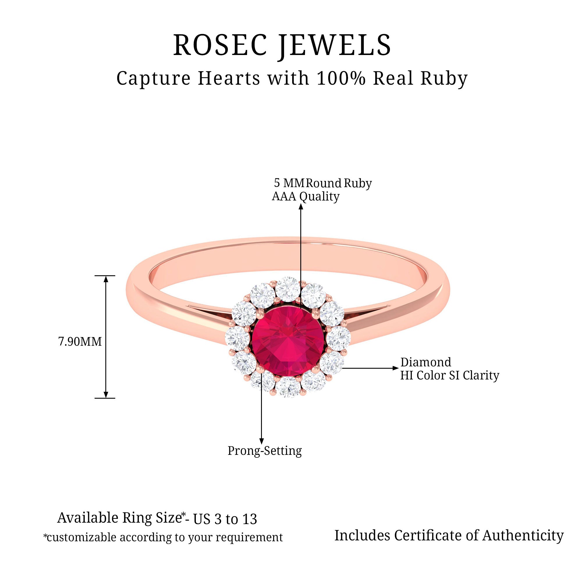 This Halo Ring will mesmerize everyone when you will walk around the town. Adorned with sparkling 5 MM Round Shape Ruby in the center while Round Shape Diamonds studded as Halo, enhance its beauty. This Ruby and Diamond Ring is crafted with Hallmarked Metal and makes a precious anniversary gift for your partner, something she would never like to keep away from herself.