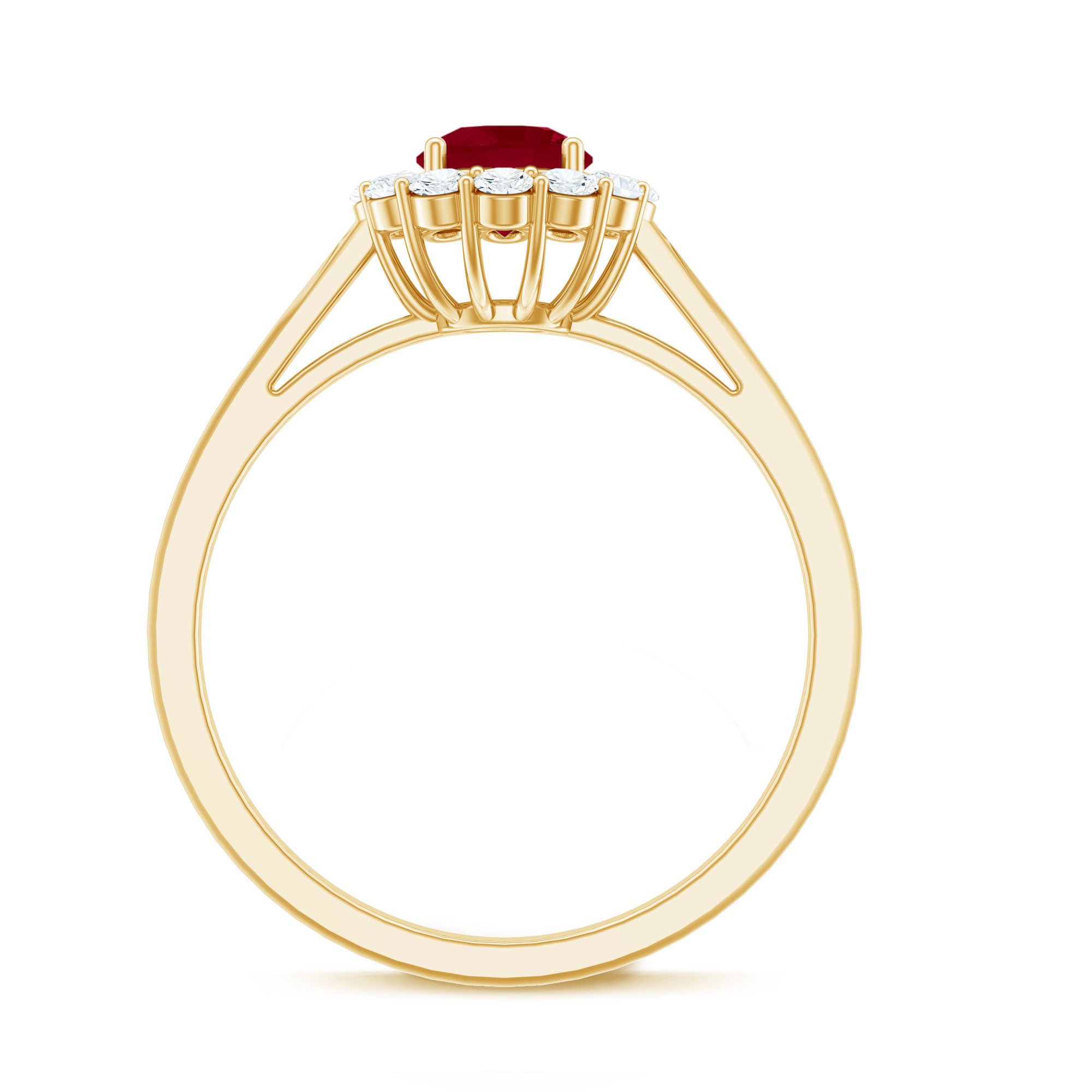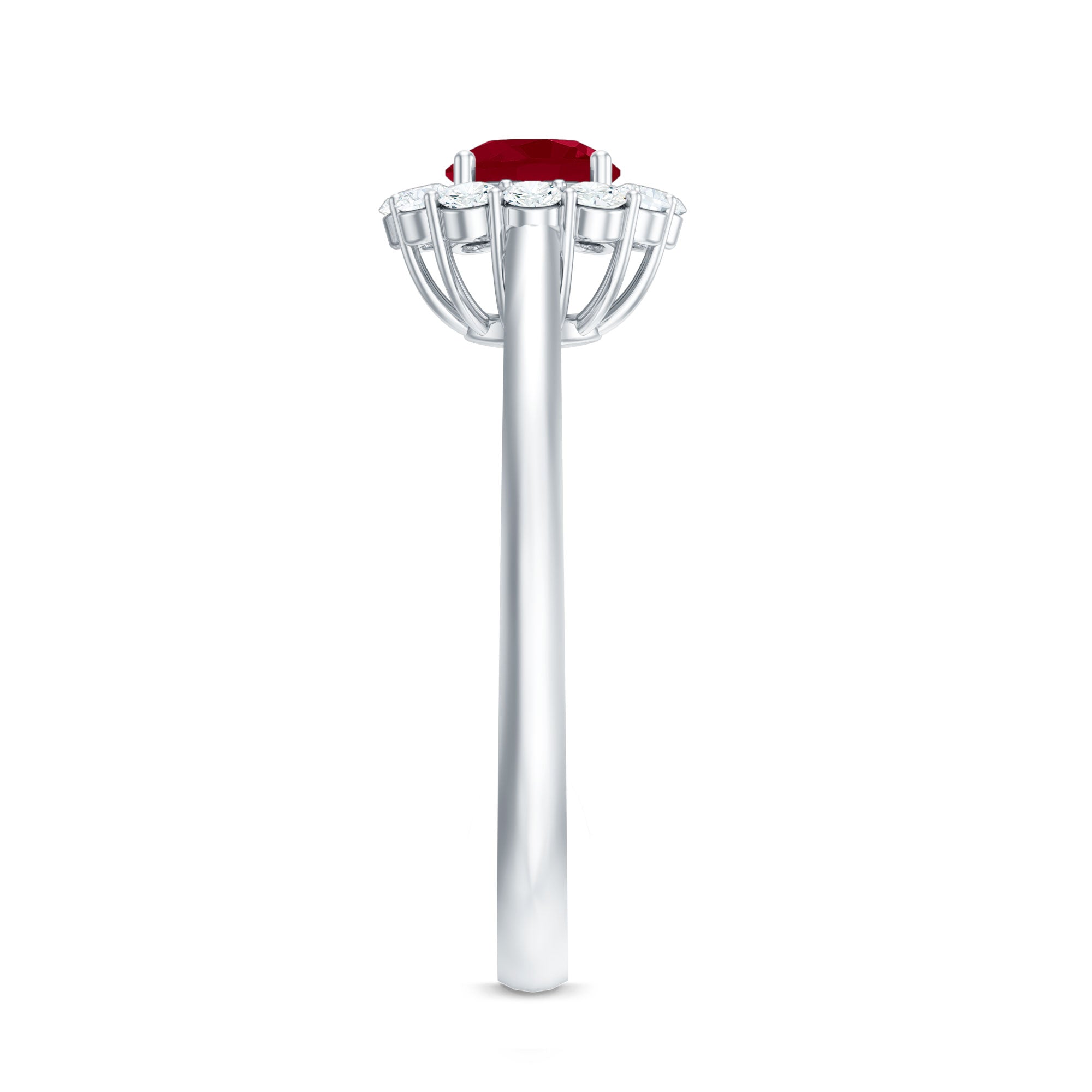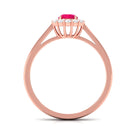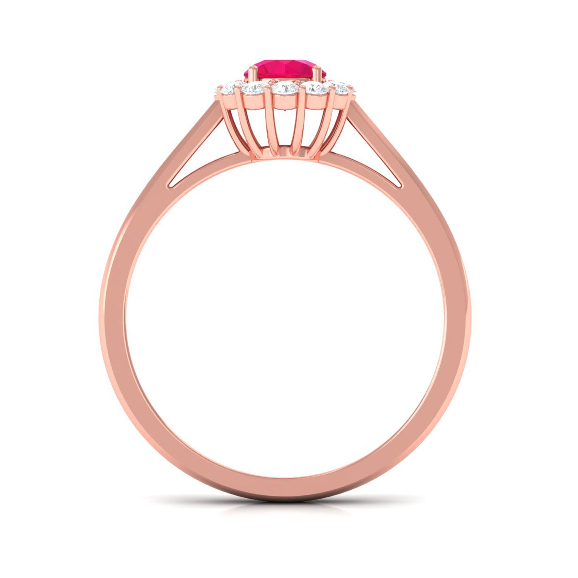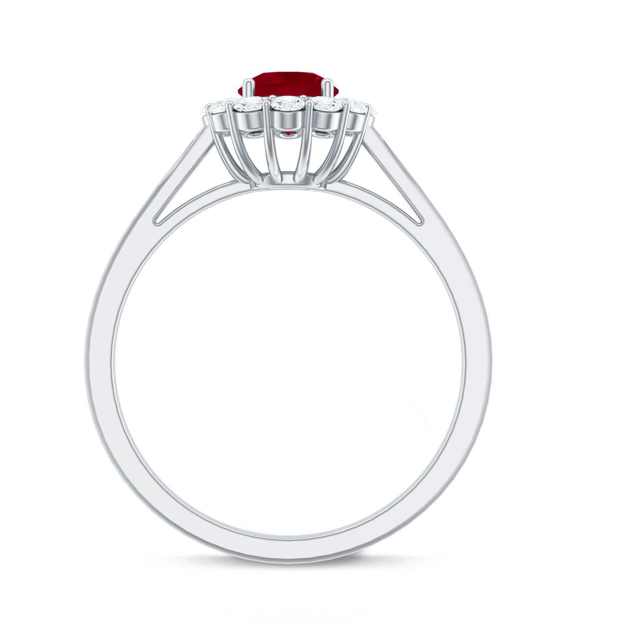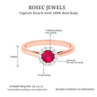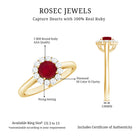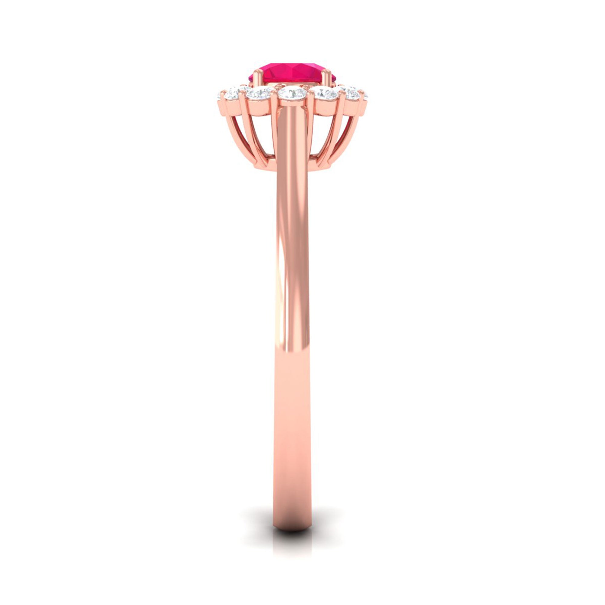 This Halo Ring will mesmerize everyone when you will walk around the town. Adorned with sparkling 5 MM Round Shape Ruby in the center while Round Shape Diamonds studded as Halo, enhance its beauty. This Ruby and Diamond Ring is crafted with Hallmarked Metal and makes a precious anniversary gift for your partner, something she would never like to keep away from herself.