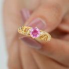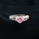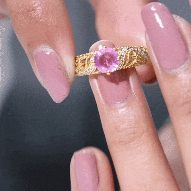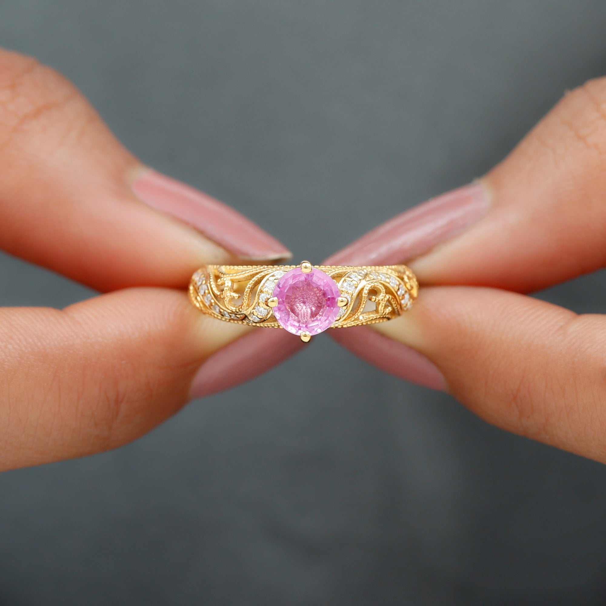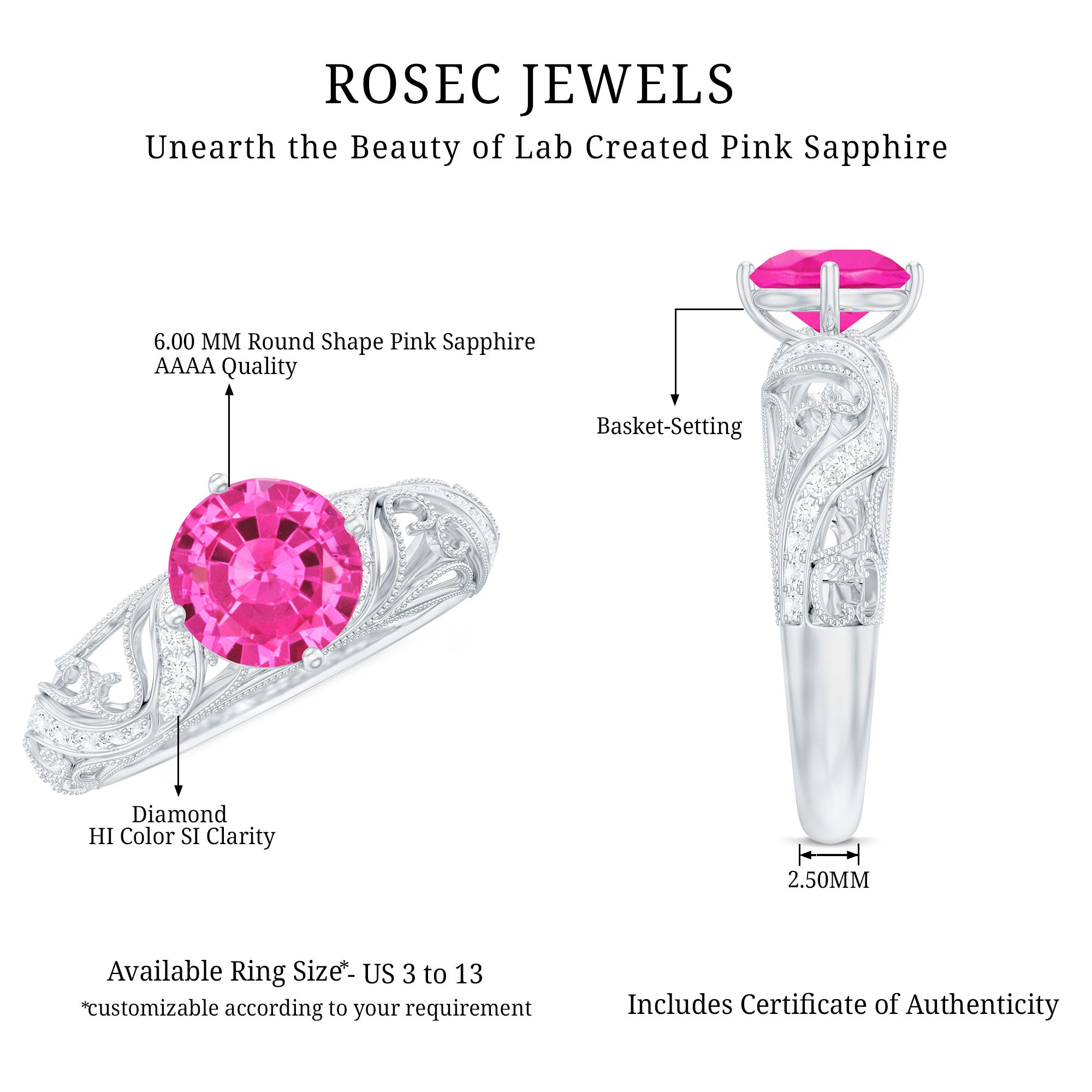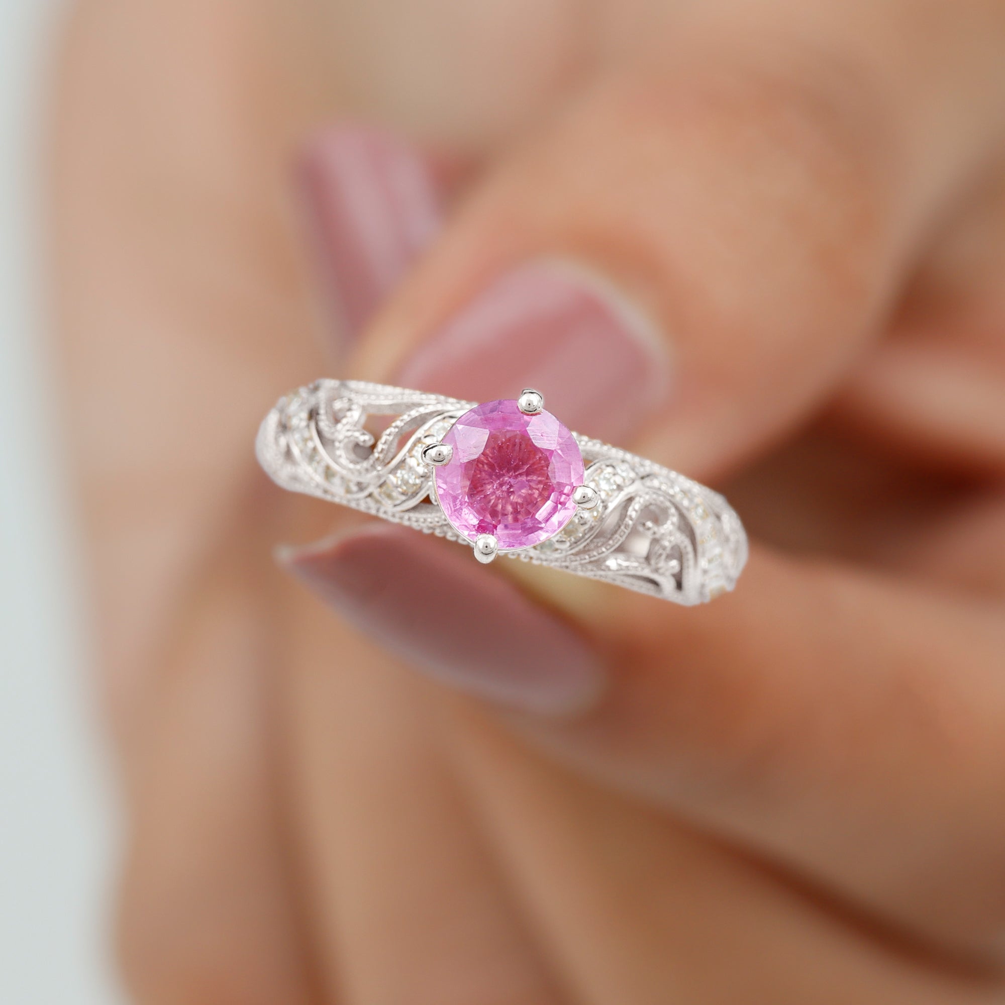 A love that stands the test of time deserves a ring just as remarkable, and this Lab Created Pink Sapphire Engagement Ring captures that sentiment beautifully. Features a 6 MM round lab created pink sapphire, set in basket setting. The vibrant pink gemstone is complemented by round diamonds along the band, which add sparkle and brilliance, enhancing the ring’s overall charm. Delicate beaded detailing along the vintage inspired band adds texture and subtle elegance, giving the piece a heirloom-quality feel. Crafted with AAAA quality lab created sapphire and HI-SI quality diamonds, this Vintage Style Engagement Ring combines exceptional beauty with lasting durability, offering the perfect blend of luxury and practicality. This Pink Sapphire and Diamond Ring is designed for those who appreciate timeless elegance with a touch of unique color. It is ideal for proposals, anniversaries, or as a treasured symbol of love that will be worn and admired for decades. The antique inspired design, sparkling diamonds, and vibrant pink sapphire come together to create a piece that is both classic and distinct.
