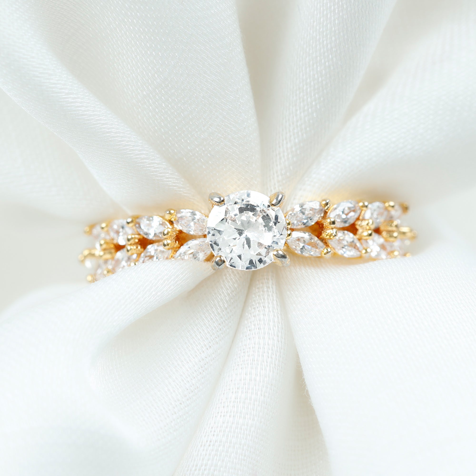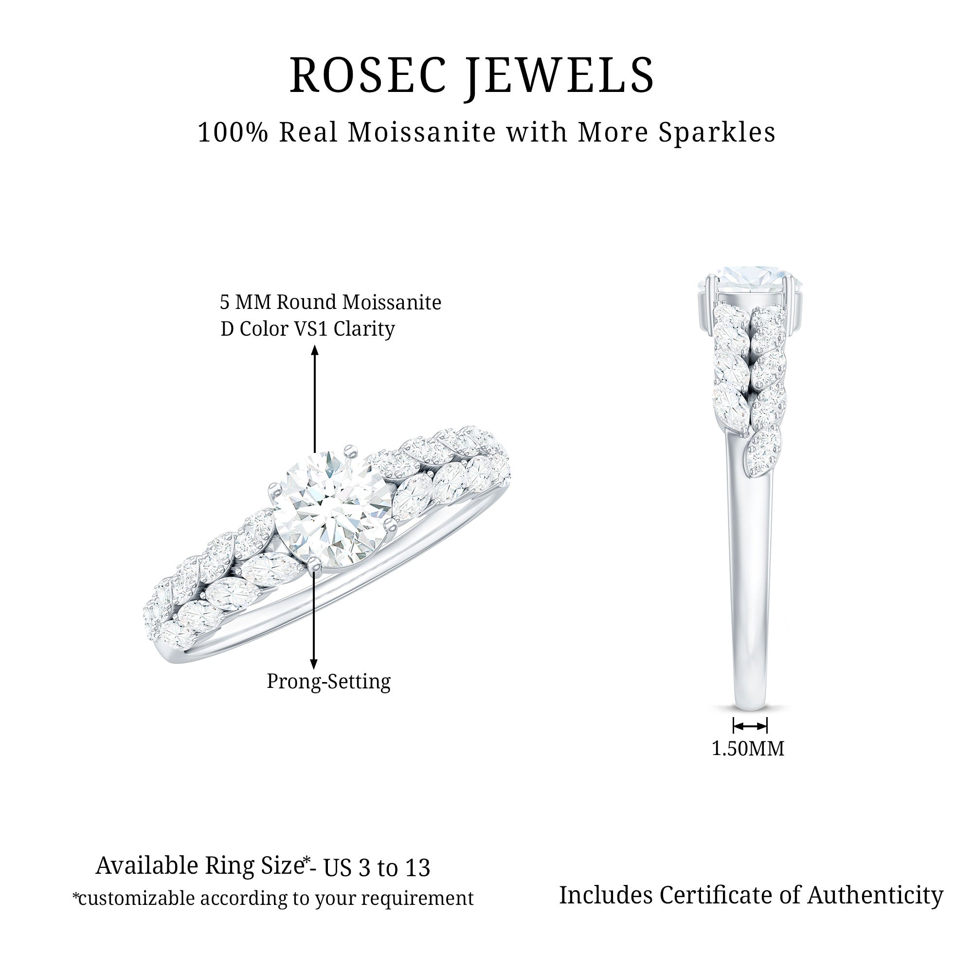Round Shape Moissanite Engagement Ring with Marquise Side Stones