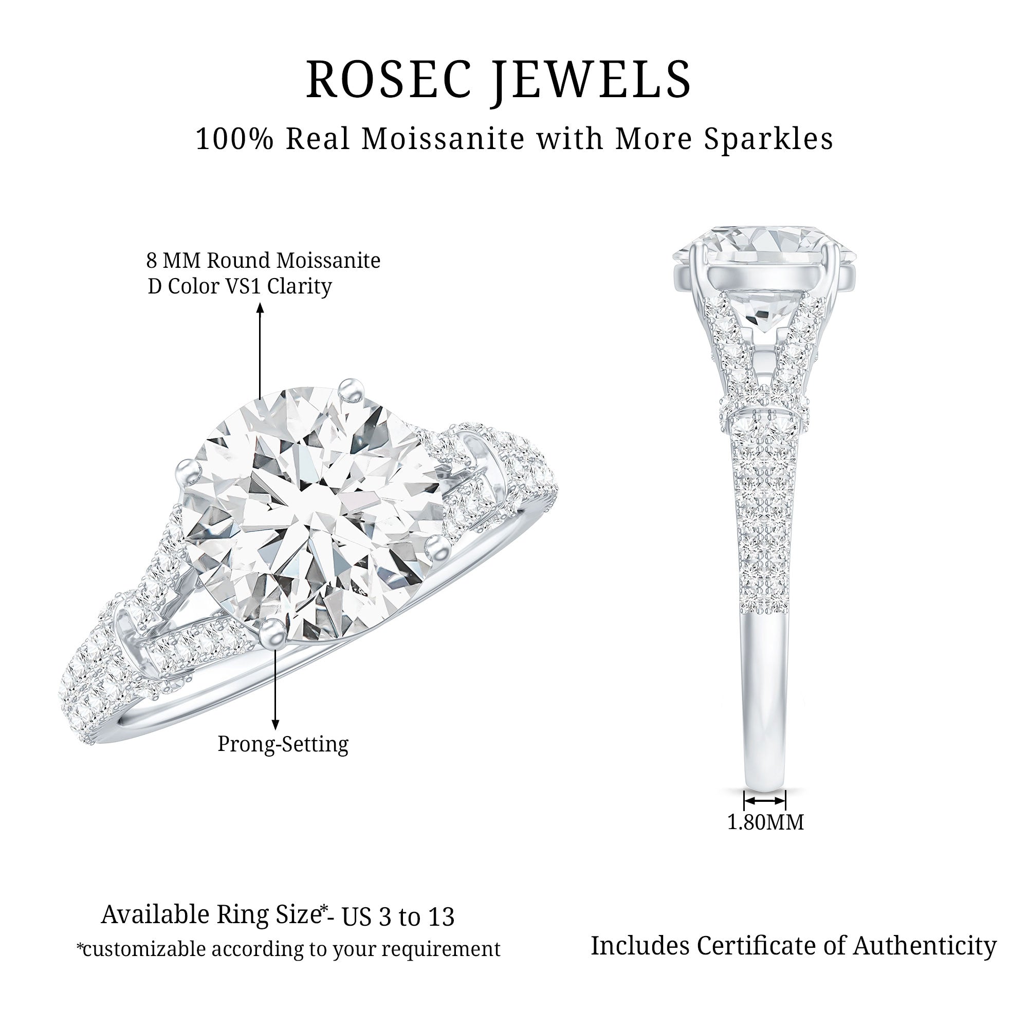 Celebrate your forever with a ring that captures the beauty of your bond and the brilliance of your love. This stunning Solitaire Engagement Ring features an 8 MM round cut Moissanite as the center stone, set in prong setting to maximize its sparkle. The brilliance and clarity of the stone give it a radiant, eye-catching glow, perfect for marking one of life’s most meaningful milestones. What sets this Moissanite Engagement Ring apart is its elegant split shank design, adorned with petite moissanite stones that add delicate shimmer and symbolism. The split shank represents two paths joining into one, beautifully reflecting your shared journey ahead. Additional stones are set gracefully along the bridge, creating a seamless trail of light that draws the eye to the center, your love story’s focal point. Modern yet timeless, this 2 carat moissanite ring brings together classic charm with a bold twist. Whether you are proposing, renewing your vows, or simply saying how much you love her, it is a piece that speaks louder than words. Arriving in a beautifully packaged jewelry box, this Split Shank Engagement Ring is ready to create an unforgettable memory.
