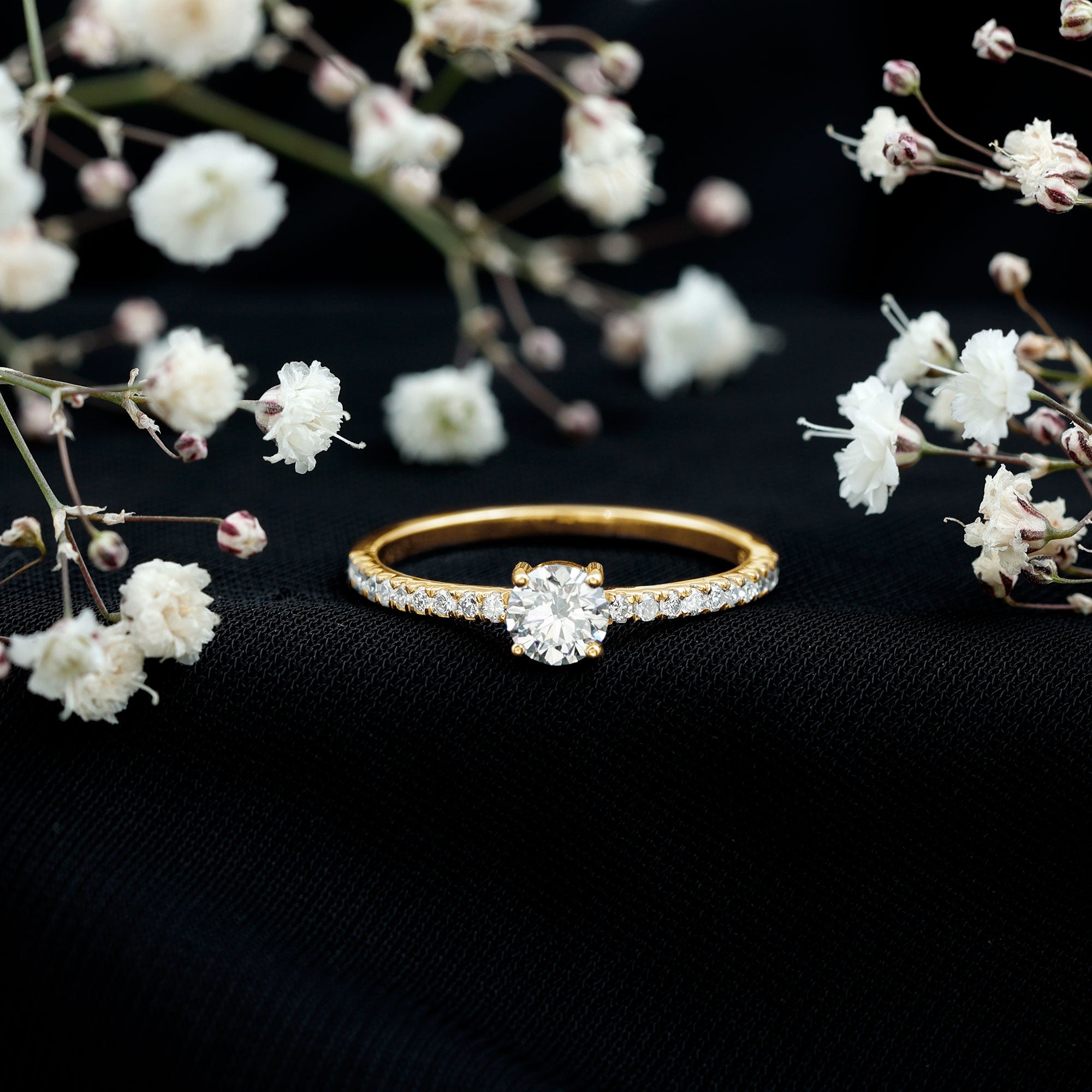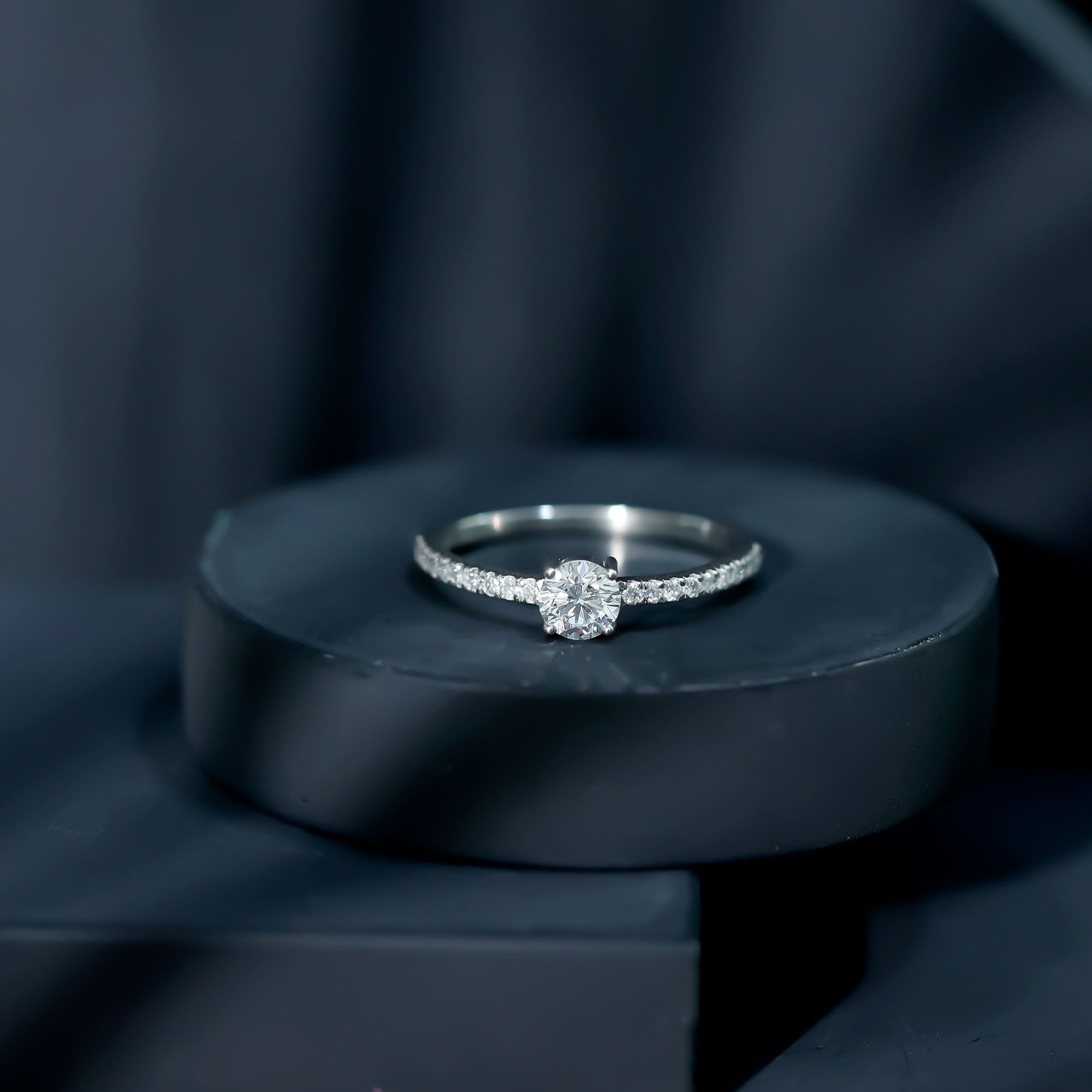 A solitaire ring highlights a single center gemstone, while side stones add subtle decorative detail along the band. This combination enhances the presence of the center stone while maintaining a balanced structure.