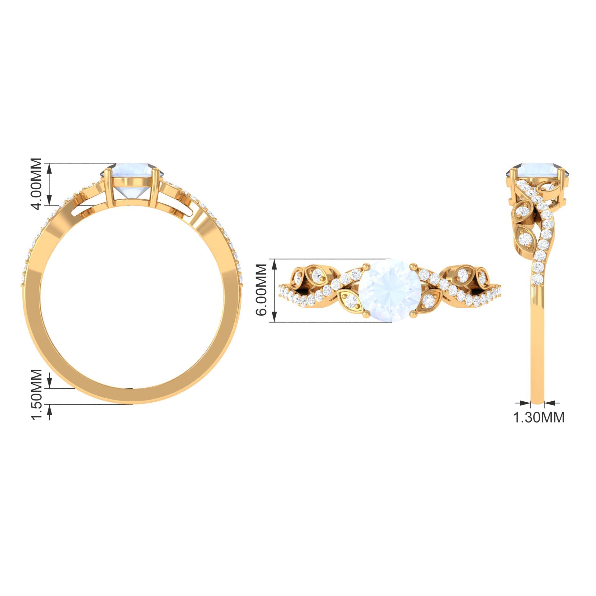 This designer engagement ring exudes luxury and style with its dazzling Round Shape Moonstone at the center, capturing attention with its bold and fiery light blue hue. The shank of the ring is decorated with stunning Diamond stones, adding extra sparkle and glamour. Crafted with a meticulous attention to detail, this Moonstone engagement ring is designed to impress with its perfect balance of sophistication and contemporary flair. The Round Shape Moonstone is held in a secure prong setting that ensures its lasting beauty, making it a perfect choice for a bride who seeks a ring that is both unique and timeless.