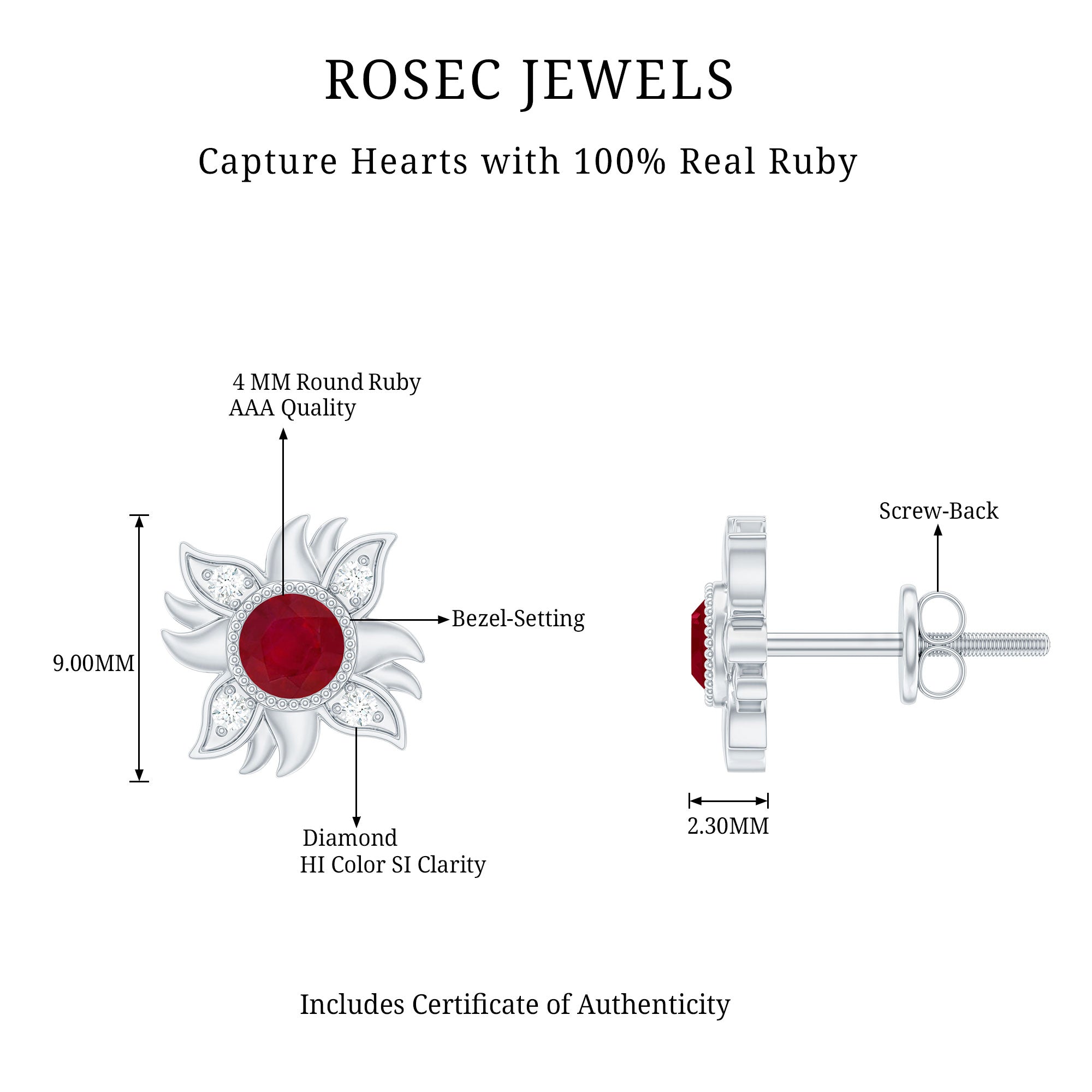 Round Shape Ruby and Diamond Sunburst Stud Earrings