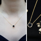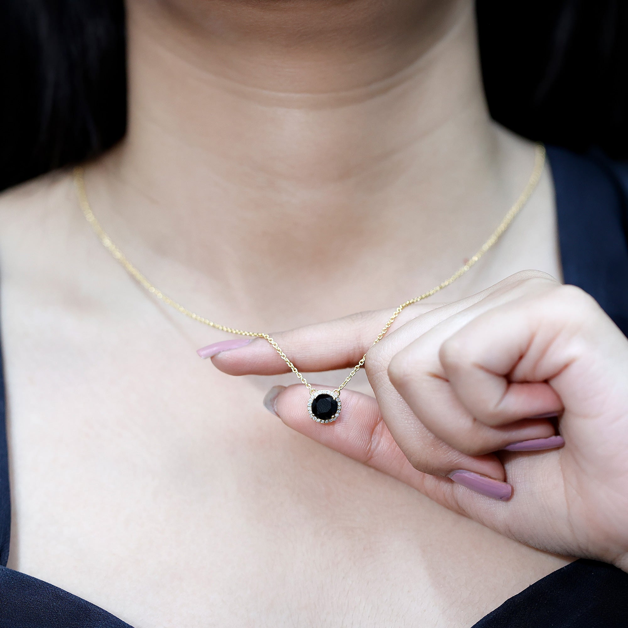 Add a touch of bold elegance to your jewelry collection with this stunning Black Diamond Necklace. Crafted in 14K yellow gold plated silver, this piece showcases a striking 8 MM round black diamond set securely in claw setting. Surrounding the center stone is a delicate halo of round brilliant cut lab grown white diamonds. The Round Pendant hangs gracefully from a polished chain, allowing it to catch the light with every movement. This creates a subtle shimmer that makes it perfect for both everyday wear and special occasions. The thoughtful design highlights the contrast between the deep black center stone and the bright surrounding diamonds, offering a sophisticated yet modern look. The decorative bail, also adorned with small lab grown white diamonds, adds an extra detail of refinement, making this Halo Pendant Necklace a truly eye-catching piece. Its versatile design means you can wear it alone for a simple statement or layer it with other necklaces to create your own unique style. This Black and White Diamond Necklace is more than just jewelry, it is a piece that reflects your style and spirit.