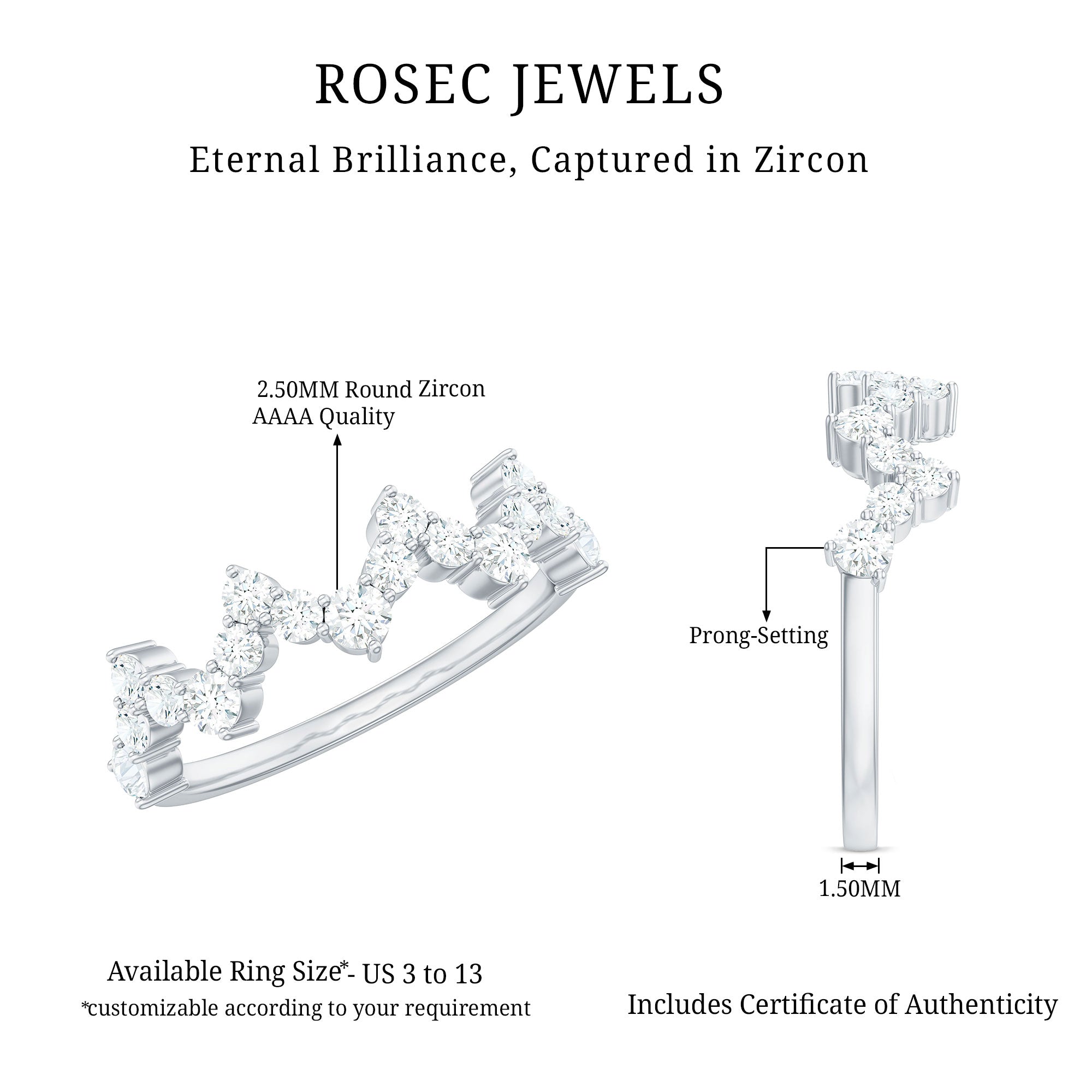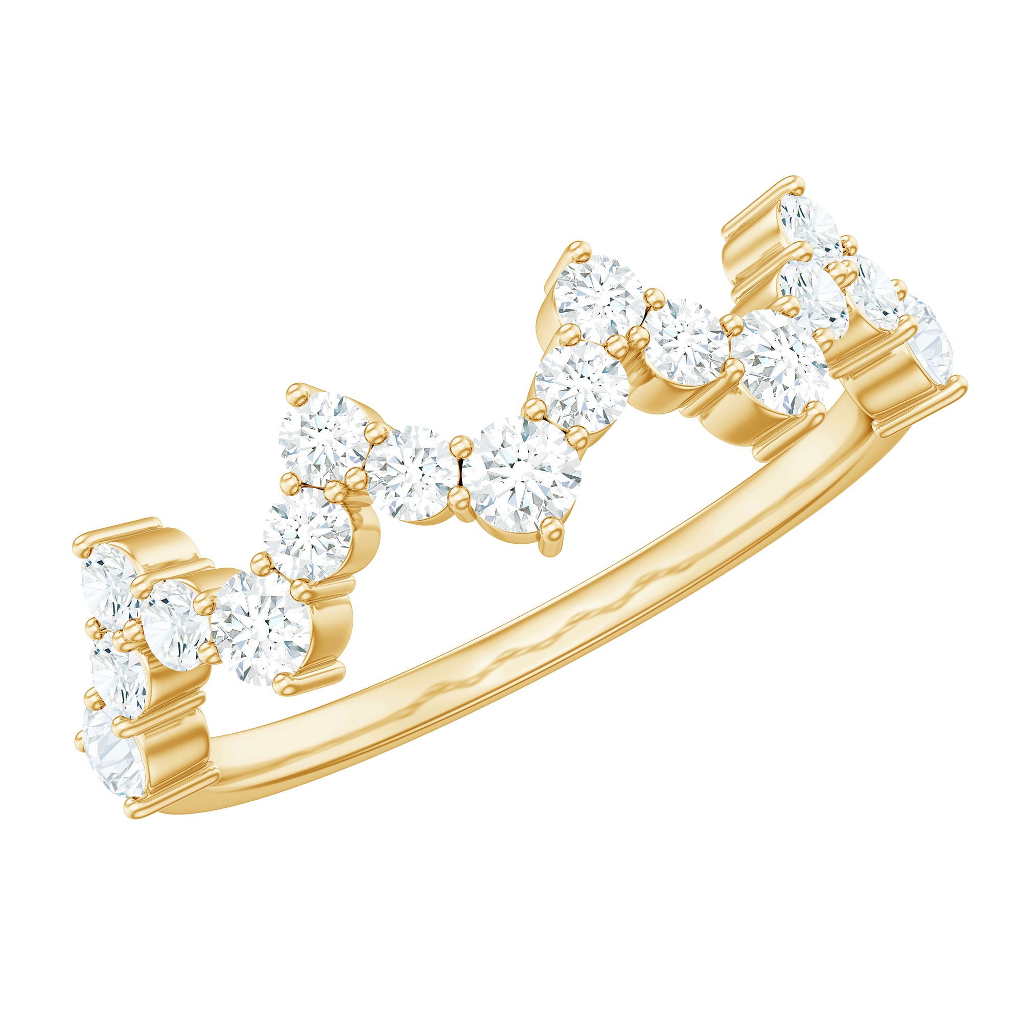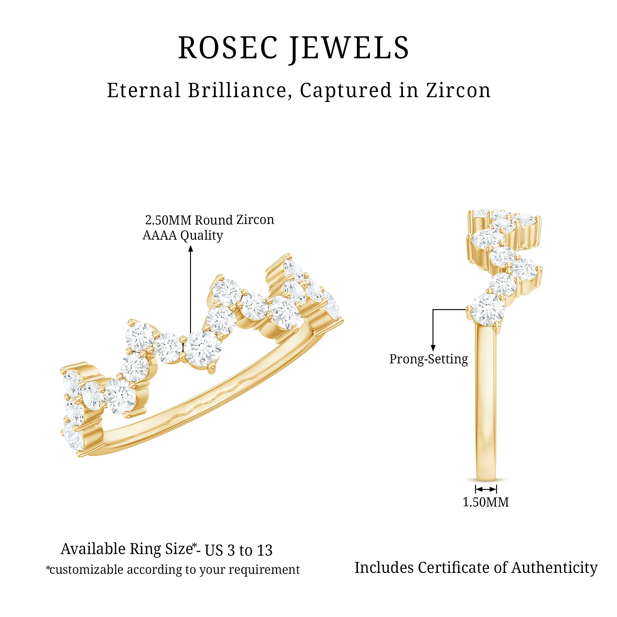 This Zig Zag Half Eternity Ring is a unique and beautiful piece of jewelry that is perfect for those who love to make a statement with their accessories. The ring features a sleek gold band with a prong setting that holds round simulated diamonds arranged in a stunning zig zag pattern. The zircons run halfway around the band, adding just the right amount of sparkle and shine.