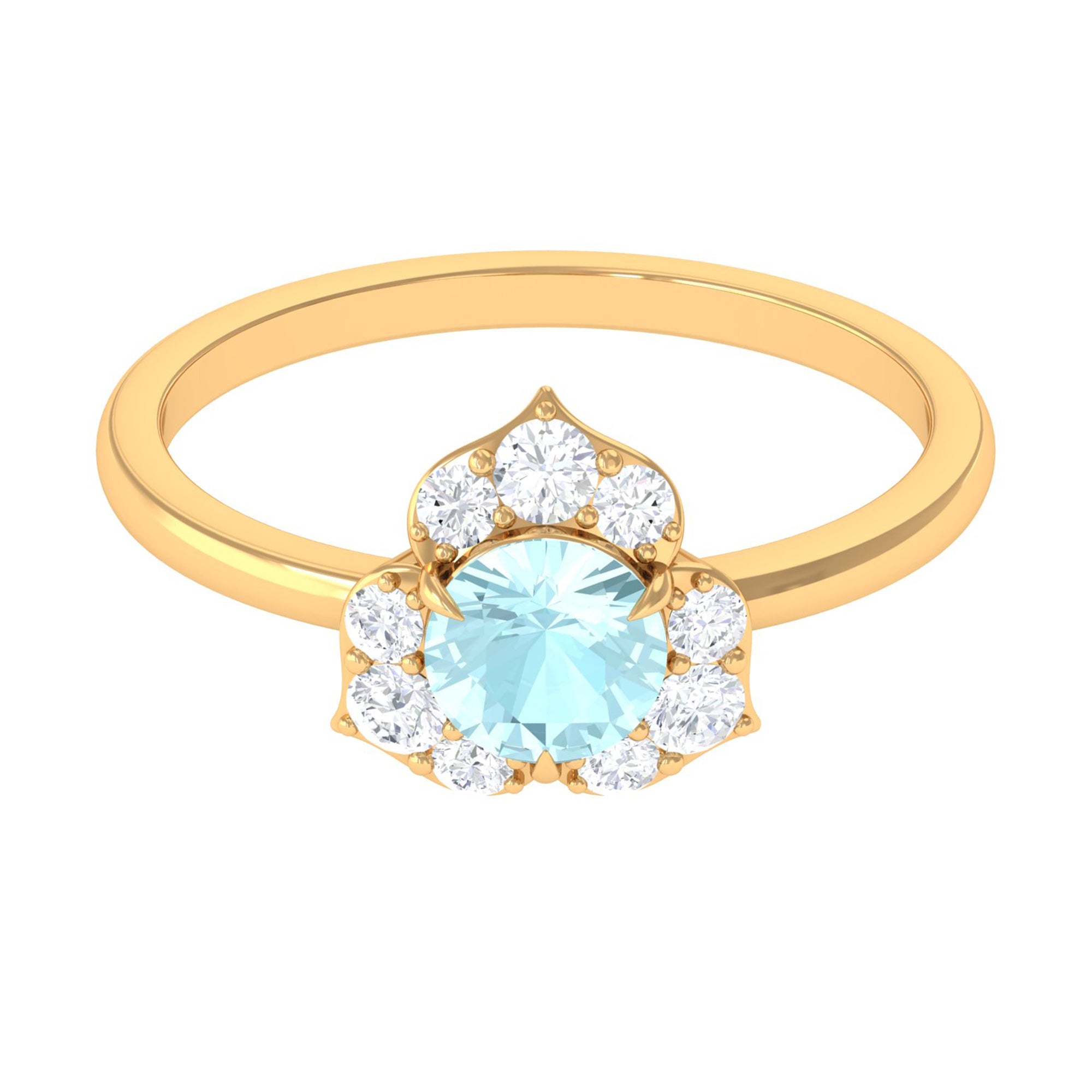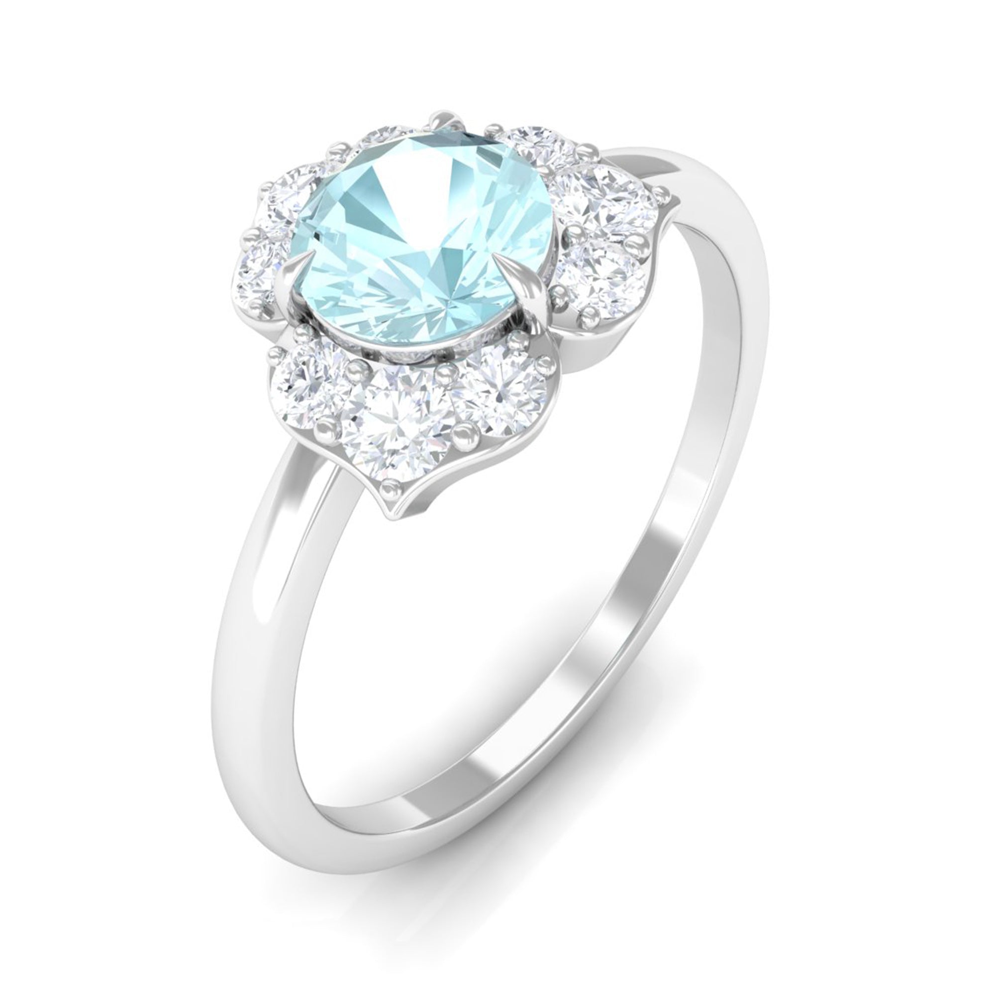 Indulge in the enchanting beauty of our Round Sky Blue Topaz Flower Ring with Diamond Accent. The centerpiece, a brilliant round Sky Blue Topaz, captures the essence of a clear, blue sky. Surrounding it, delicate petals formed by Diamond stones add a touch of floral grace and eternal sparkle. Meticulously designed, this ring combines the serenity of the Sky Blue Topaz with the brilliance of Diamond, creating a harmonious and captivating composition. The floral motif symbolizes growth and the enduring beauty of your love. Let this exquisite ring be a radiant expression of your unique bond, where the natural allure of the Sky Blue Topaz meets the timeless sparkle of Diamond in a beautiful floral arrangement.