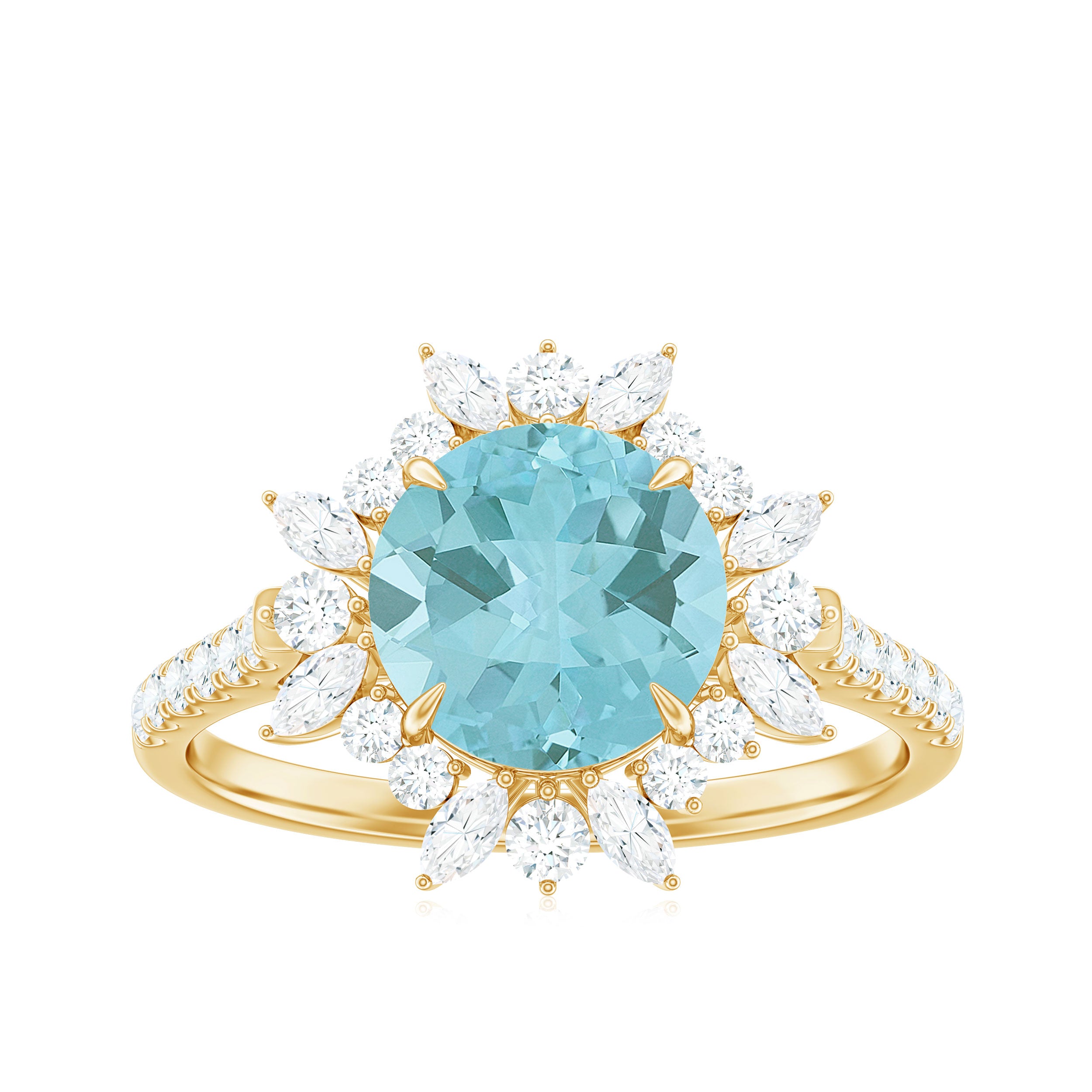 Make a bold fashion statement with this stunning Sky Blue Topaz Cocktail Ring, adorned with a shimmering Round Shape Sky Blue Topaz, as well as Marquise and Round Shape Moissanite stones in a Claw Setting. The intricate Floral design of this Engagement Ring exudes elegance and sophistication, and it is expertly crafted from Solid Gold. This one-of-a-kind piece is the perfect addition to any jewelry collection and is sure to complement any style.