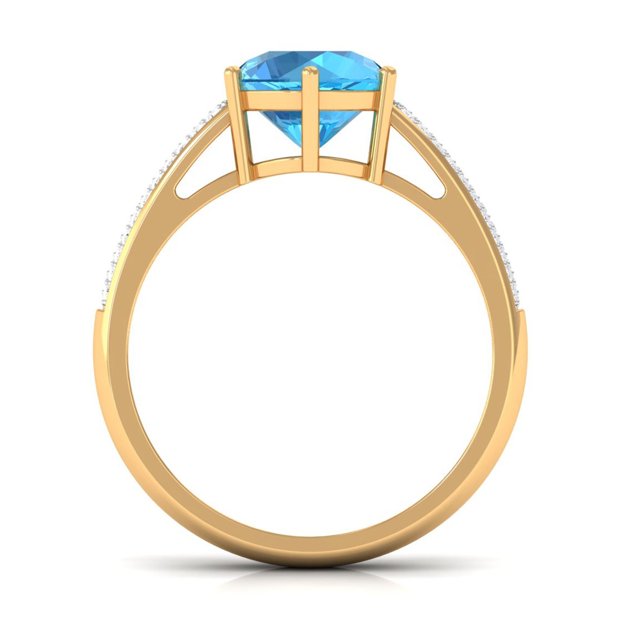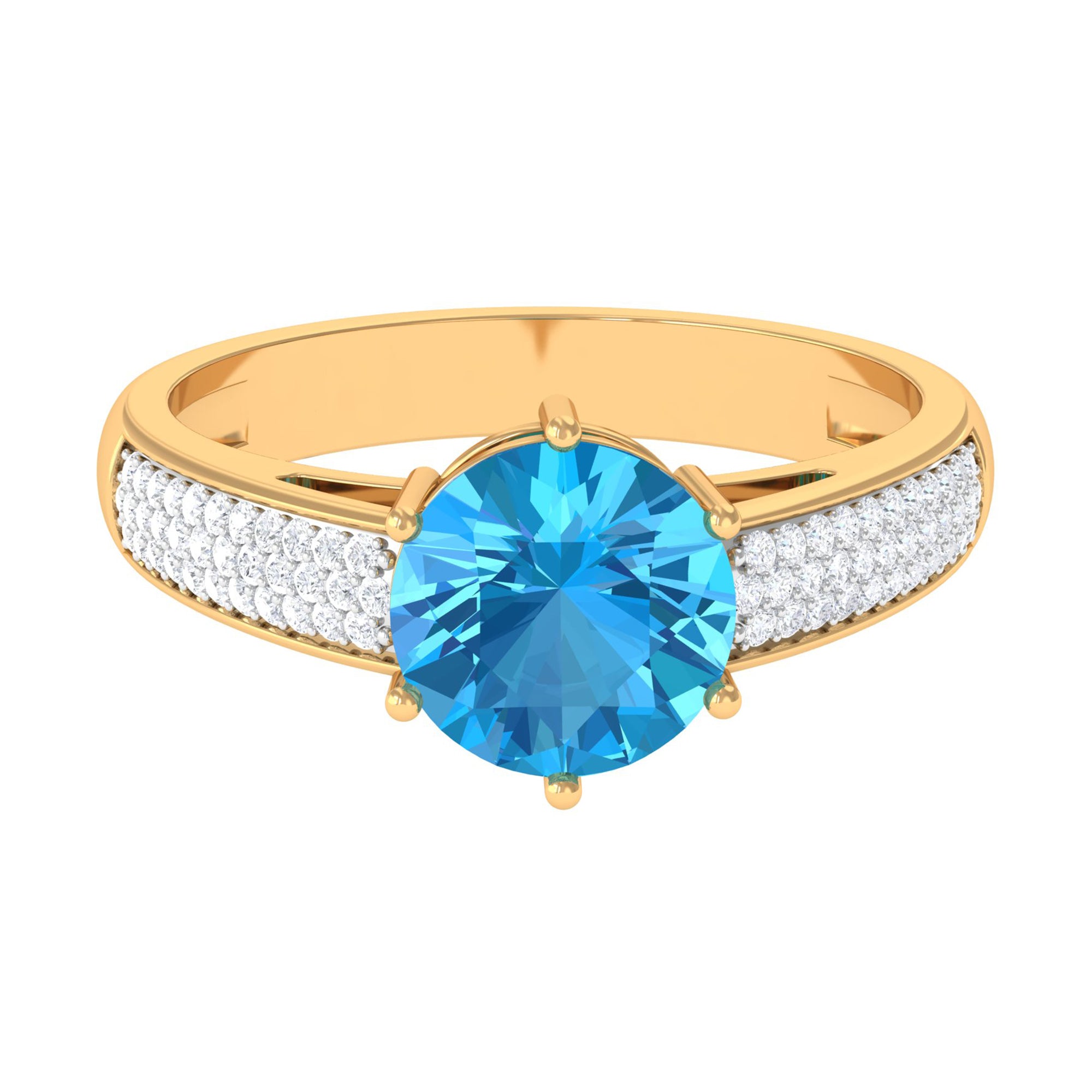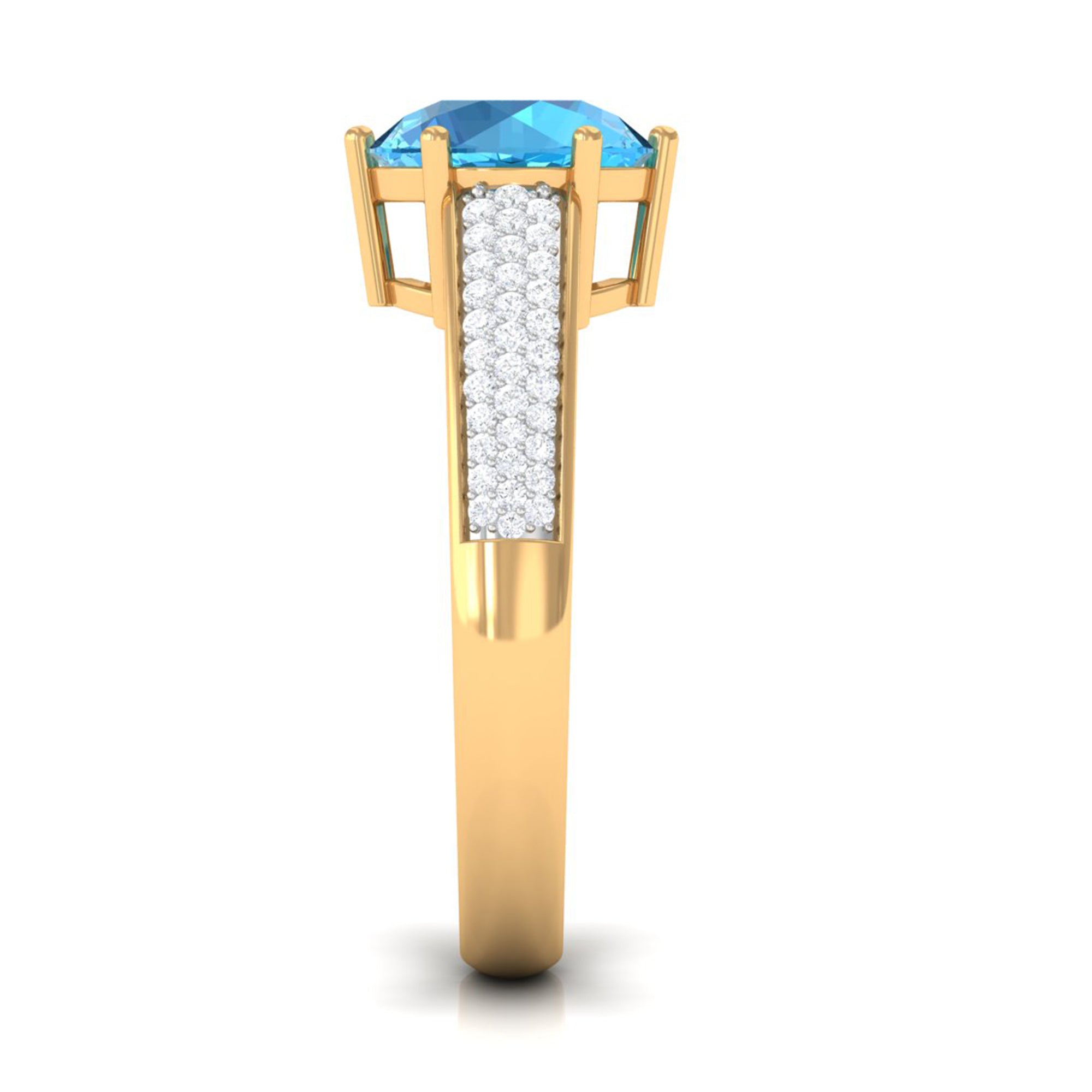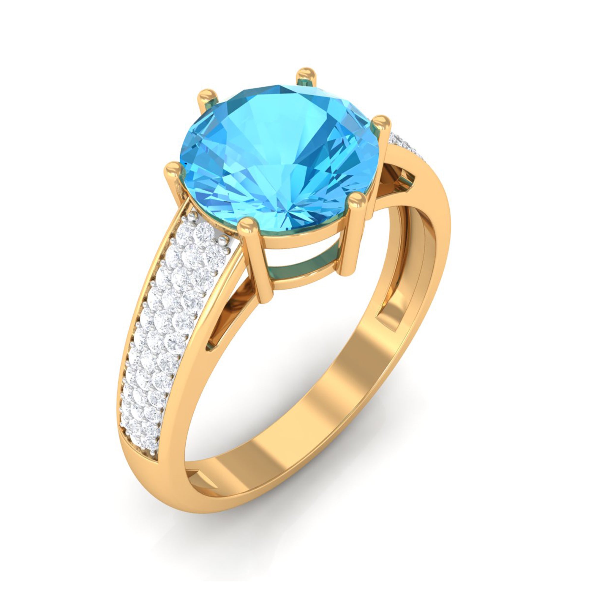 Wow your fiancé with this beautiful solitaire engagement ring. This ring features a Round Shape Swiss Blue Topaz set in a prong setting with Round Shape Diamond gems as side stones, all crafted in gold. A timeless and charming piece of jewelry, perfect for that special day.