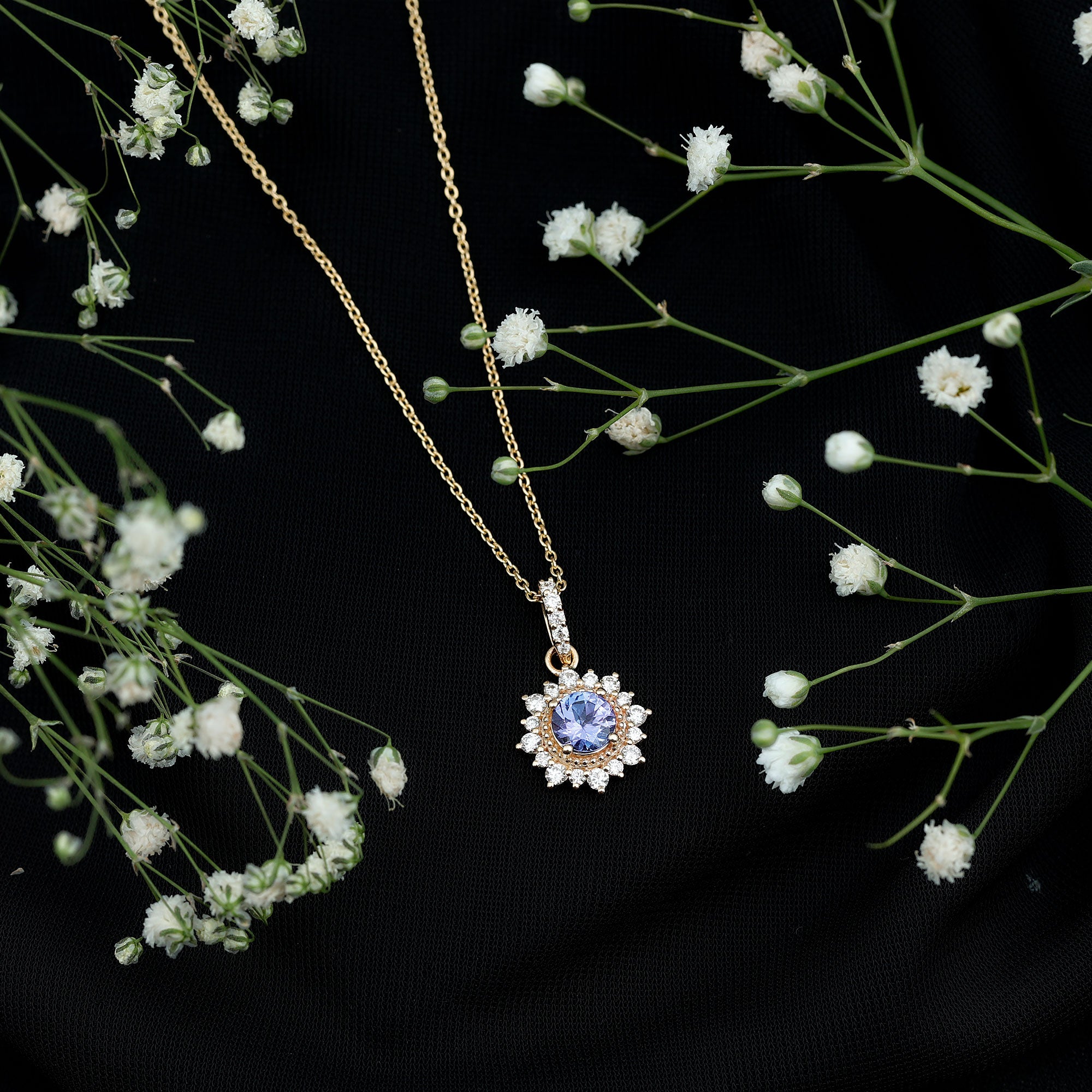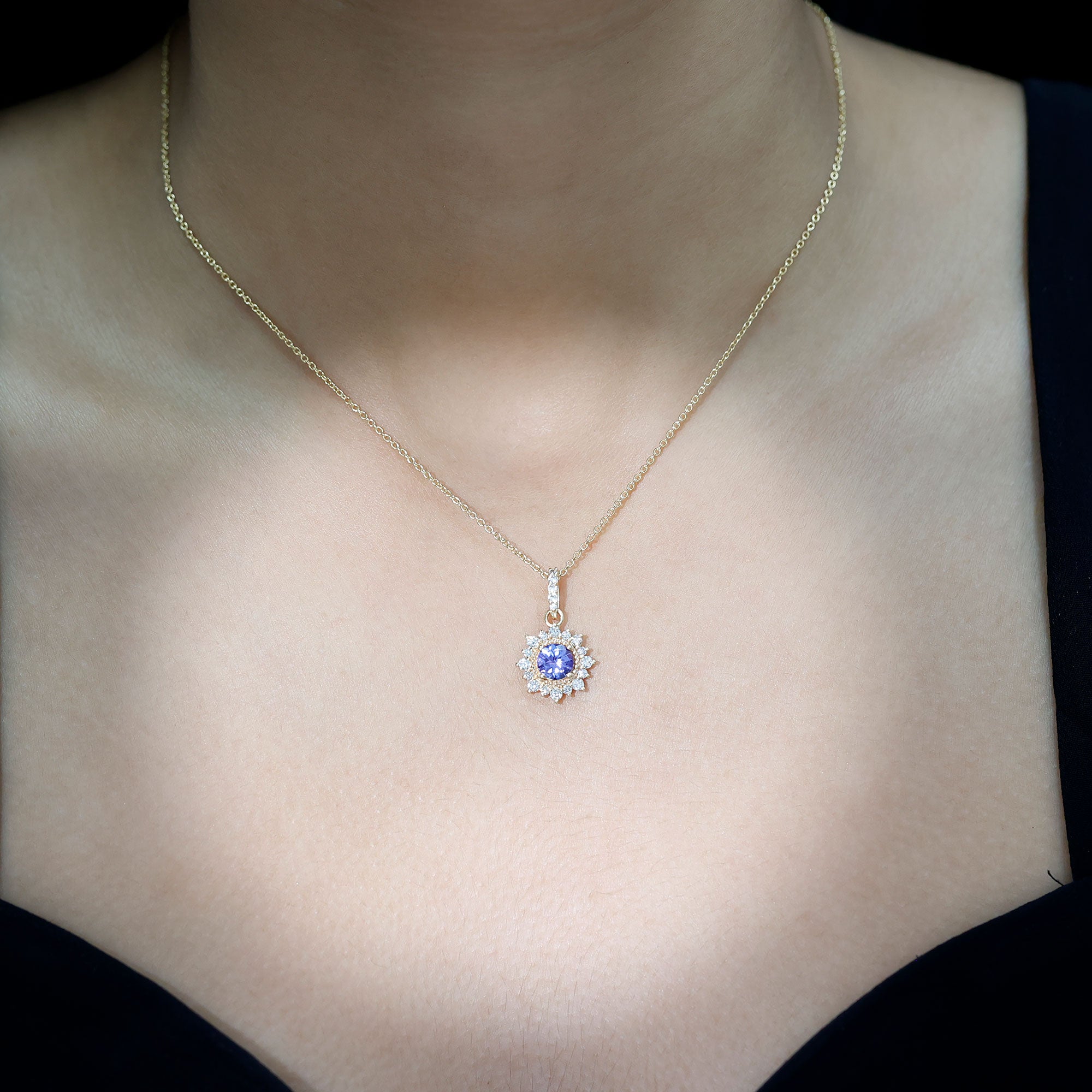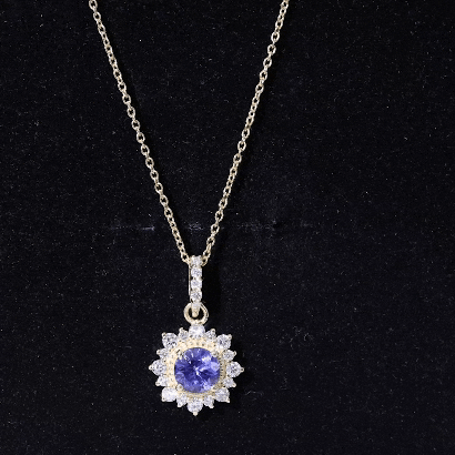 If youre searching for the perfect jewelry to wear on an evening date with your partner, look no further than this Tanzanite Pendant. Featuring a 6 MM Round Shape Tanzanite in a Prong Setting, with Gold Beaded Details and a Round Diamond Halo, this pendant necklace is simply stunning. The subtle yet elegant design will garner compliments when you wear it. With a total weight of 1.75 Carats and AAA Quality, this pendant is made with high-quality certified gemstones that undergo strict quality checks.