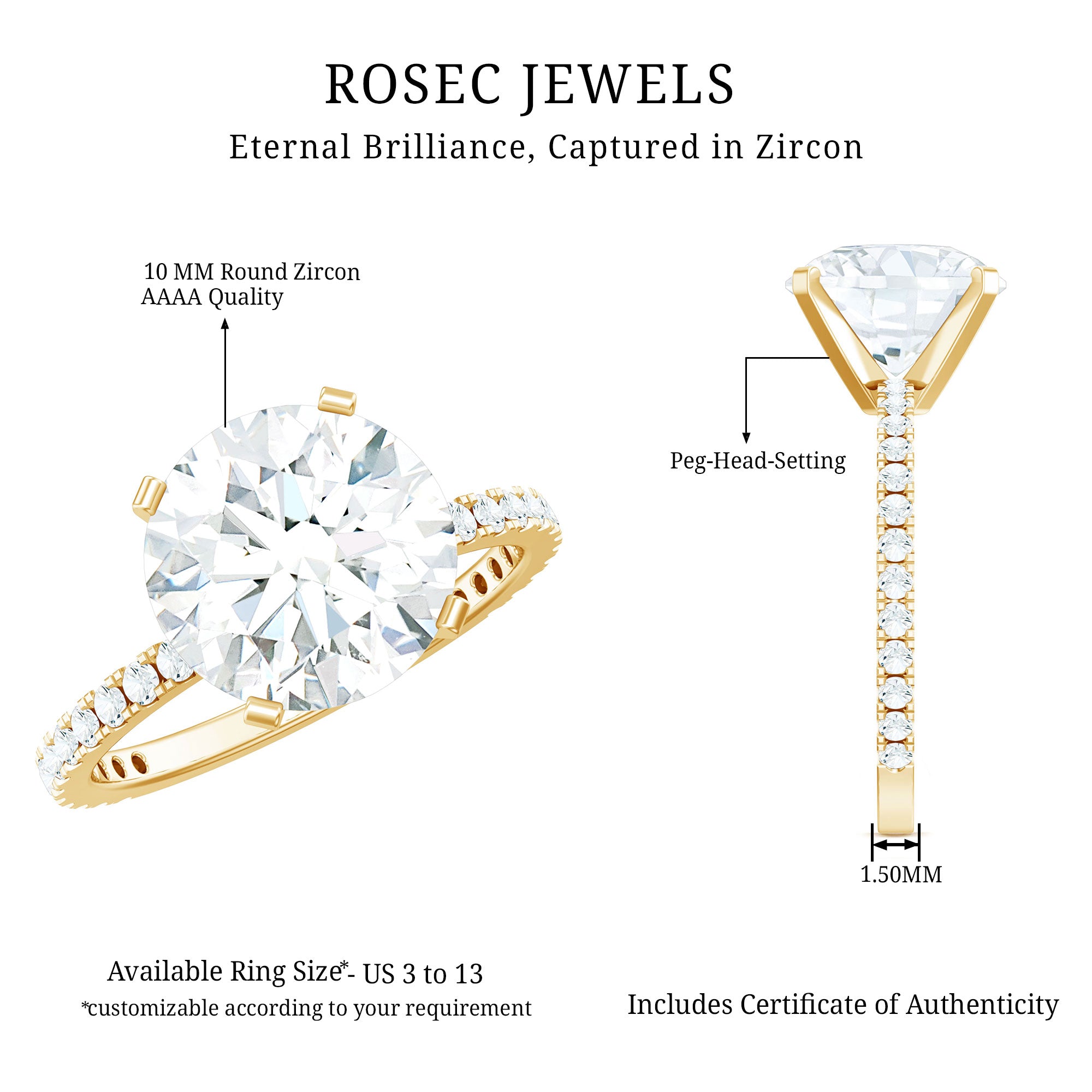 Indulge in the allure of timeless beauty with our Solitaire Engagement Ring, a true masterpiece that captures the essence of everlasting love. This exquisite ring boasts a brilliant Round Shape Zircon gemstone, elegantly set in a Peg Head Setting as a solitaire, and adorned by glistening Side Stones that enhance its radiance. Its the ideal selection for those in search of an engagement ring that seamlessly blends tradition and modern elegance, crafting a love story that sparkles with brilliance for generations to come.