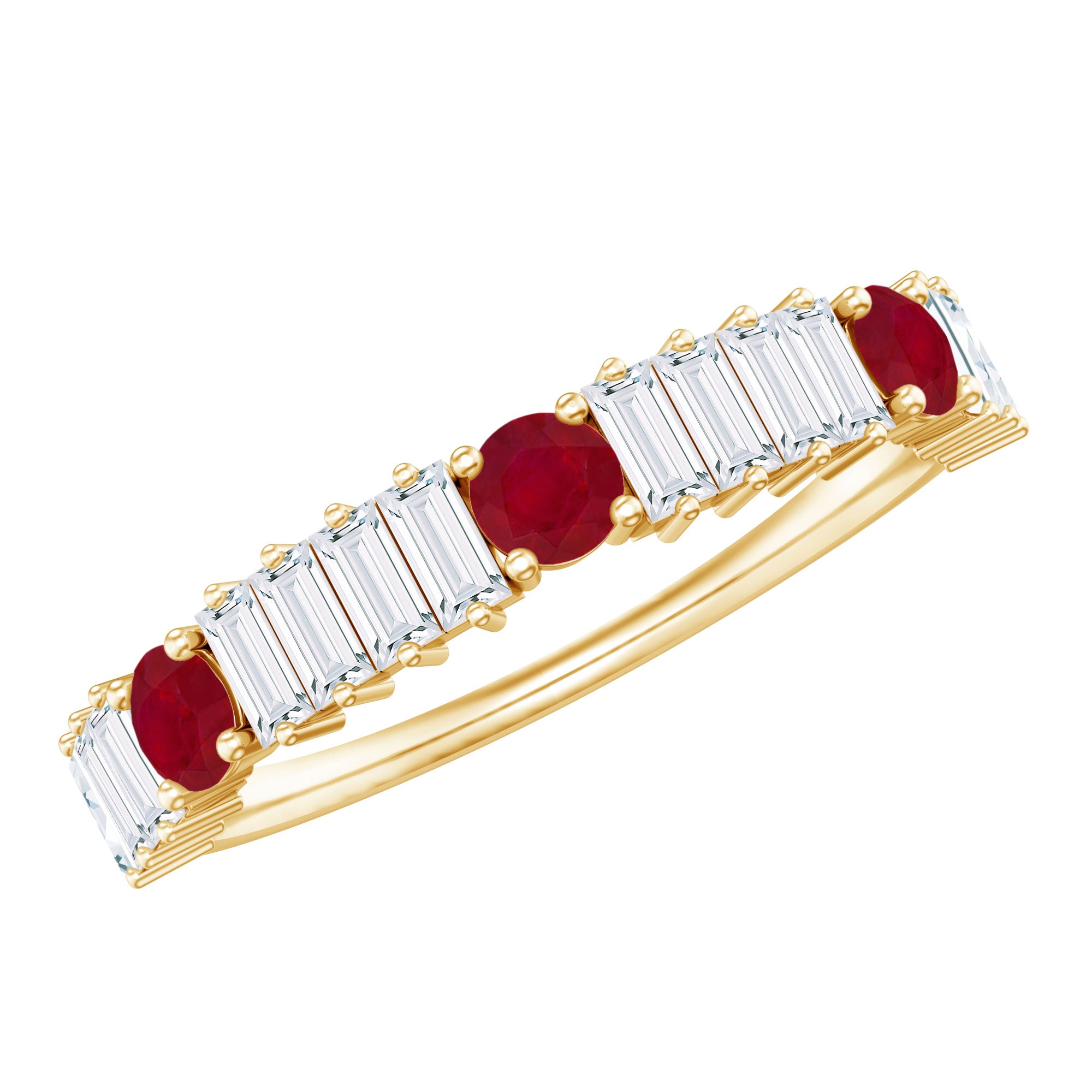 Go beyond the ordinary to express your love with this Ruby Half Eternity Ring! Adorning the band partially are the scintillating stones of Round Shape Ruby and Diamond that are Prong set in an alternating pattern to effortlessly contrast each other. Meant for the modern diva, this Certified Ruby Semi Eternity Ring oozes sheer romance.