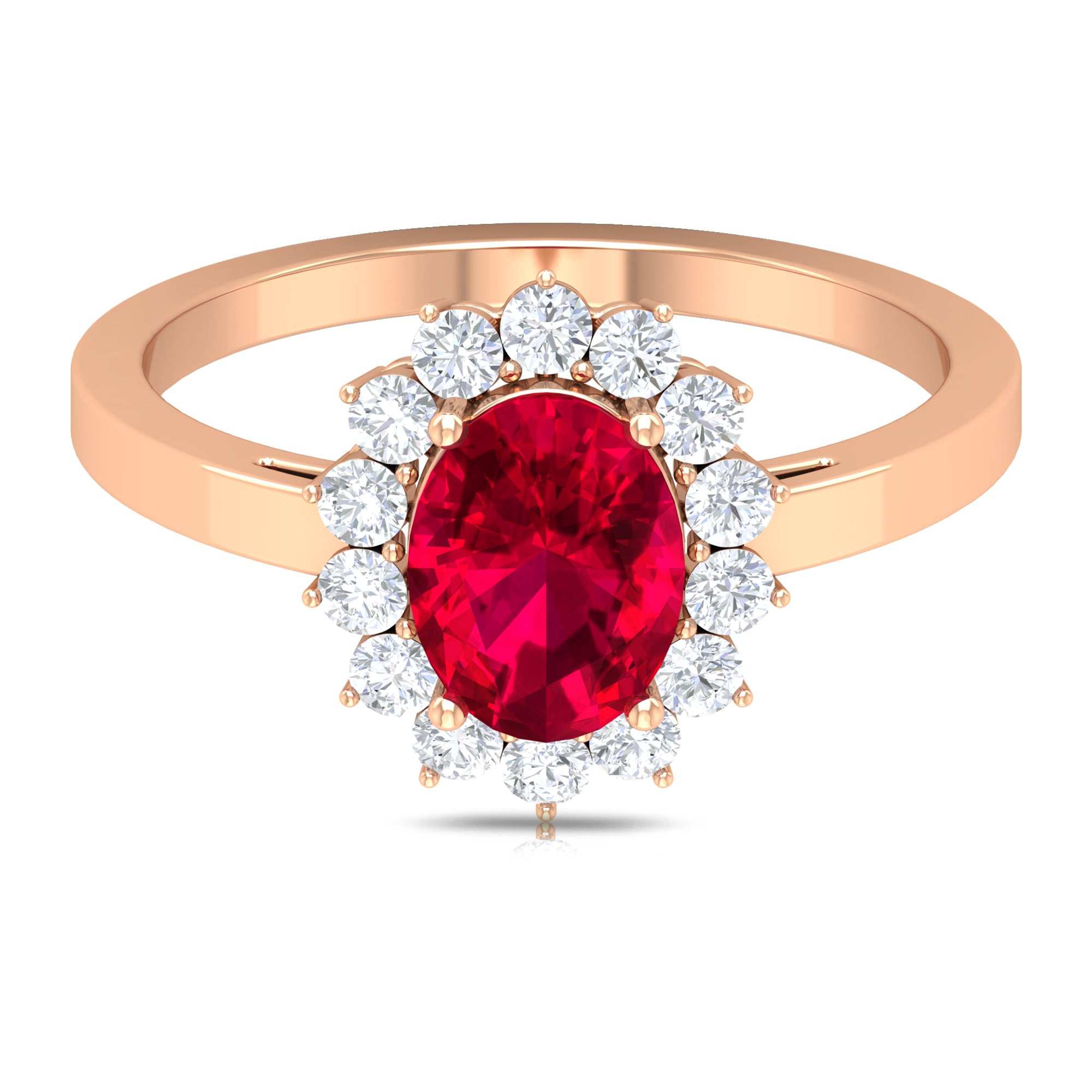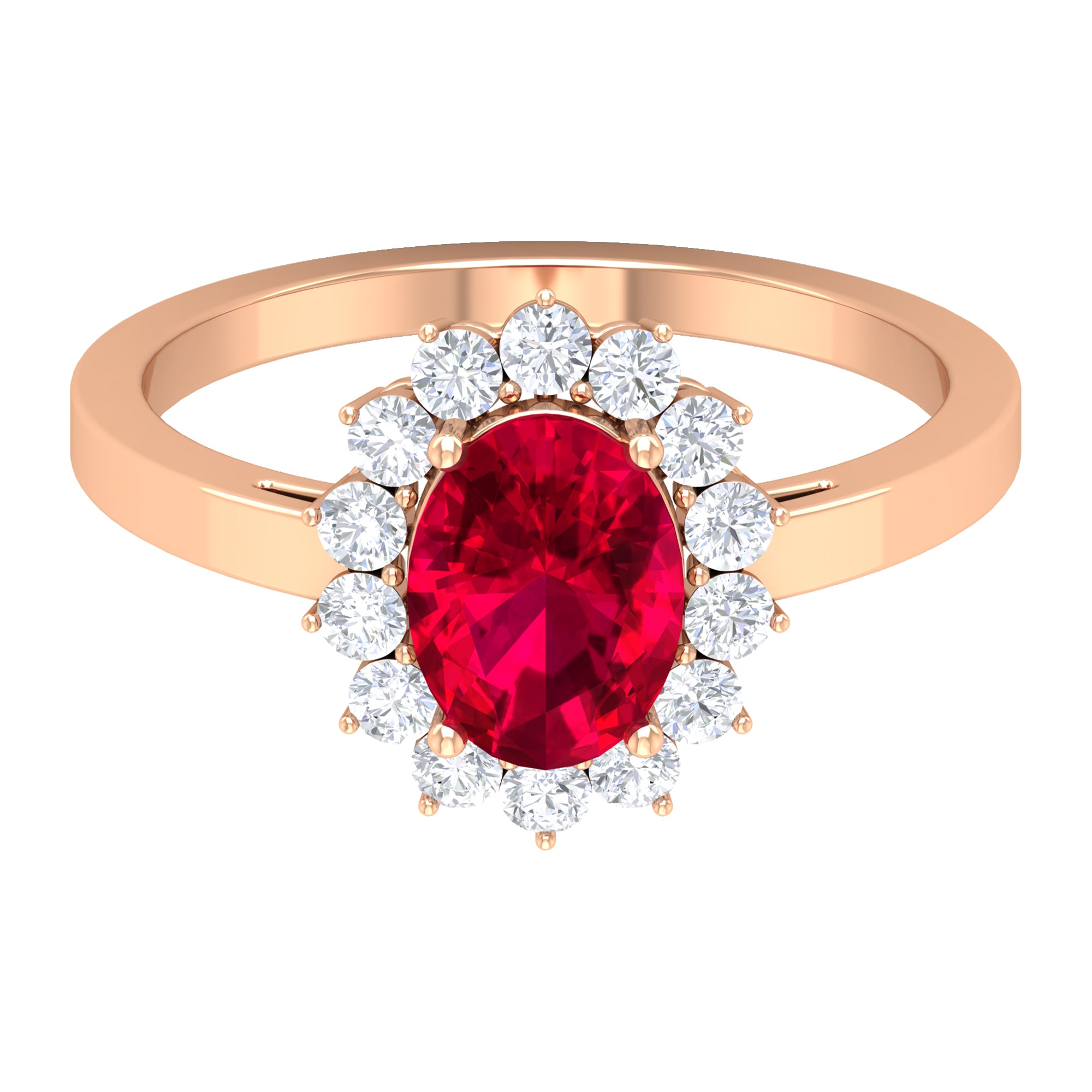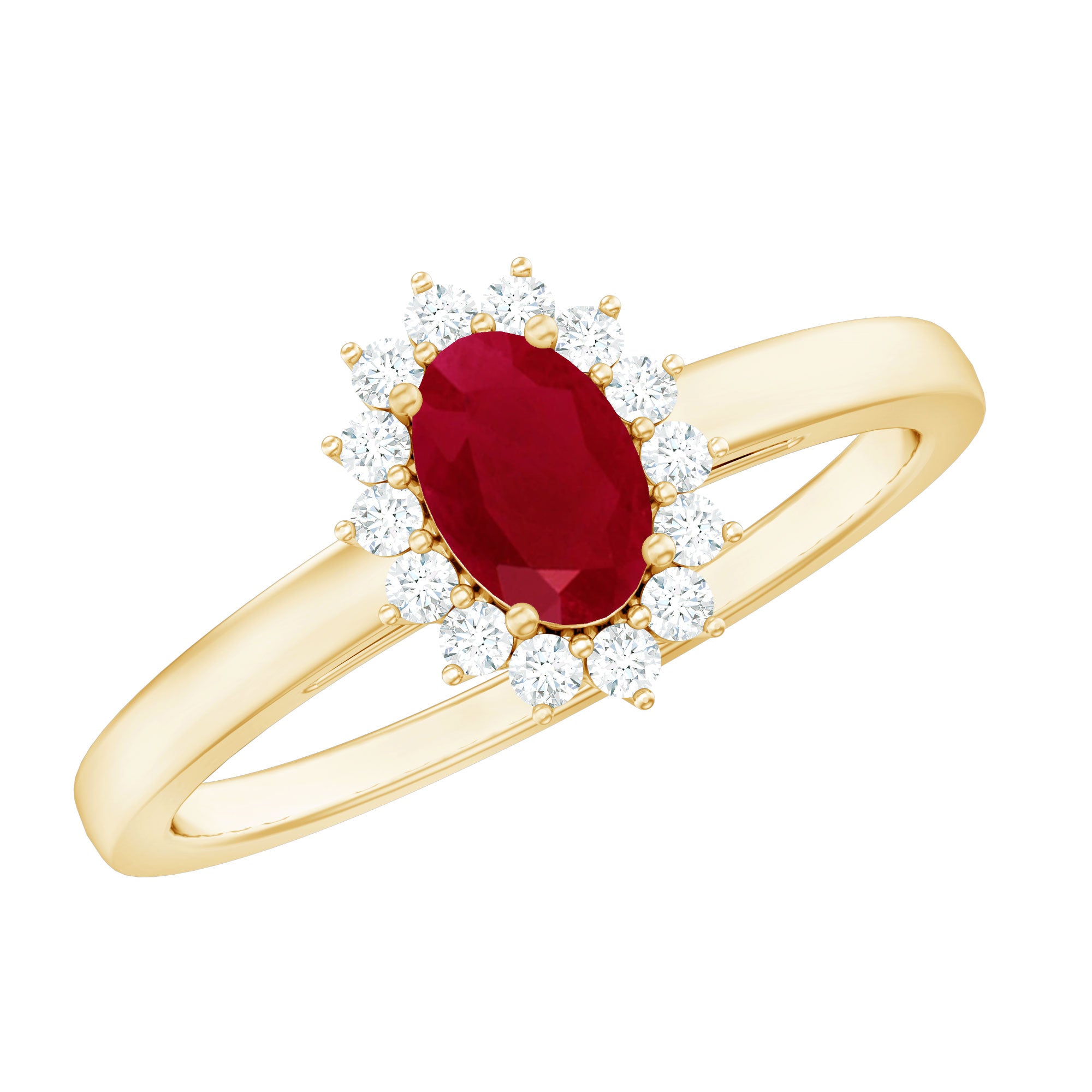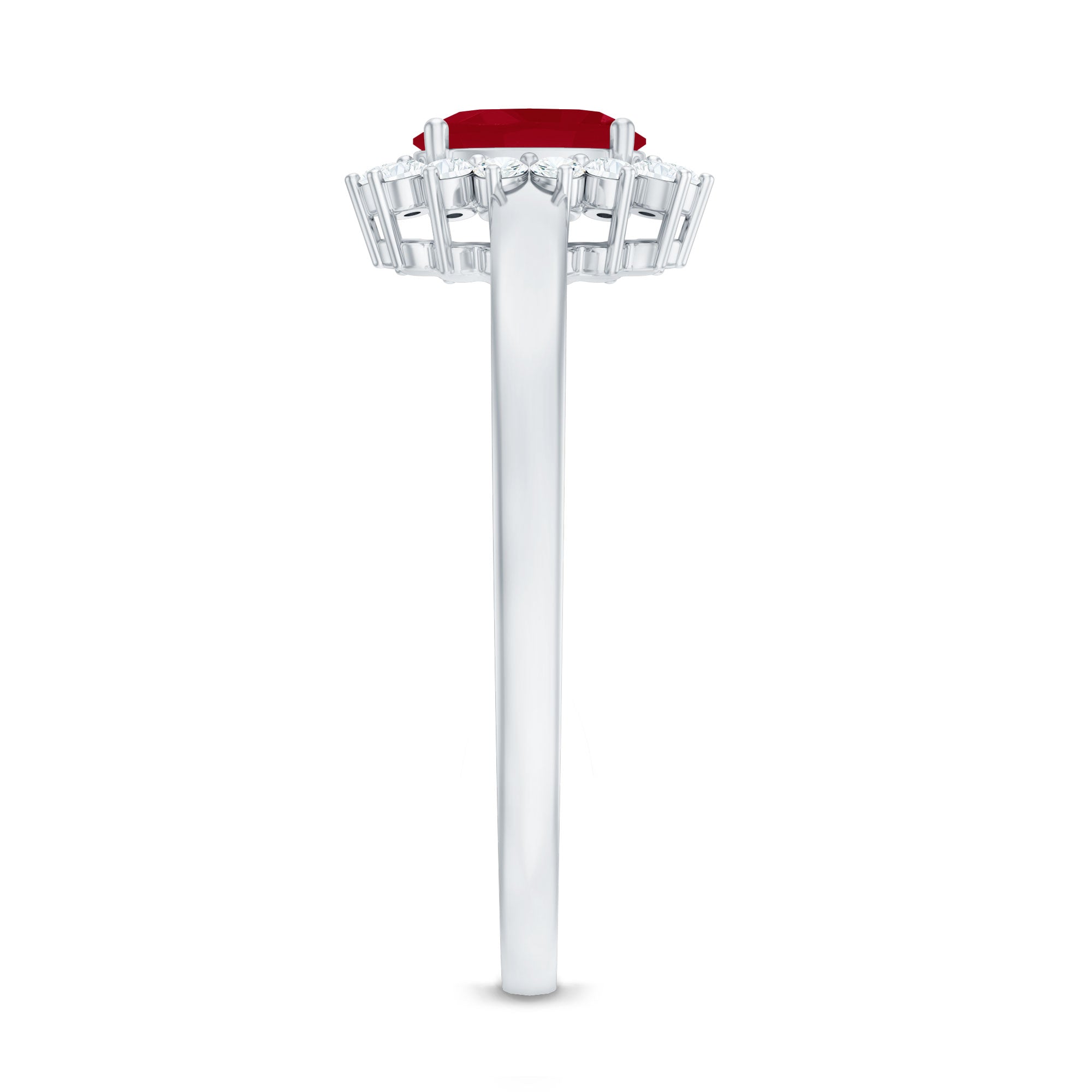 A Simply amazing and Classic Engagement Ring embellished with Oval Cut Ruby is studded as Solitaire with Round Shape Diamond Studded Beautifully as Sunburst in Prong Setting.