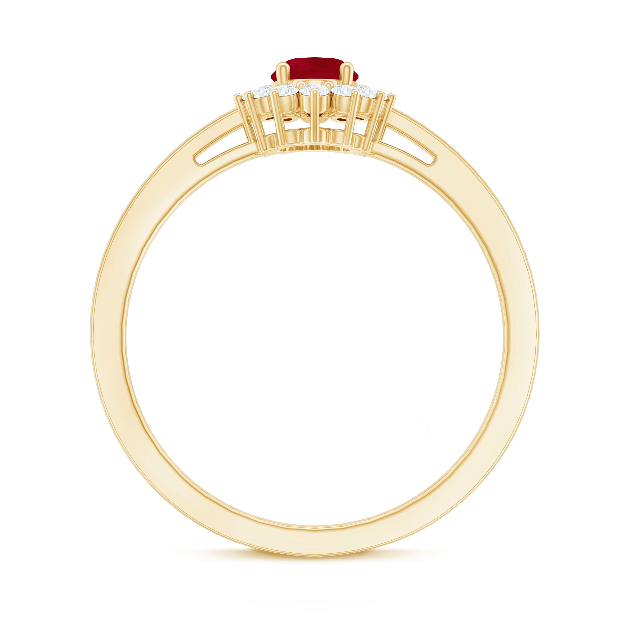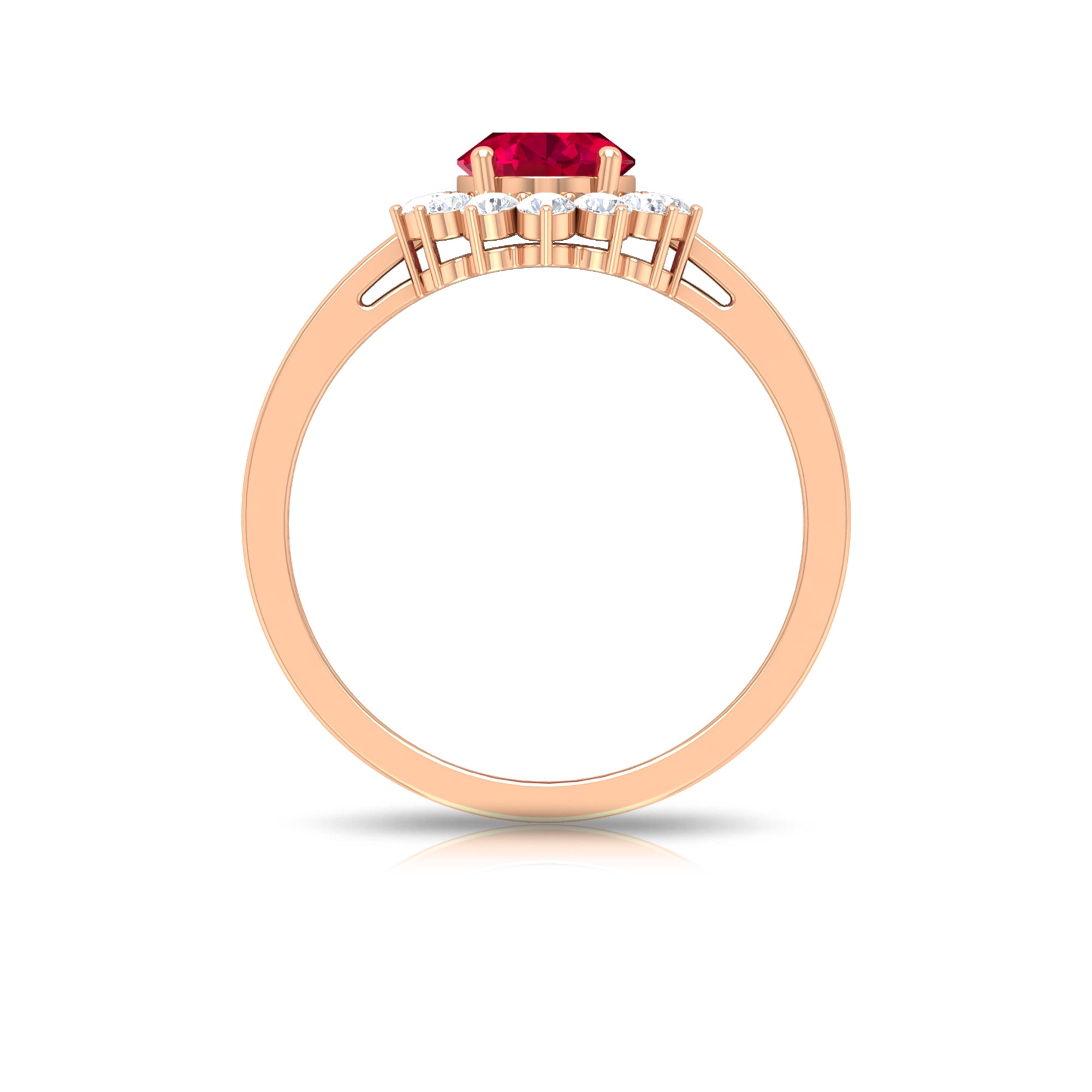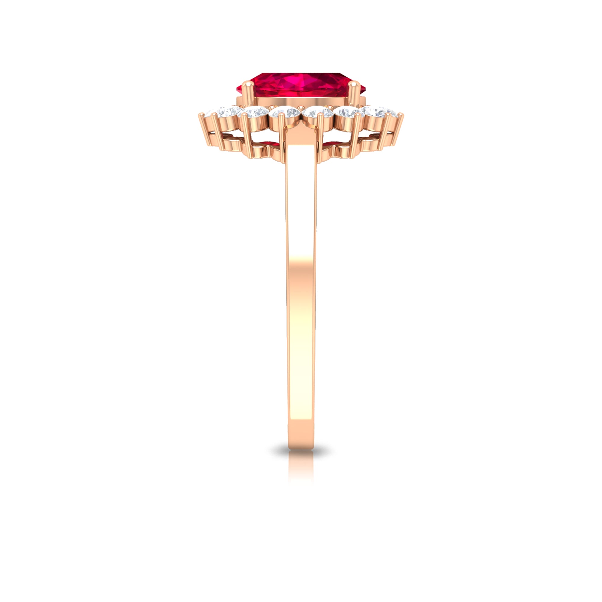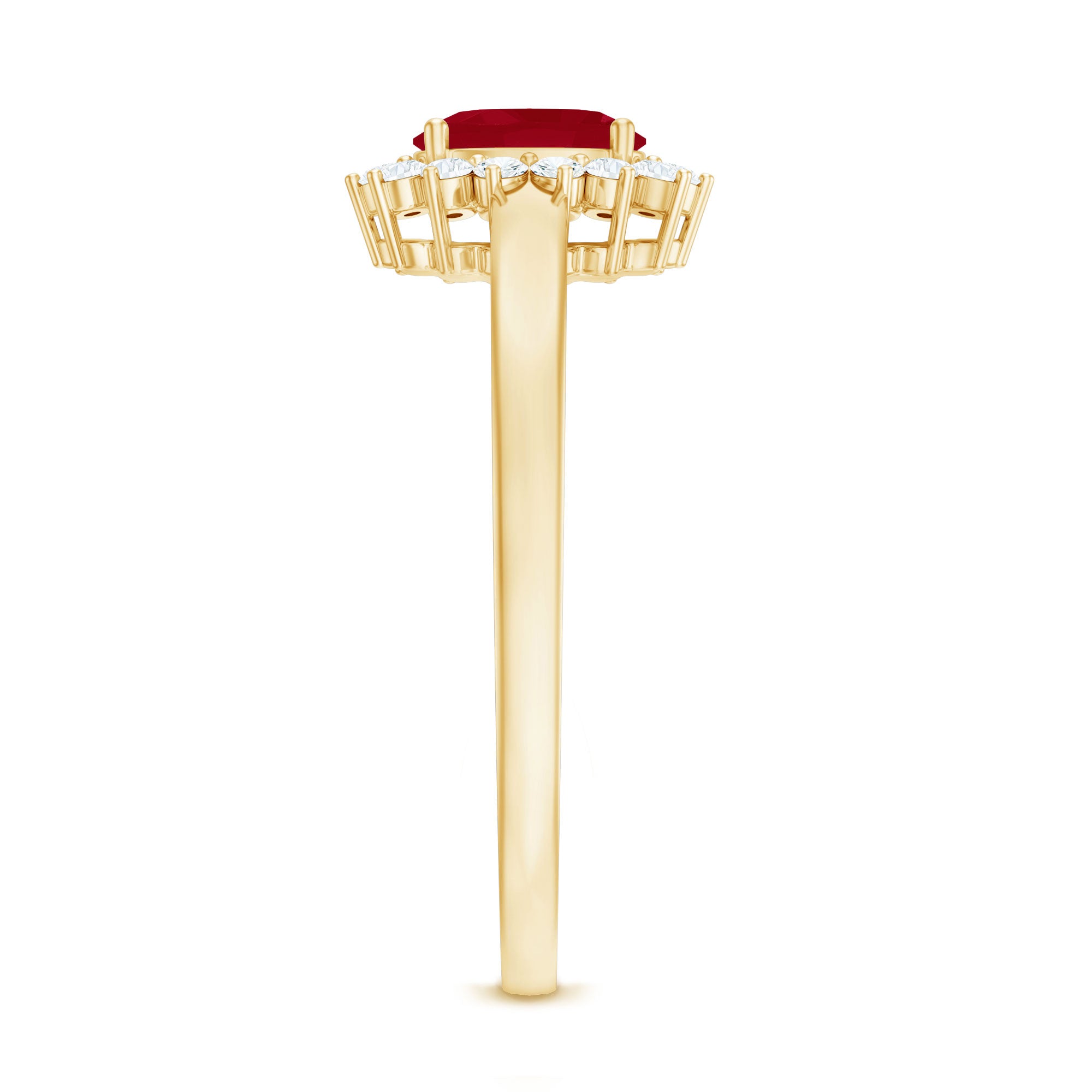 A Simply amazing and Classic Engagement Ring embellished with Oval Cut Ruby is studded as Solitaire with Round Shape Diamond Studded Beautifully as Sunburst in Prong Setting.