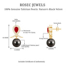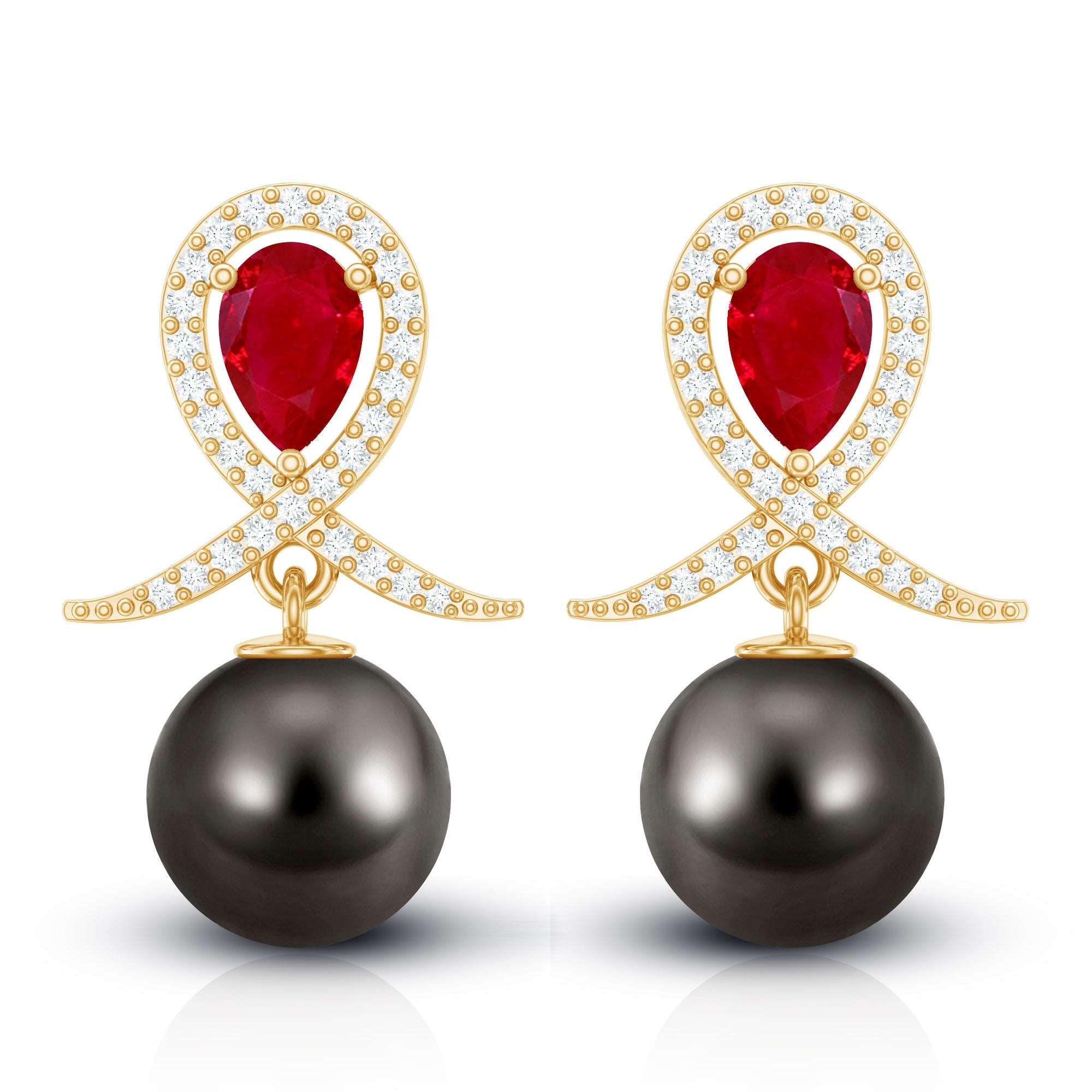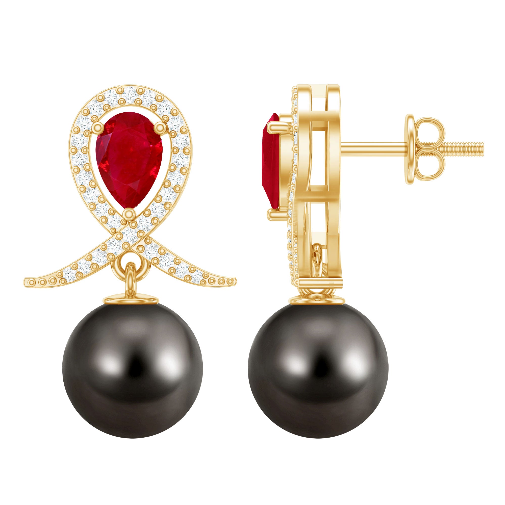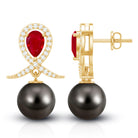 These Classic Teardrop Earrings have been embellished with Pear Shape Ruby Gemstone set at the center in a Prong Setting encircle with small Round Shape Moissanite stones from which Tahitian Pearl is hanged, crafted in Gold.