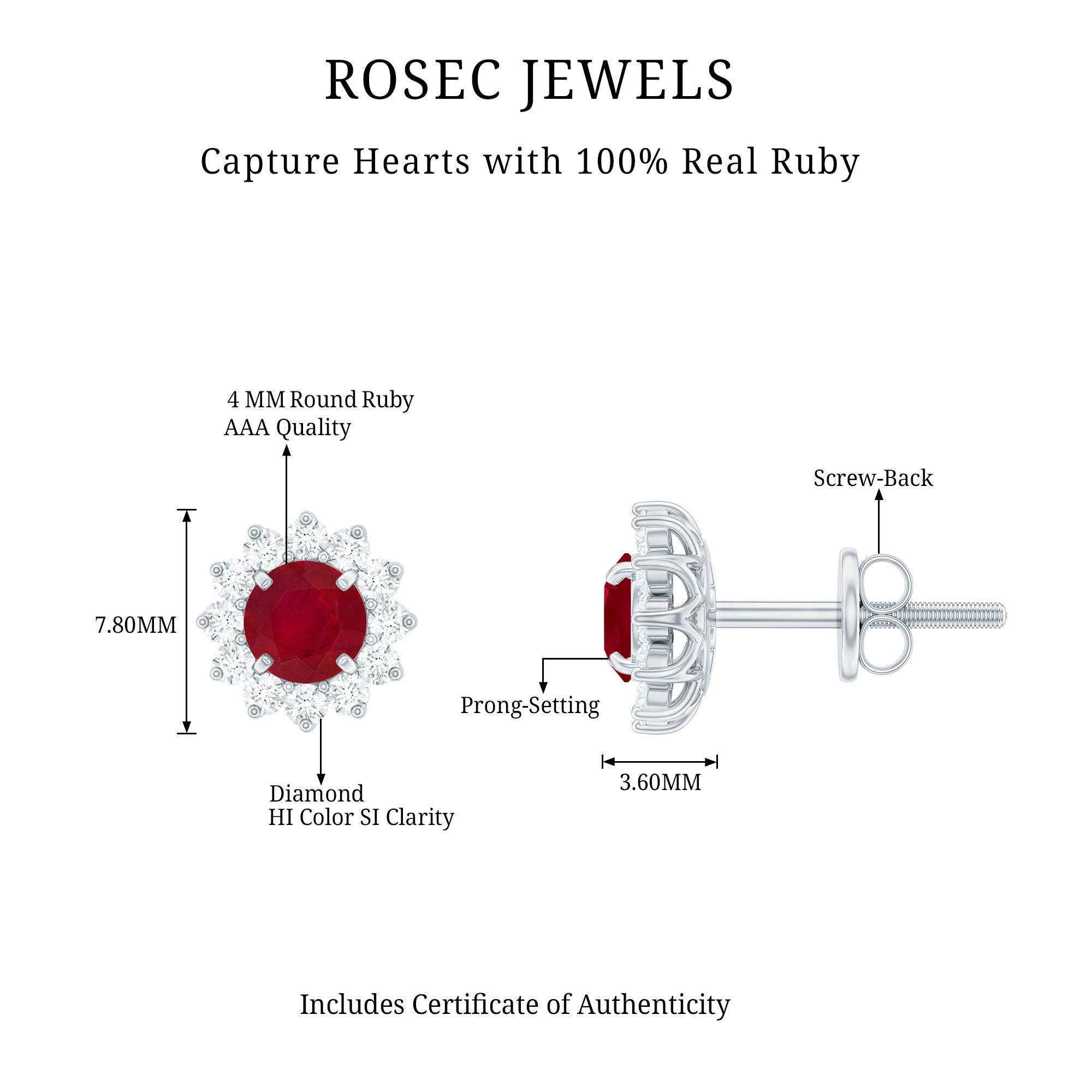 Elevate your everyday style with a touch of elegance by adorning these exquisite Flower Stud Earrings. The center of attention is the round-cut ruby, delicately set in a prong setting, exuding its vibrant allure. Surrounding the ruby is a dazzling halo of round-cut Diamond stones, adding a radiant sparkle to the floral design. These Ruby Floral Earrings showcase both luxury and durability. For added convenience and security, they are equipped with a screw-back closure. Embrace the beauty of these earrings and let them be the perfect accessory to enhance your everyday outfits with grace and sophistication.