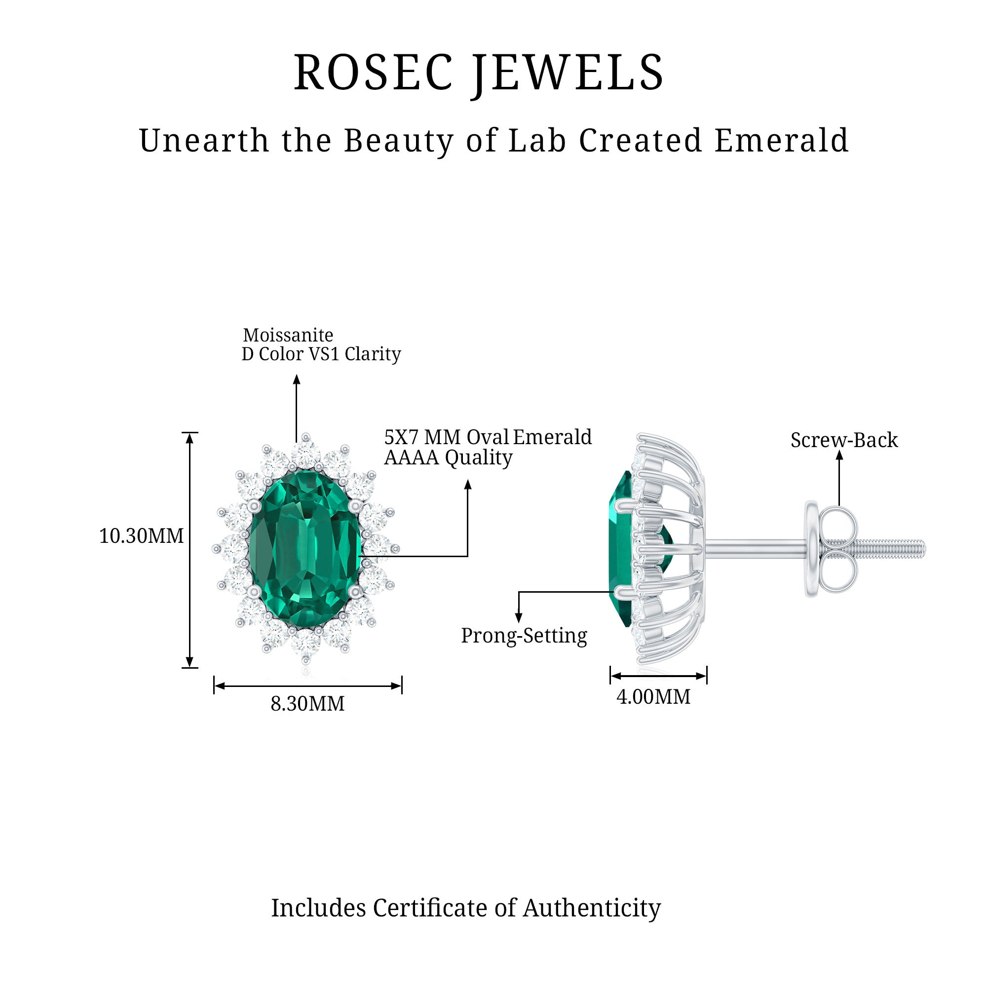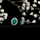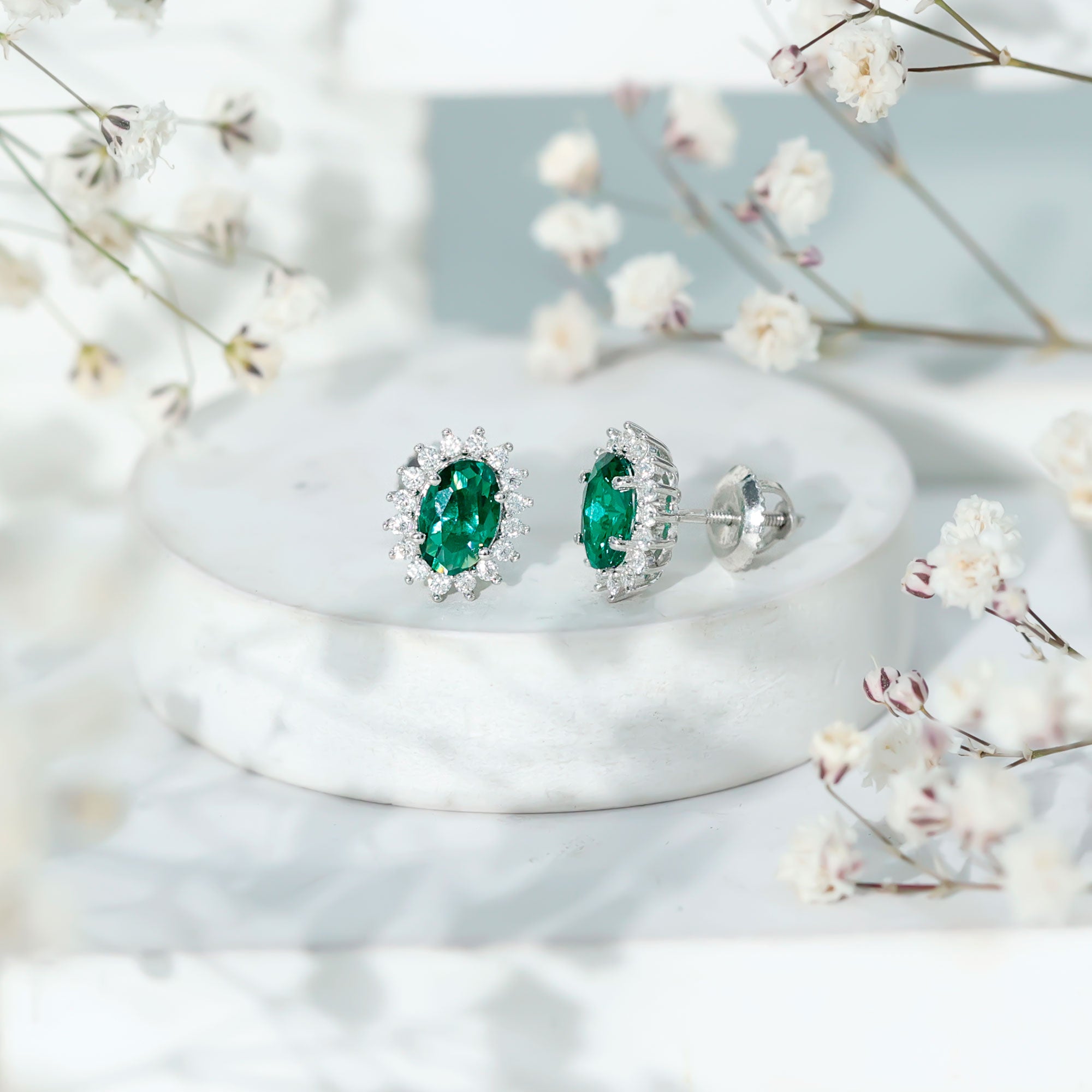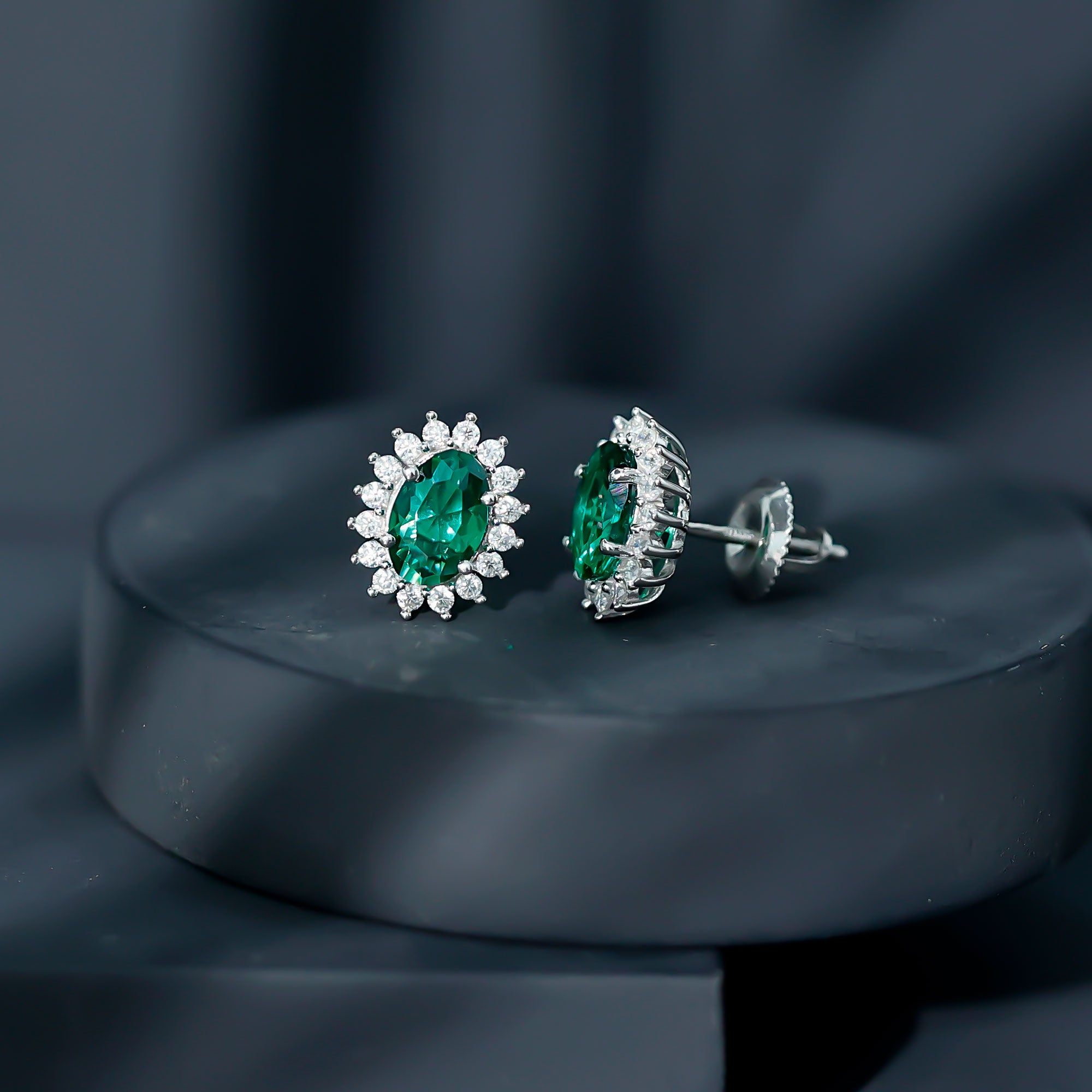 These Emerald and Moissanite Earrings are uniquely beautiful, featuring a classic charm and a striking look. Made from 14k white gold plated silver, these Halo Earrings showcase a 5X7 MM oval lab-created emerald set in prongs, surrounded by a halo of round brilliant cut Moissanite. The Lab Grown Emerald Stud Earrings stand out with their unique and unconventional design. They bring a touch of elegance and a splash of color to any outfit. With these dazzling Screw Back Earrings, you will turn heads and make hearts skip a beat. Show off your individuality and make a bold fashion statement with these stunning Halo Studs, which are sure to attract attention with their bright appeal or be appreciated for their unique beauty. The striking simplicity of these timeless earrings is free of unnecessary embellishments, making them a refined choice for brides-to-be who wish to carry themselves with grace.