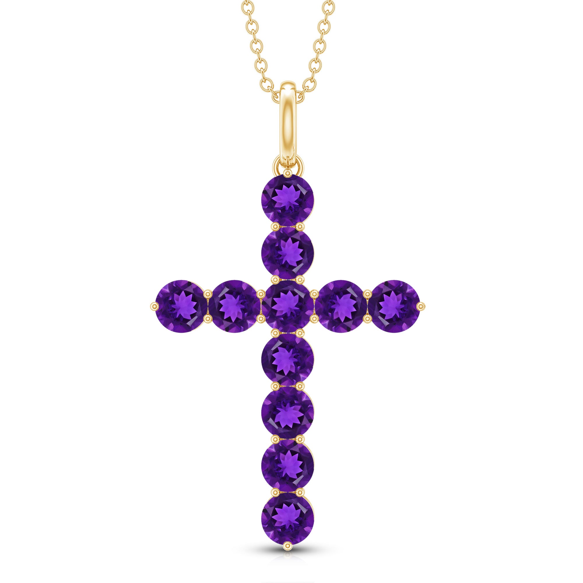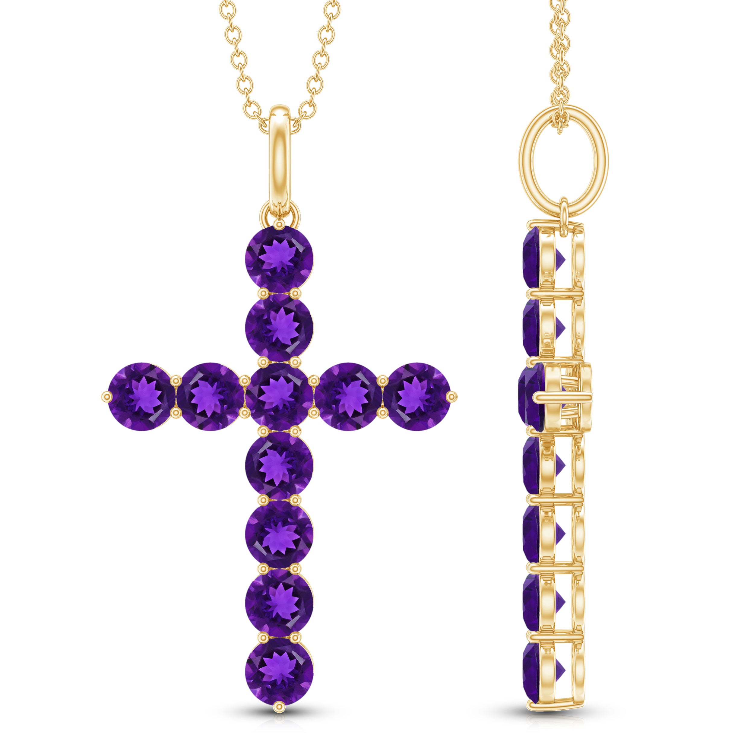 Make a statement of faith and devotion with this simple yet elegant Cross Pendant decorated with Round Shape Amethyst gemstones set in Prong Setting.