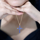 Embrace the beauty of faith and elegance with this breathtaking cross pendant necklace. Crafted with meticulous attention to detail, it highlights a created blue sapphire gemstone radiating a captivating blue hue. The gemstone is lovingly nestled within a cross-shaped frame, symbolizing timeless devotion. Whether worn as a religious symbol or as a cherished piece of jewelry, this necklace effortlessly combines spirituality and style. Enhancing any ensemble with its subtle yet striking presence is a testament to both faith and fashion.