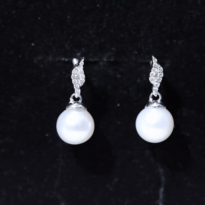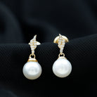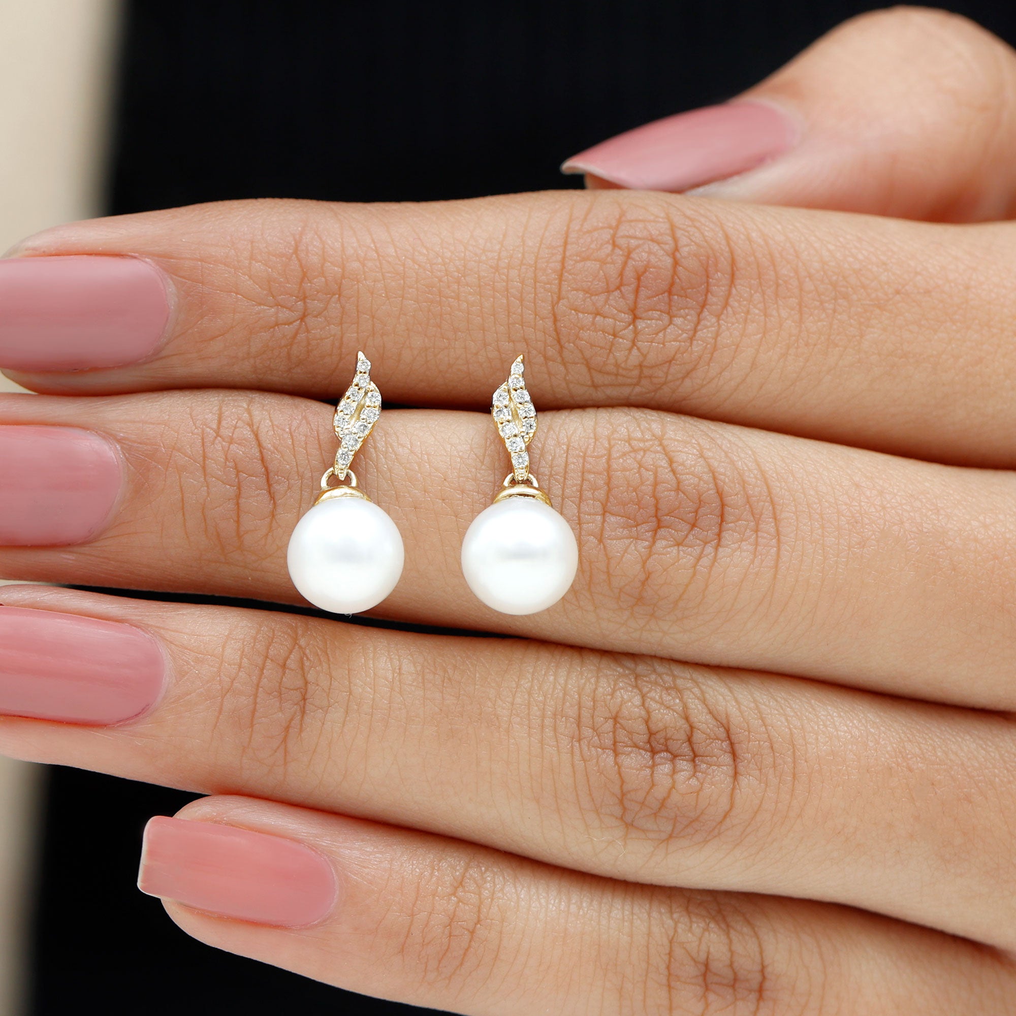 The charming pair of Drop Earrings feature Round Diamond stones and 8 MM Round Shape Freshwater Pearl as Drop in Bead Setting. The Bridal Earrings are a perfect Wedding Day gift for your beloved.
