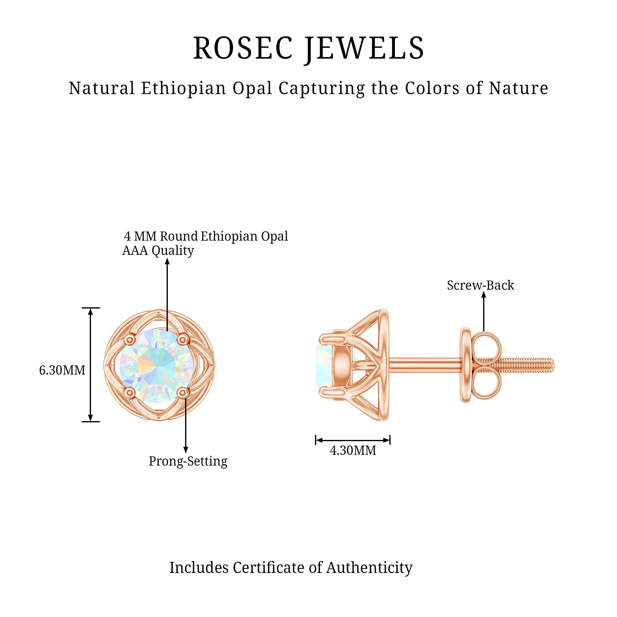 These Flower Stud Earrings are designed to create an unforgettable impression on everyones minds. An artful example of simplicity, embellished with Round Cut Ethiopian Opal secured in 4 prong setting over a unique floral design. These Opal Stud Earrings are crafted in Solid Metal. Give these sparkling Screw Back Earrings to your special person and make it a beautiful memory.