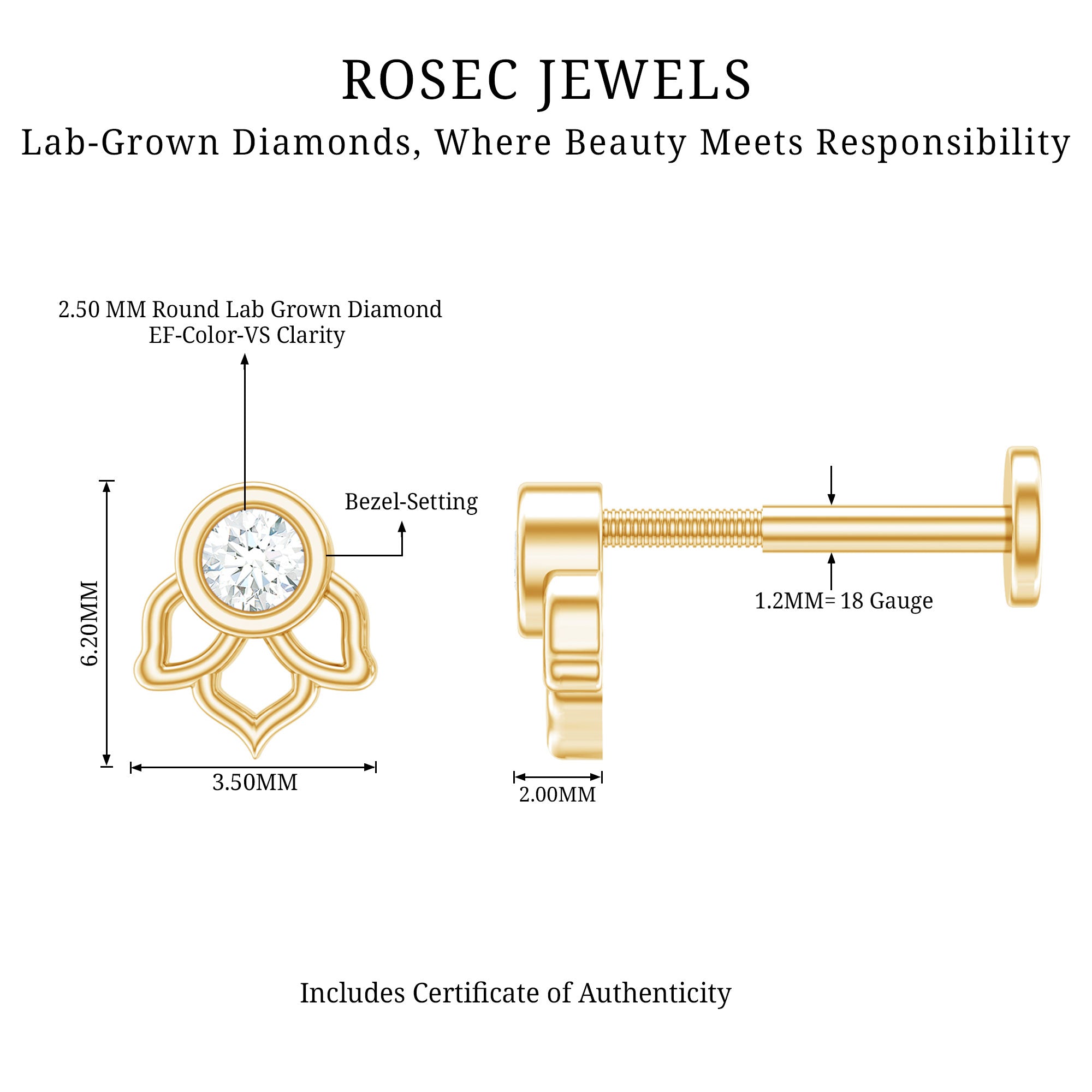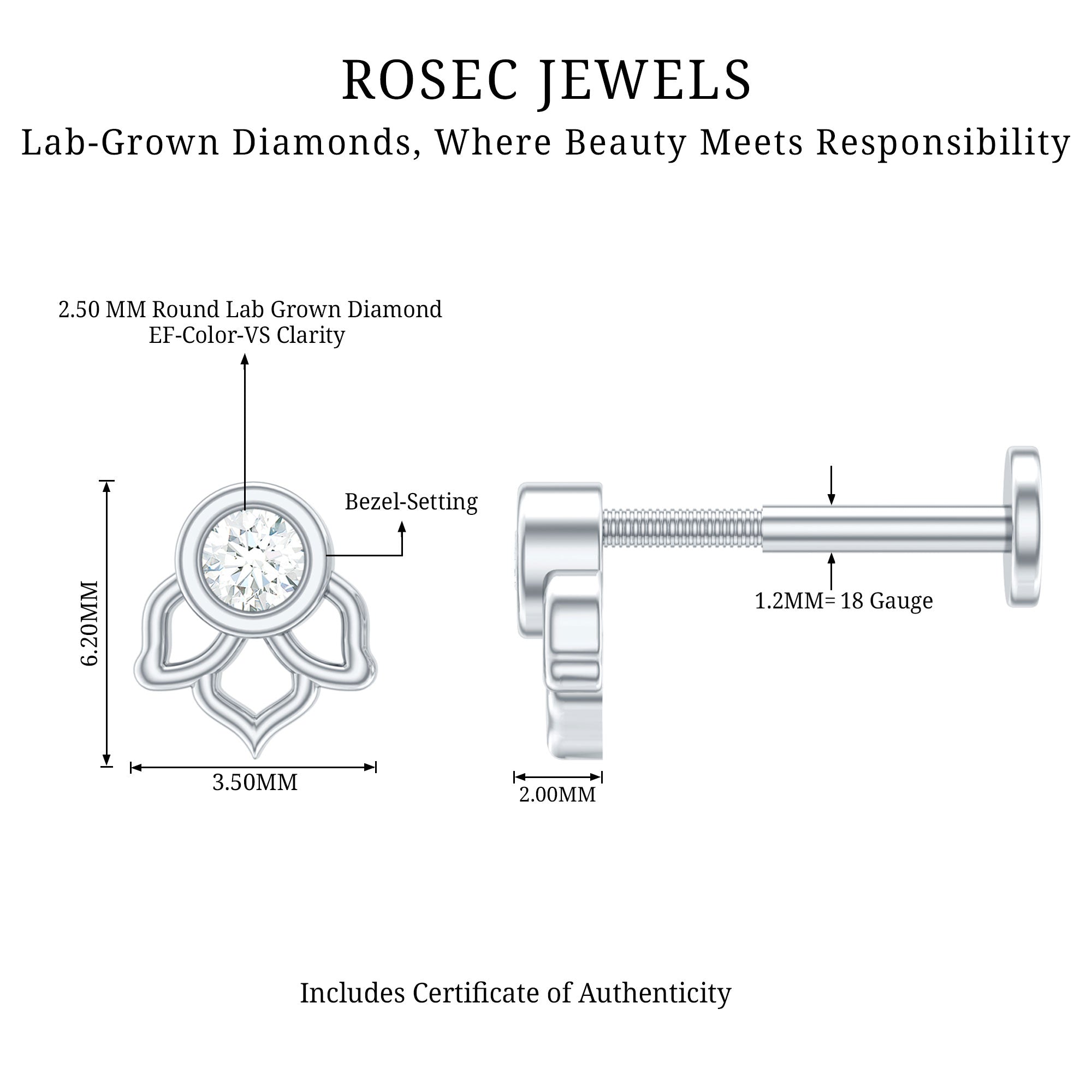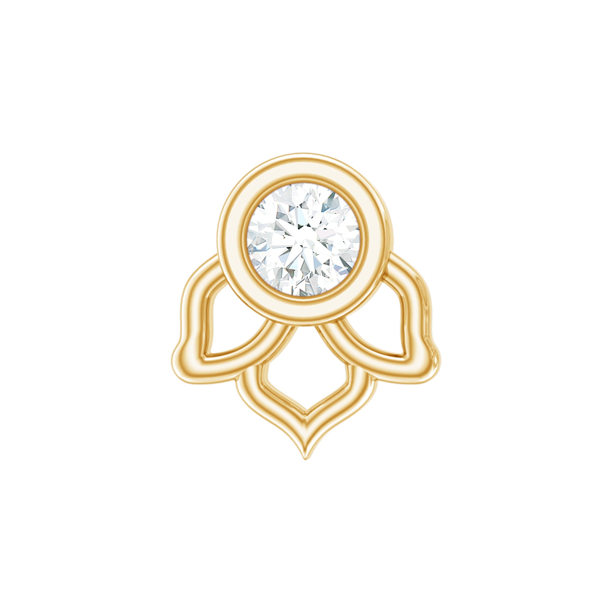 Experience the loveliness of the floral charm by donning our exquisite Lotus Floral Earring. Adorned with a Round Shape Diamond set in Bezel Setting on a unique flower design, crafted with hallmarked metal. You can style this Diamond Earring on your multiple piercings like Helix, Cartilage, Tragus, Conch, or Upper Lobe Piercing. Present this Diamond Solitaire Earring to mom, wife, girlfriend, daughter, family, or friend as its a special Christmas Gift and capture a precious place in their heart forever.