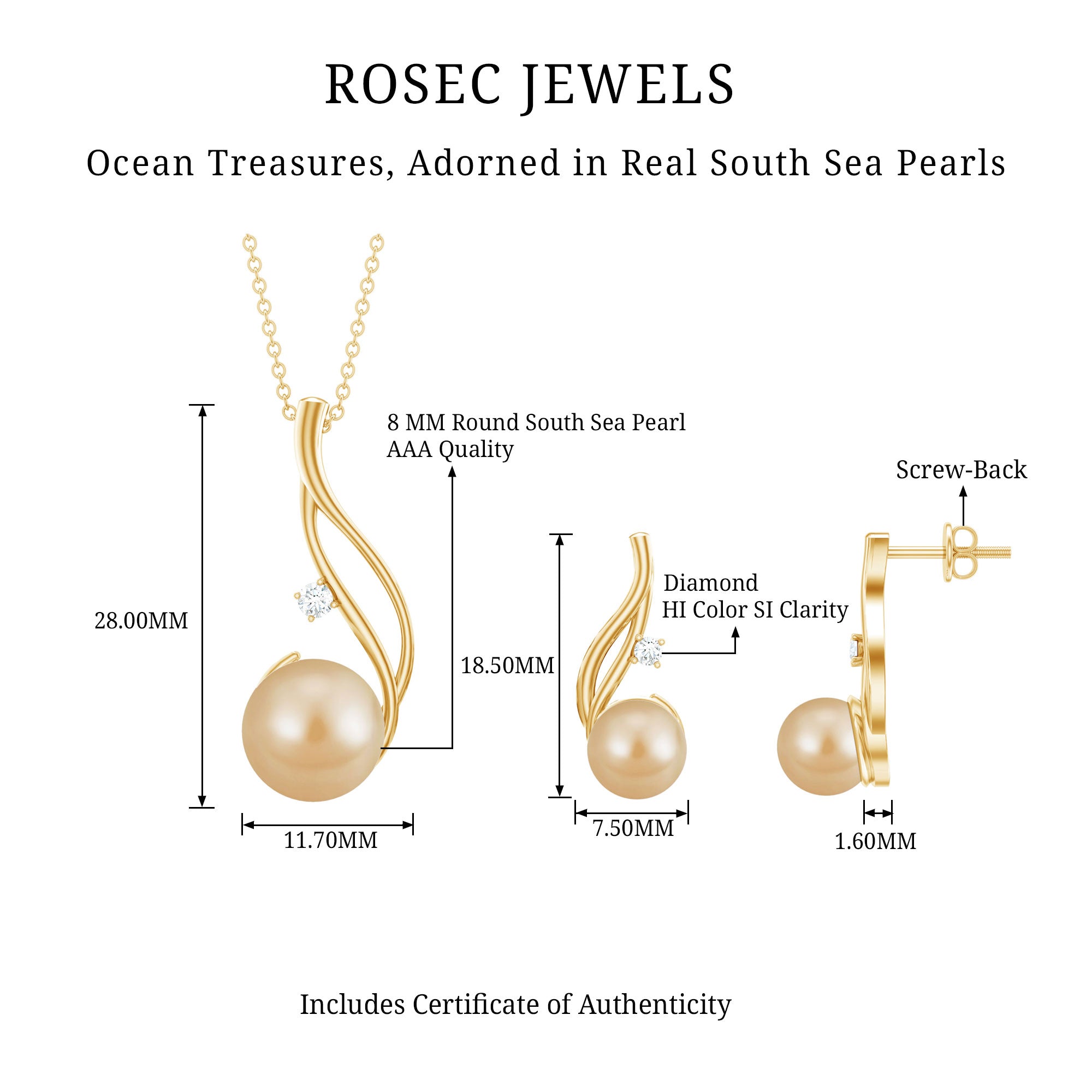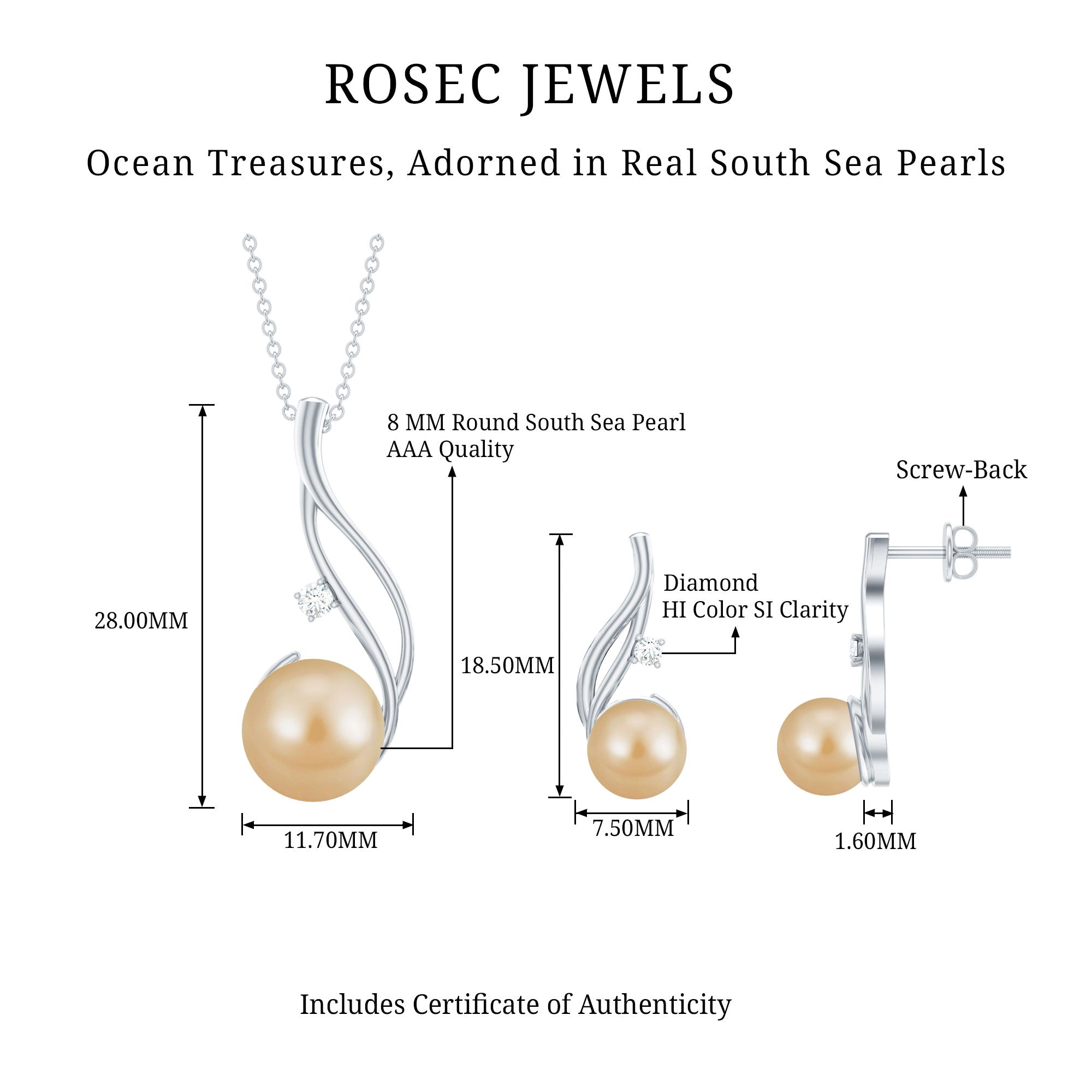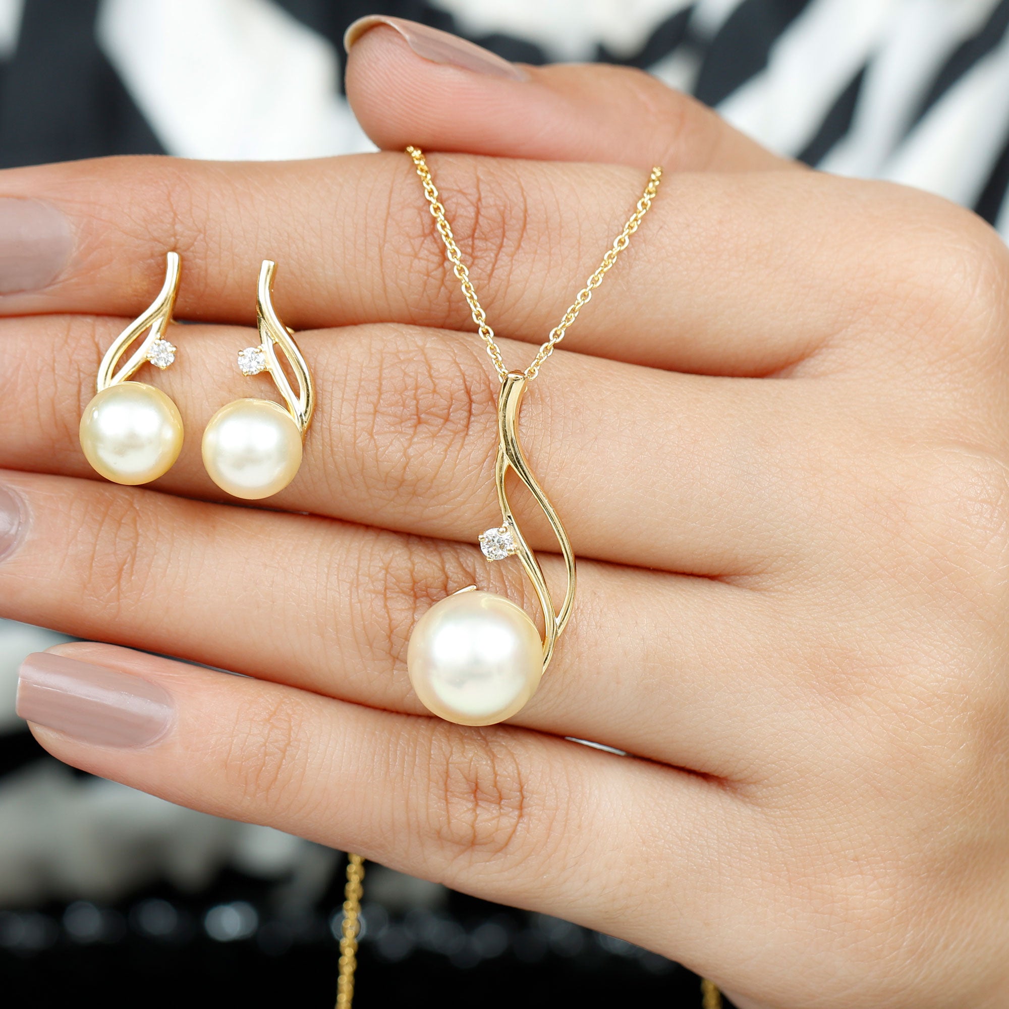 Simple and elegant, our exquisite Pendant and Earrings Set features metal leaf-shaped adorned with a single, lustrous Round South Sea Pearl and a brilliant Diamond stone. The matching earrings complement the necklace perfectly, creating a stunning ensemble. What makes it even more special is the range of metal options available, allowing you to customize this set to your unique style.