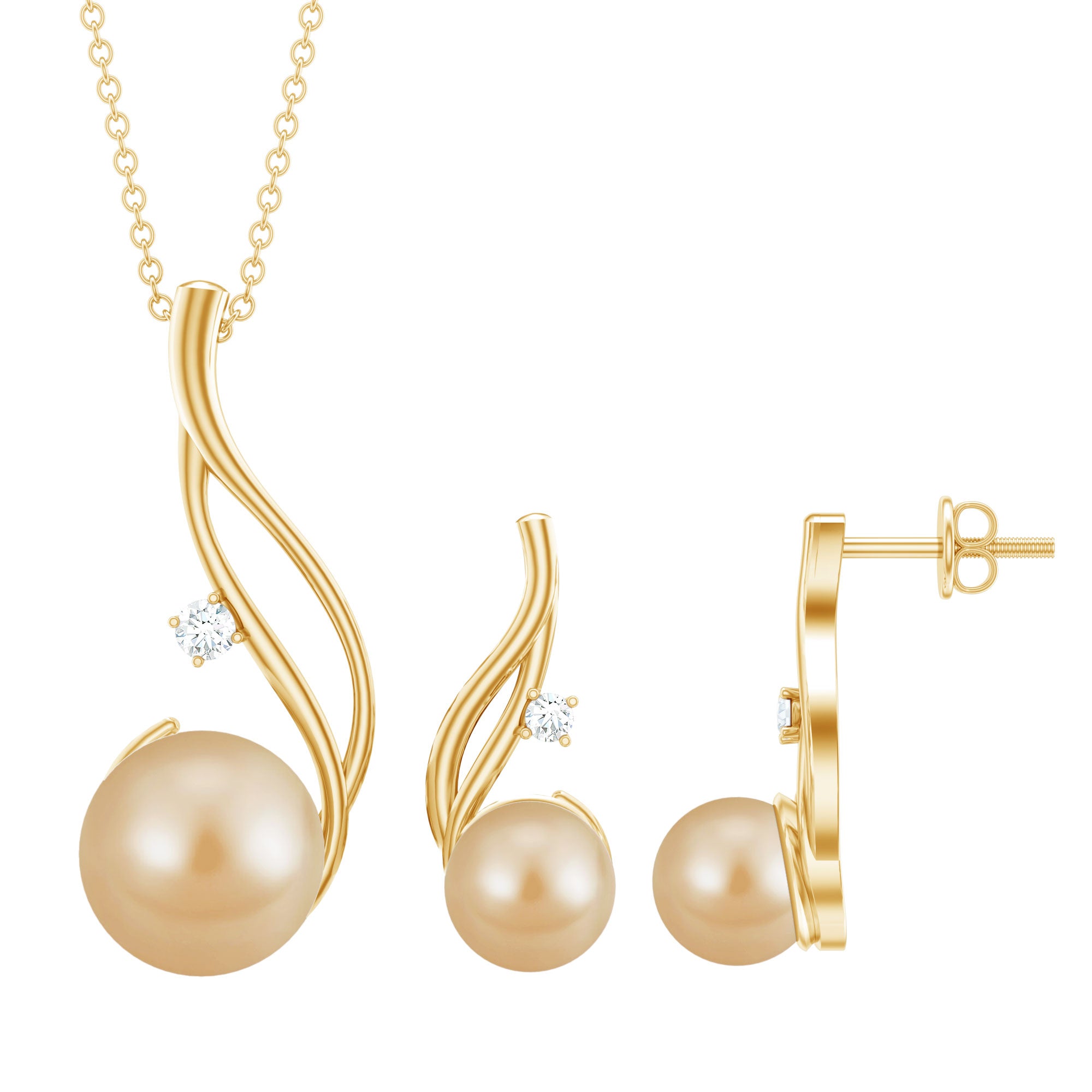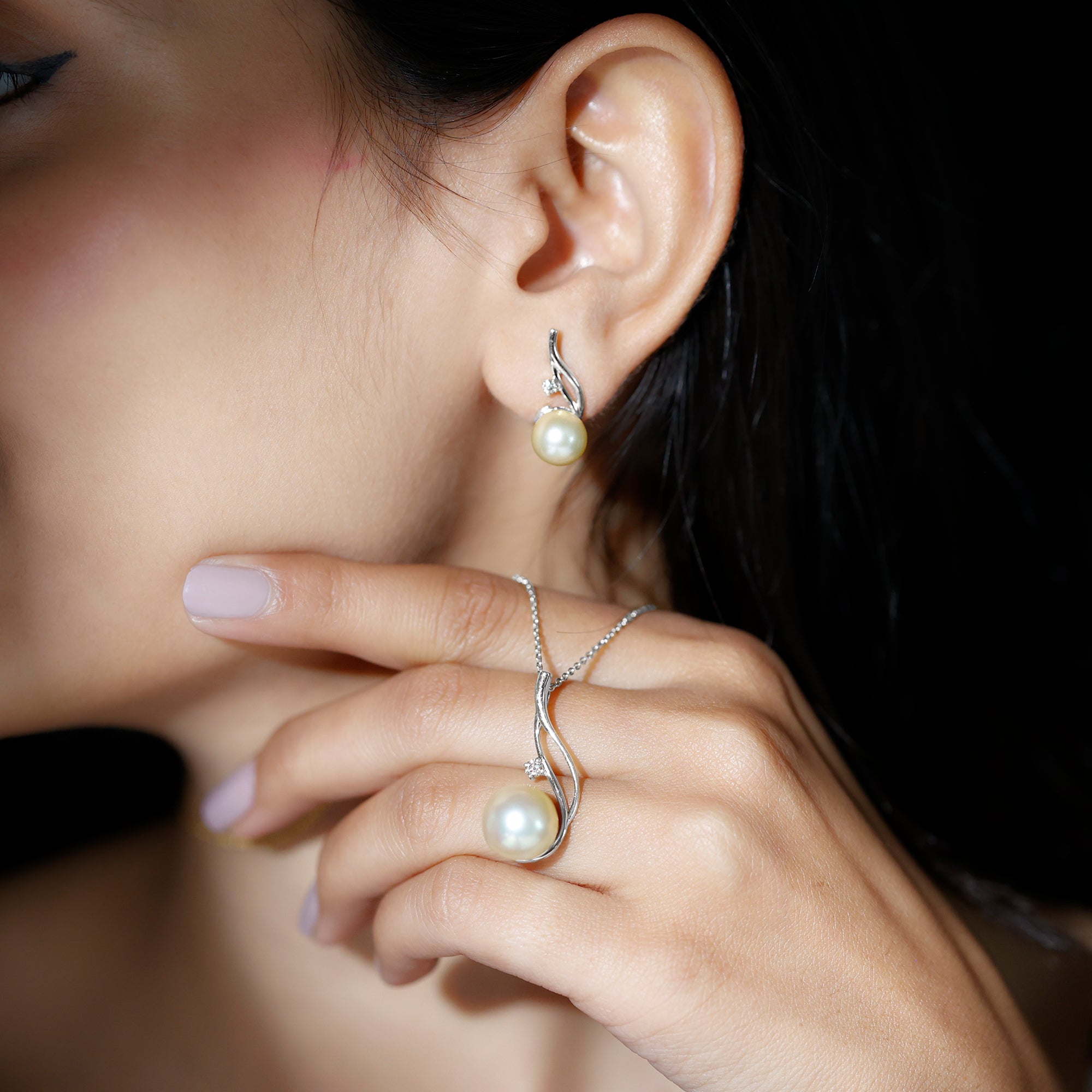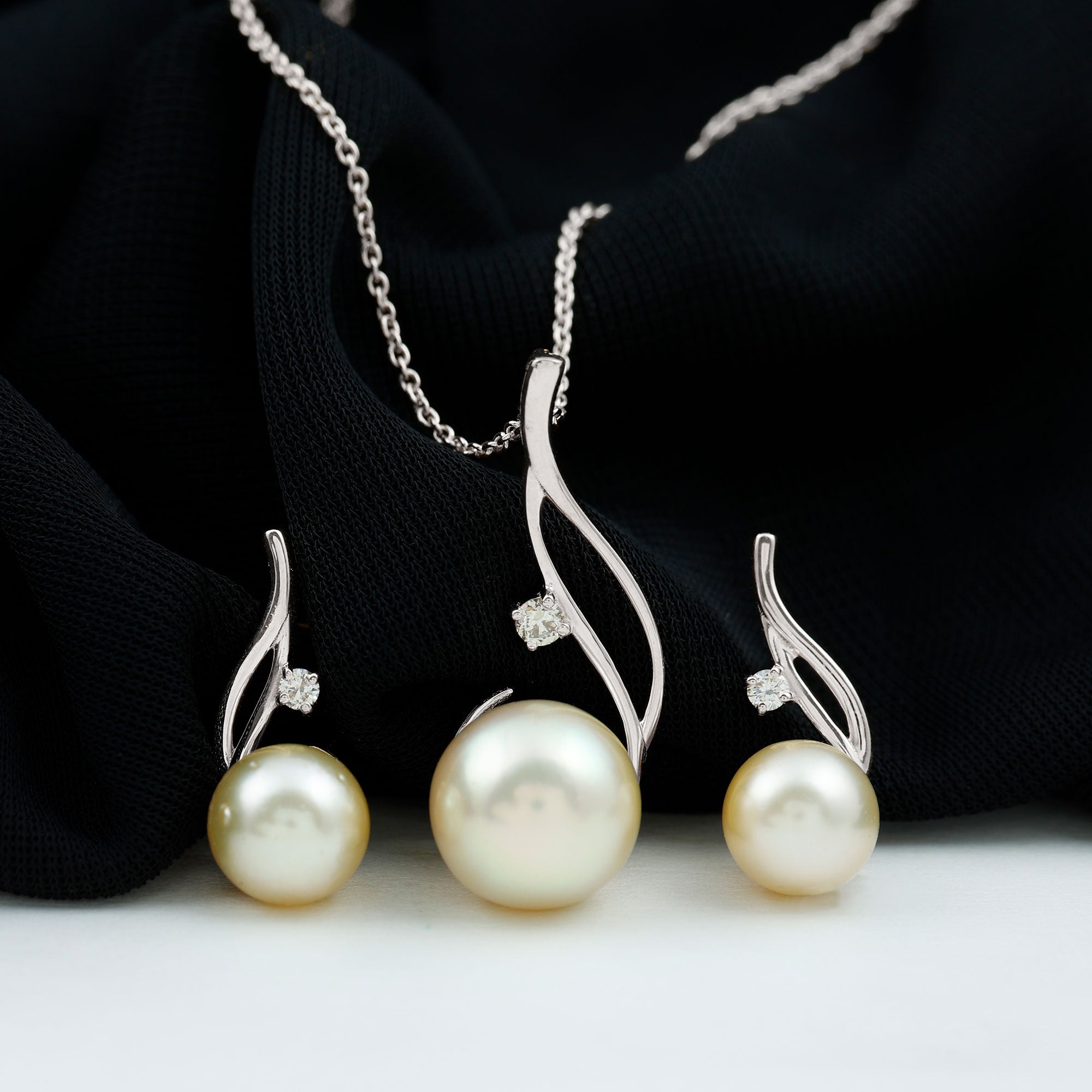 Simple and elegant, our exquisite Pendant and Earrings Set features metal leaf-shaped adorned with a single, lustrous Round South Sea Pearl and a brilliant Diamond stone. The matching earrings complement the necklace perfectly, creating a stunning ensemble. What makes it even more special is the range of metal options available, allowing you to customize this set to your unique style.