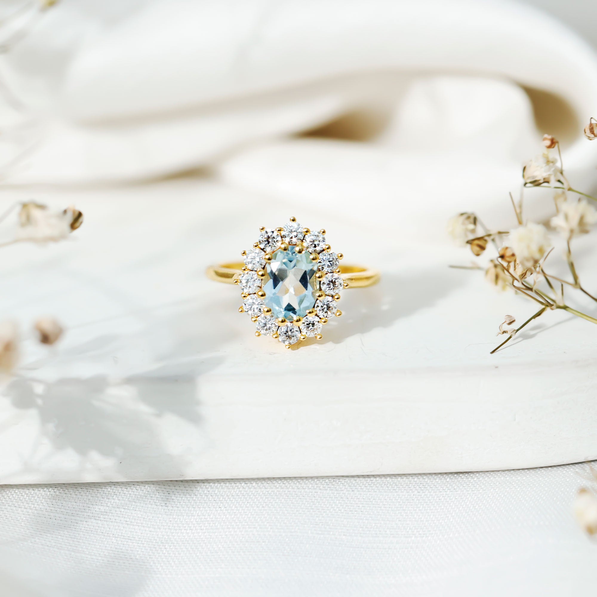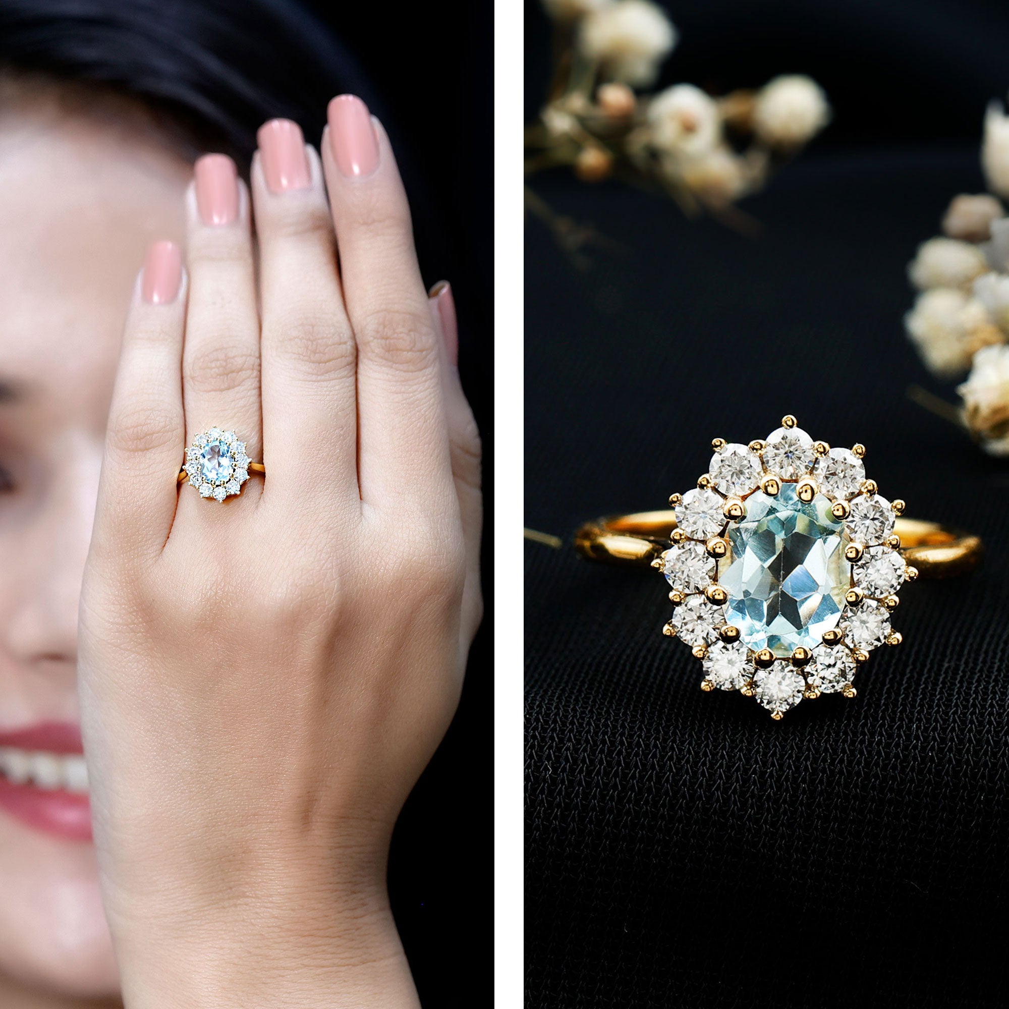 Delicate, dreamy, and filled with light, this Sky Blue Topaz Engagement Ring brings a breath of fresh air to your special moments. At the heart of this stunning ring sits a 6X8 MM oval shaped Sky Blue Topaz, held securely in prong setting. Surrounding the center stone is a halo of brilliant round cut Moissanite stones, adding just the right amount of sparkle to make the center gem shine even brighter. This Halo Engagement Ring is all about balance, subtle yet eye-catching, timeless yet fresh. Whether you are planning a proposal, celebrating an anniversary, or gifting yourself something meaningful, this piece captures the beauty of love in its purest form. Crafted in 14K yellow gold plated silver and finished with attention to detail, this Sky Blue Topaz Ring is not only beautiful, it is also made to last. The cool tones of the topaz paired with the sparkle of moissanite create a soothing yet glamorous contrast, making it a standout accessory with a soft, romantic feel. Perfect as a December birthstone gift or a unique engagement ring, this piece comes beautifully packaged and ready to create lasting memories. If you love jewelry that is light, lovely, and full of emotion, this Blue Topaz and Moissanite Ring is the perfect match. Because sometimes, all it takes is a little color and sparkle to say everything your heart feels.