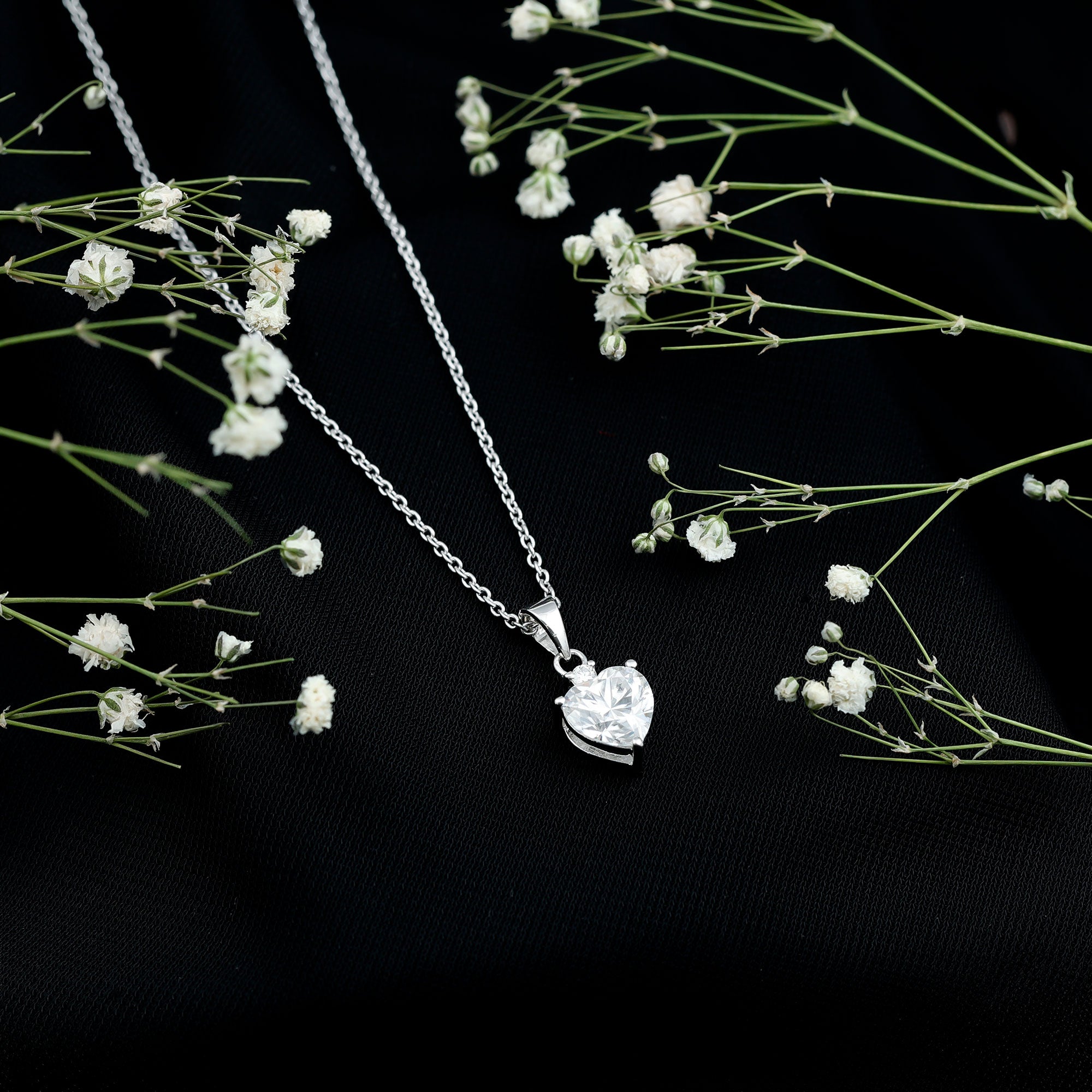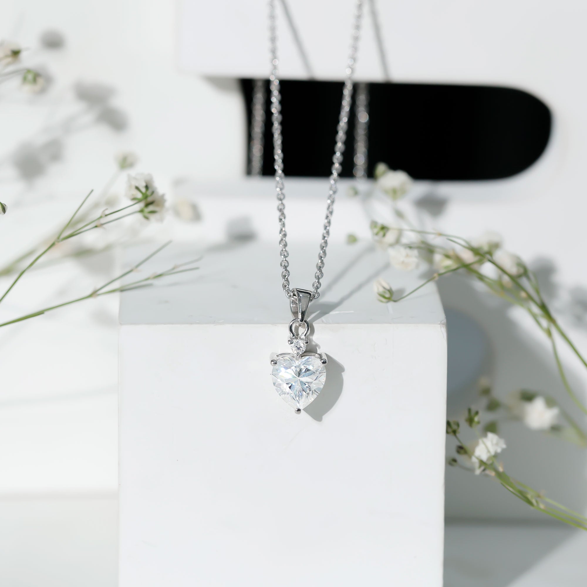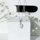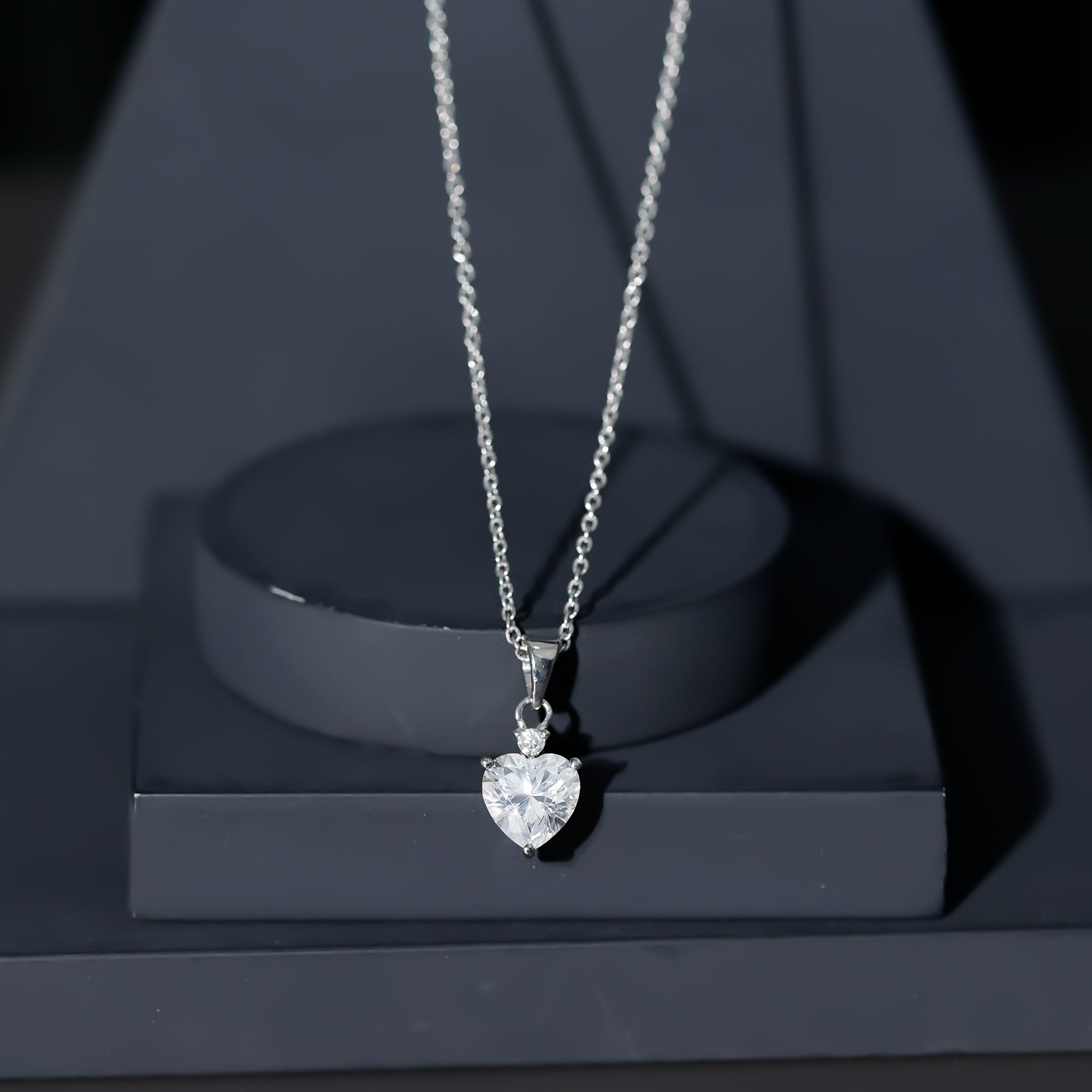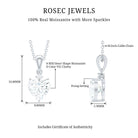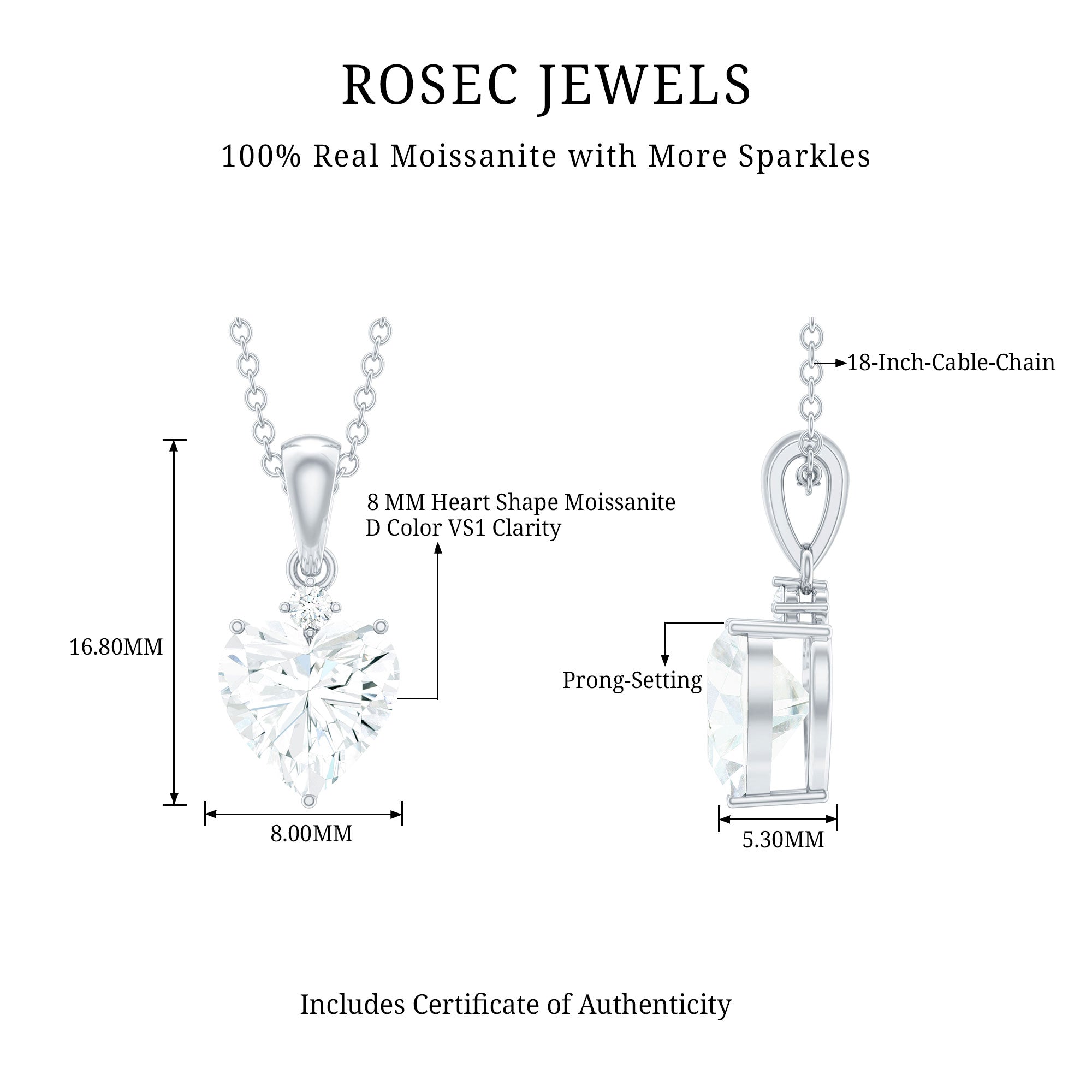 Present this Moissanite Heart Pendant to her as a token of love. This pendant features an 8 MM Heart Shape Moissanite topped with the Round Shape Moissanite embedded in the 14K White Gold Plated Silver. This Solitaire Pendant beholds the classic shine of D-VS1 Quality Moissanite securely placed in Prong Setting. The pendant is accentuated with the standard bail and dangles in a sturdy cable chain, which makes it beautifully sit on the neckline. This Chain and Pendant will be delivered to you in a premium quality velvet pouch with the certificate of authenticity.