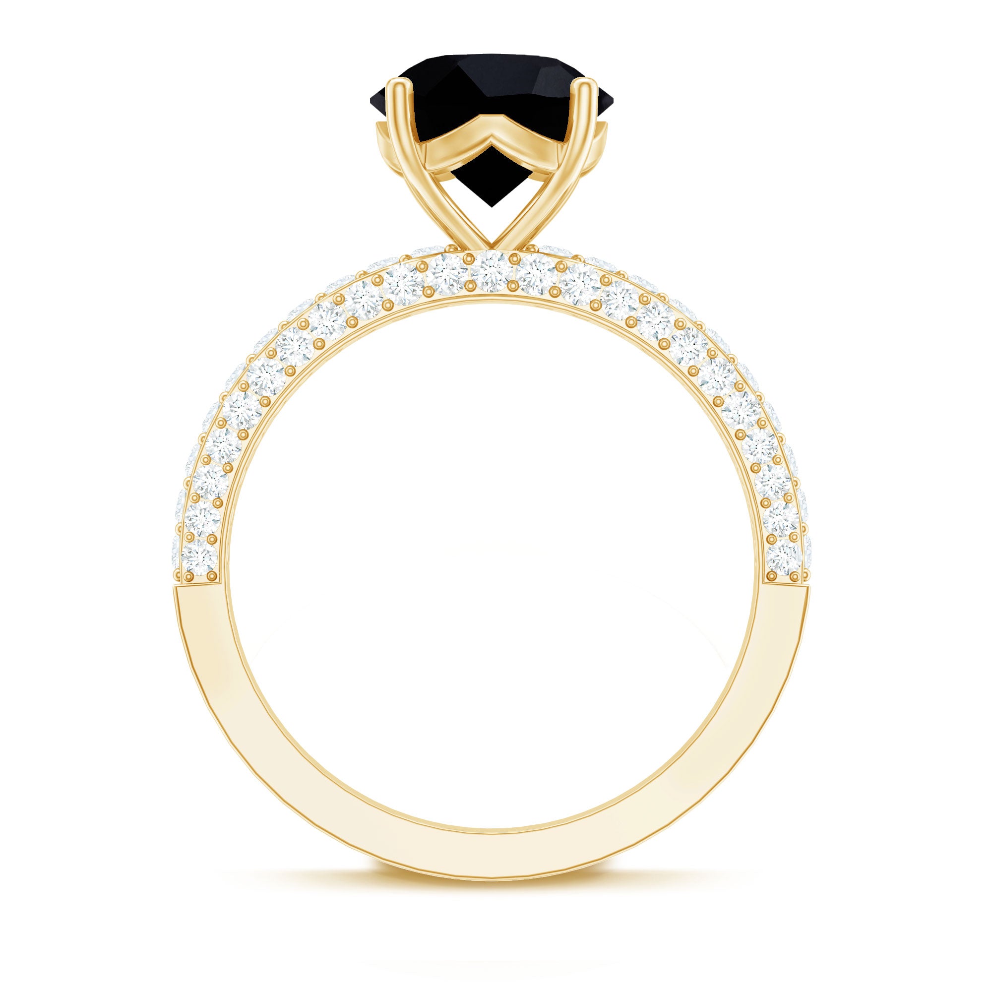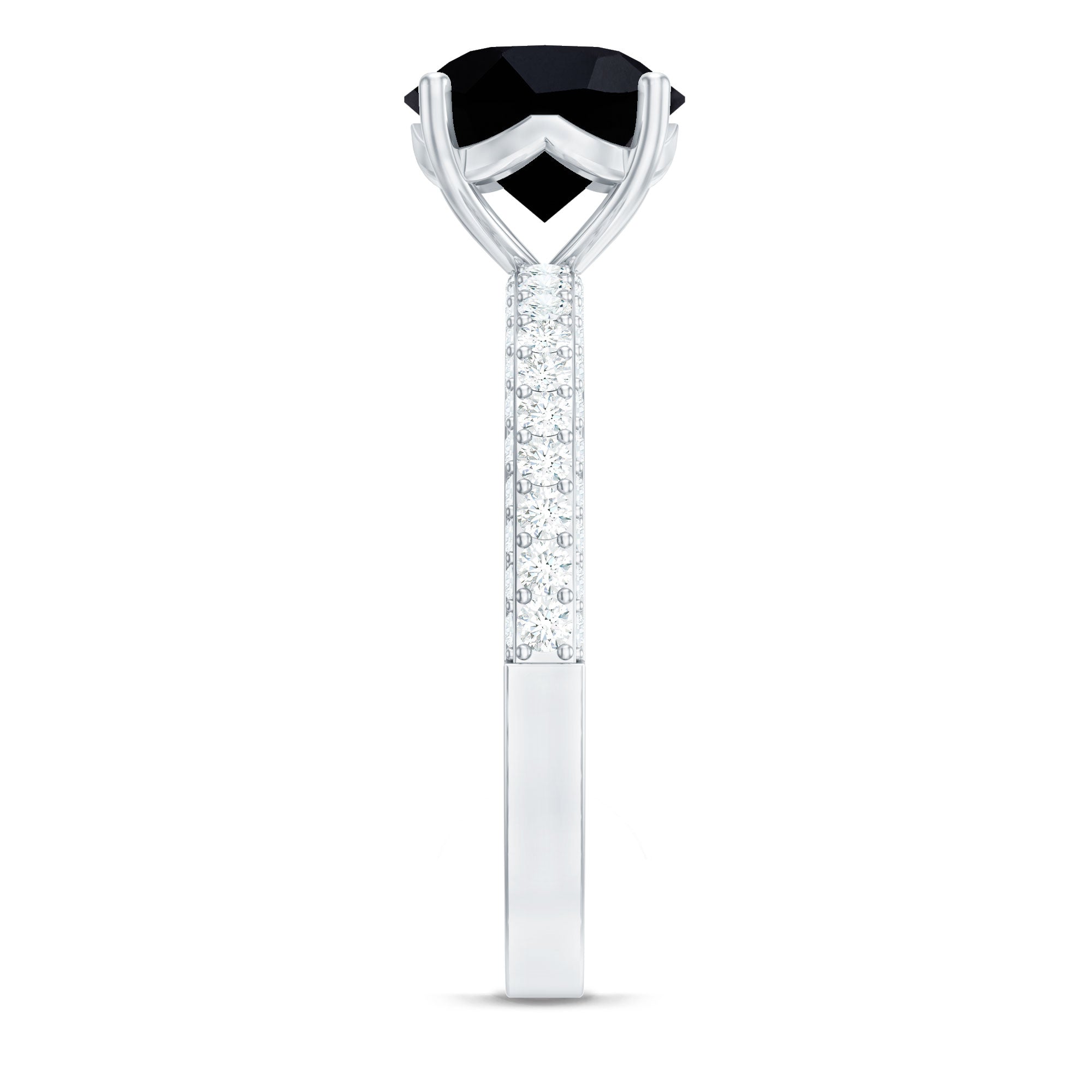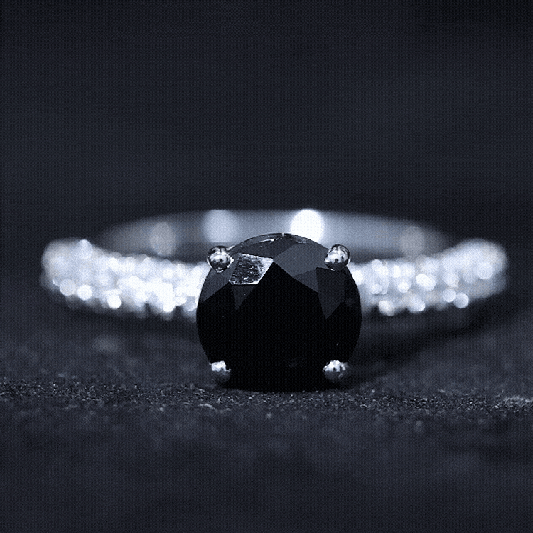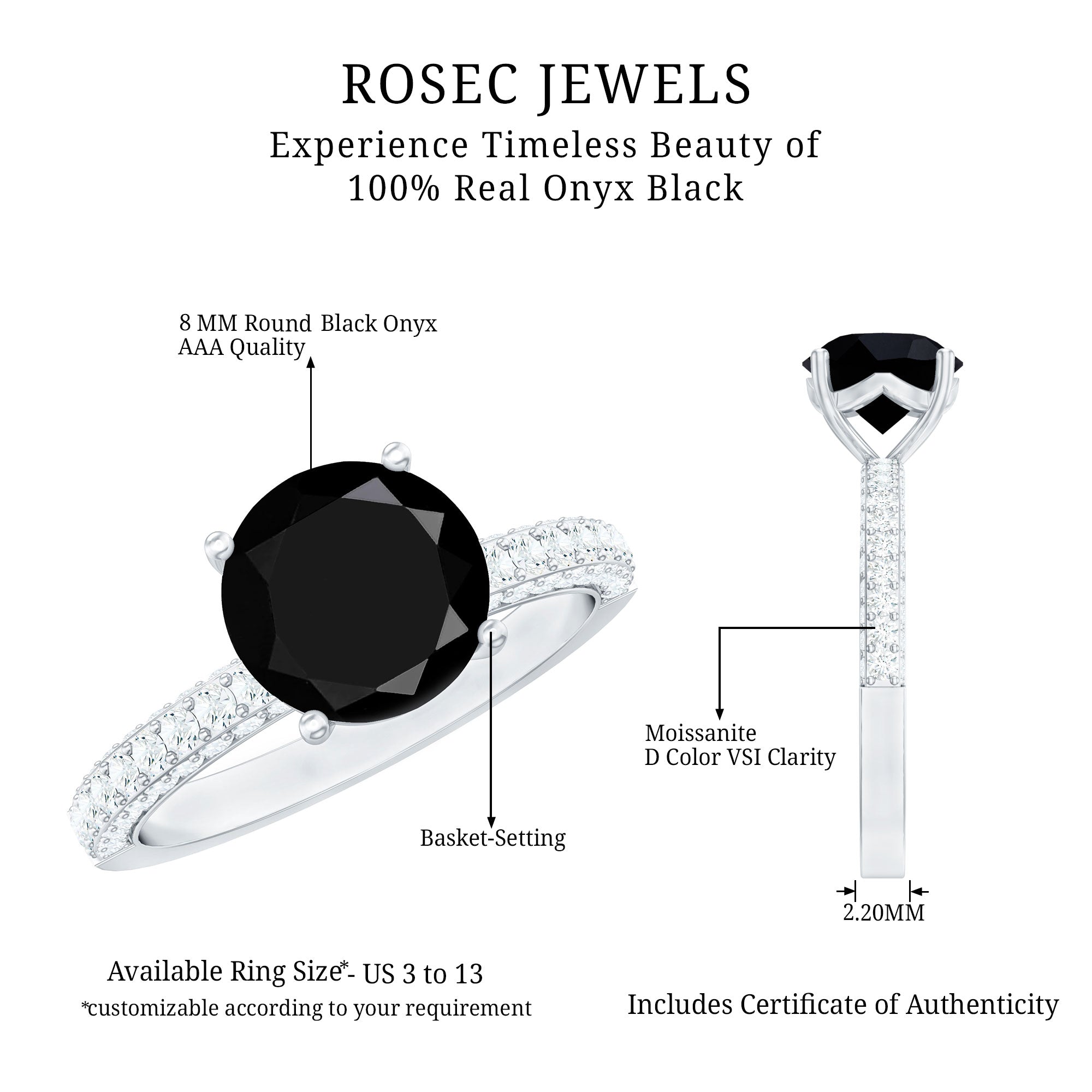 Black onyx is valued for its rich, opaque appearance and modern appeal in fine jewelry. As a natural gemstone, it may display subtle individual characteristics. Moissanite is known for its brilliance and durability, making it suitable for everyday engagement wear when properly cared for.