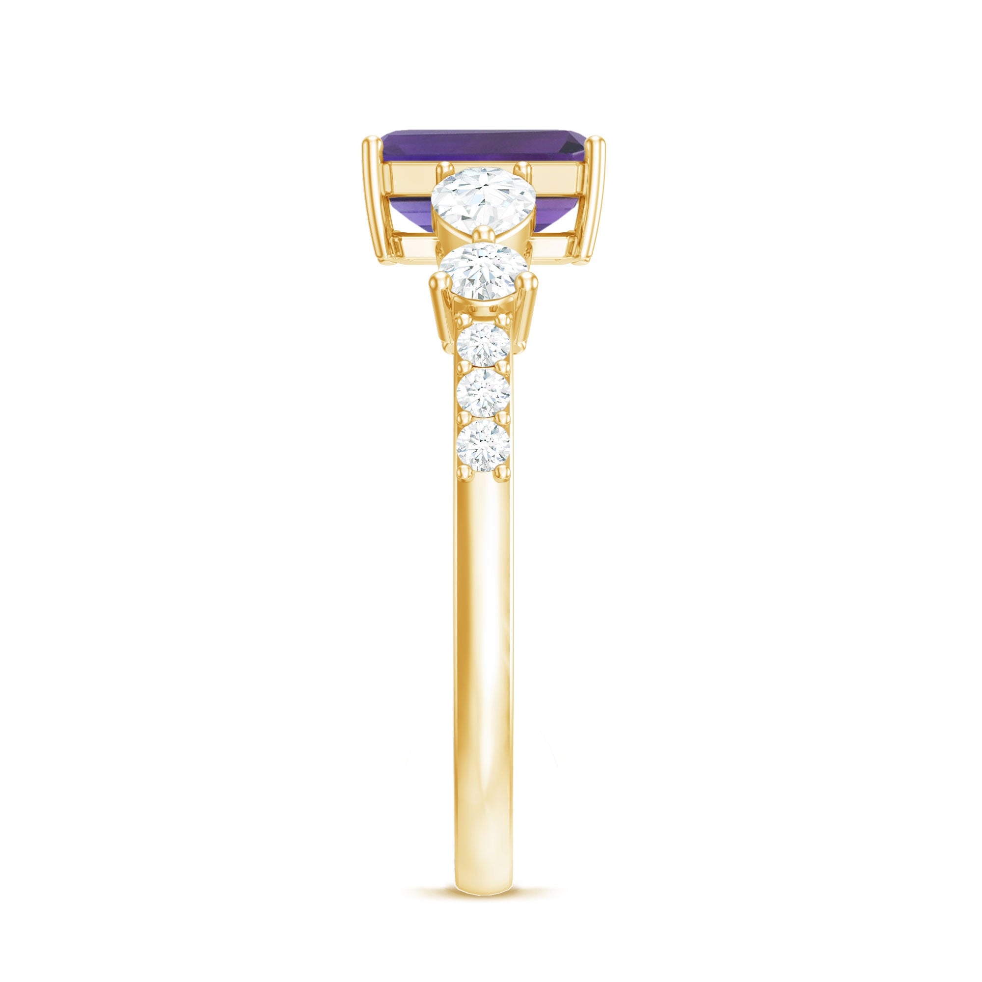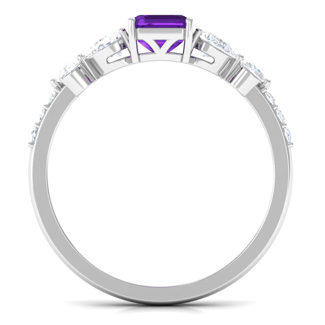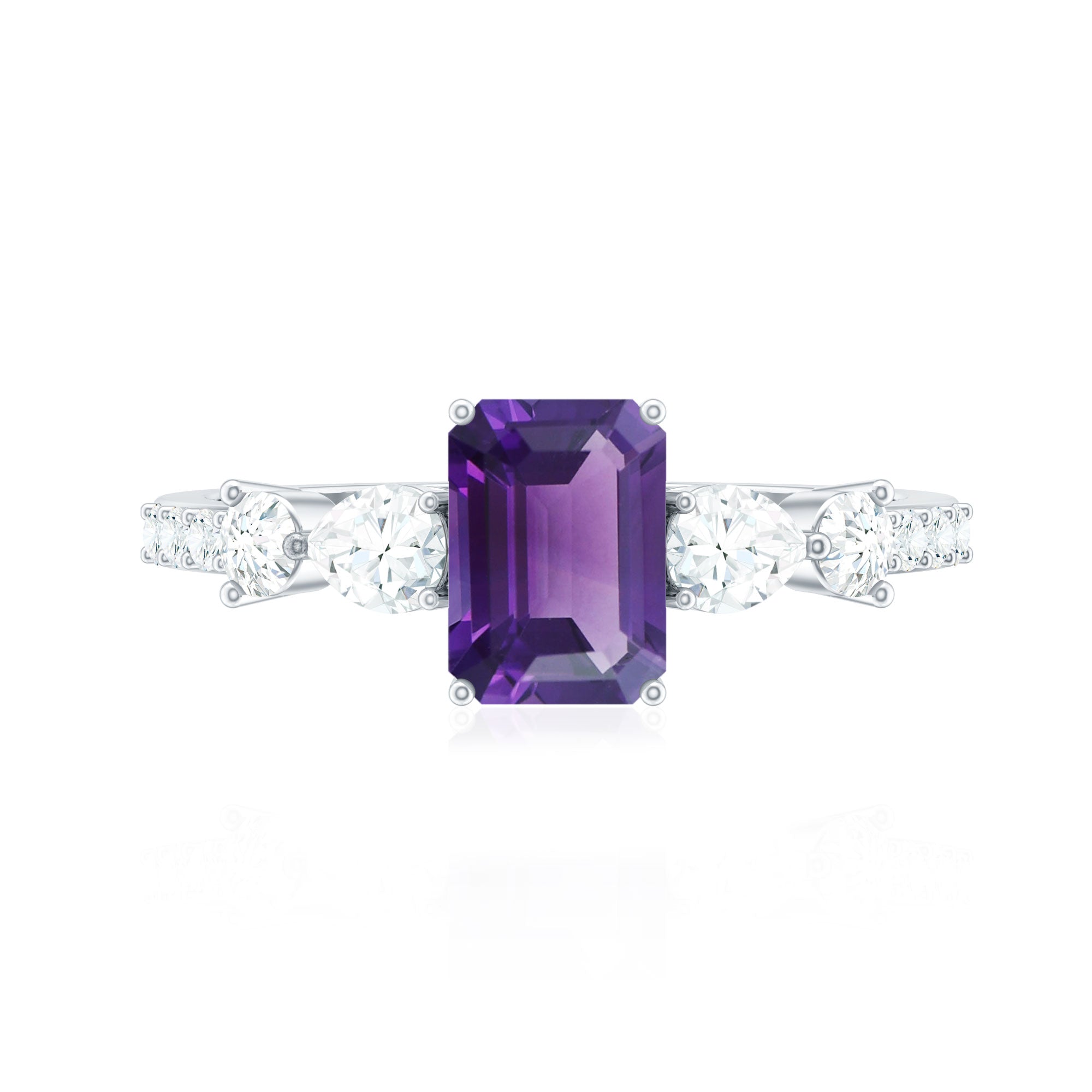 Express your love to your beloved with this Solitaire Amethyst Engagement Ring. This Classic Engagement Ring is decorated with Octagon Cut Amethyst as a solitaire in a prong setting with Round and Pear Cut Moissanite in a side stone setting. This February Birthstone Ring is all your need to make her feel special.