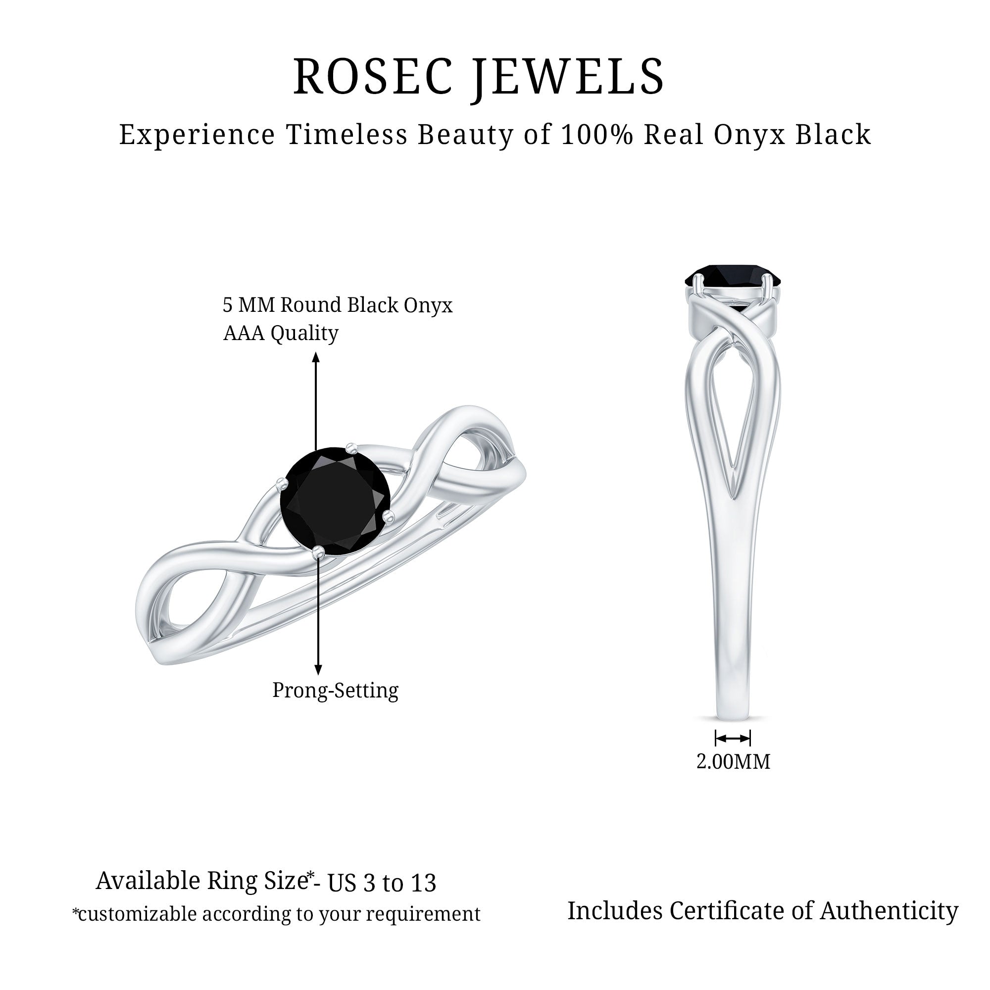 A meaningful connection deserves a ring that speaks from the heart. This Black Onyx Promise Ring is a reflection of commitment and unity. At the center sits a striking 5 MM round cut Black Onyx, held securely in prong setting. The band features a smooth crossover design, gently curving around the gemstone to symbolize two lives weaving into one shared journey. The graceful infinity band holds a deeper meaning of connection, trust, and lasting partnership. Crafted with attention to detail, this Black Onyx Solitaire Ring is both simple and sophisticated, perfect for those who appreciate understated charm. It is ideal for promises, personal milestones, or as a symbol of your growing relationship. The minimalist design ensures it can be worn every day while still holding special significance. Available in a variety of sizes to ensure a comfortable fit, the Pre Engagement Ring arrives in a beautifully designed box, ready to be gifted or treasured. Its timeless look suits any style, while the meaningful design ensures this Infinity Promise Ring is more than just an accessory. Whether you are making a promise or honoring a lasting bond, this Black Onyx Ring offers a heartfelt way to mark the moment. A true keepsake for anyone who believes love is a journey worth cherishing.