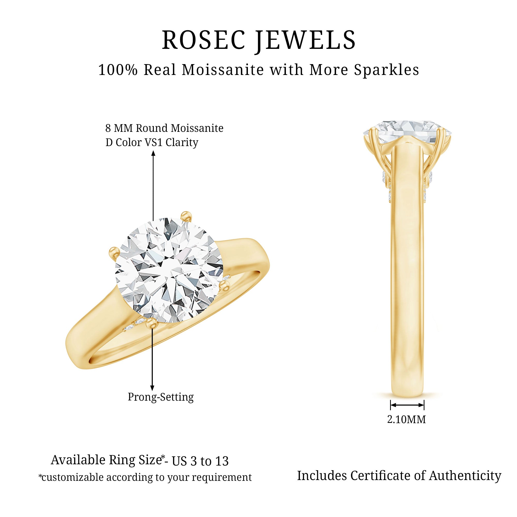 Effortlessly elegant and timelessly refined, this Solitaire Moissanite Engagement Ring proves that true beauty lies in simplicity. At its center, an 8 MM round cut moissanite shines with breathtaking brilliance, securely held in prong setting. Subtle surprise stones tucked beneath the center gem add an unexpected touch of sparkle, making this Solitaire Engagement Ring feel even more special and unique. The cathedral style band gracefully elevates the center stone, allowing more light to pass through and enhancing its natural fire. Designed with a smooth, simple band, this Cathedral Engagement Ring captures a delicate balance between modern sophistication and timeless charm. Crafted with care, this piece is perfect for anyone who values both beauty and meaning. This 2 Carat Moissanite Ring arrives in a thoughtfully crafted jewelry box, ready to gift or keep safe as a treasured keepsake. Available in multiple sizes to ensure a flawless fit, this Round Moissanite Ring is a bold yet understated symbol of love, never too flashy, never too simple, but just right. Let it be the piece that captures your forever with grace, brilliance, and meaningful elegance.