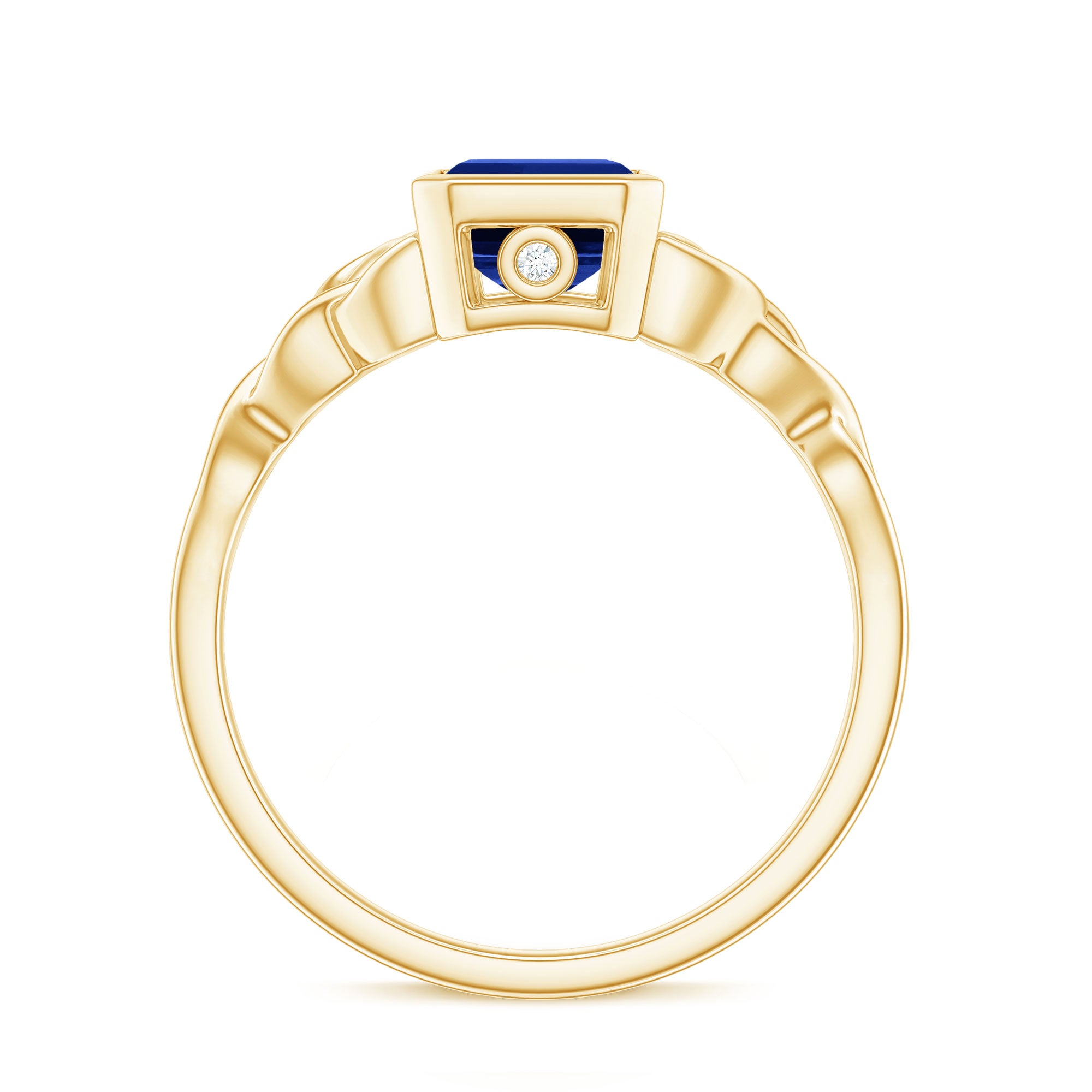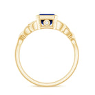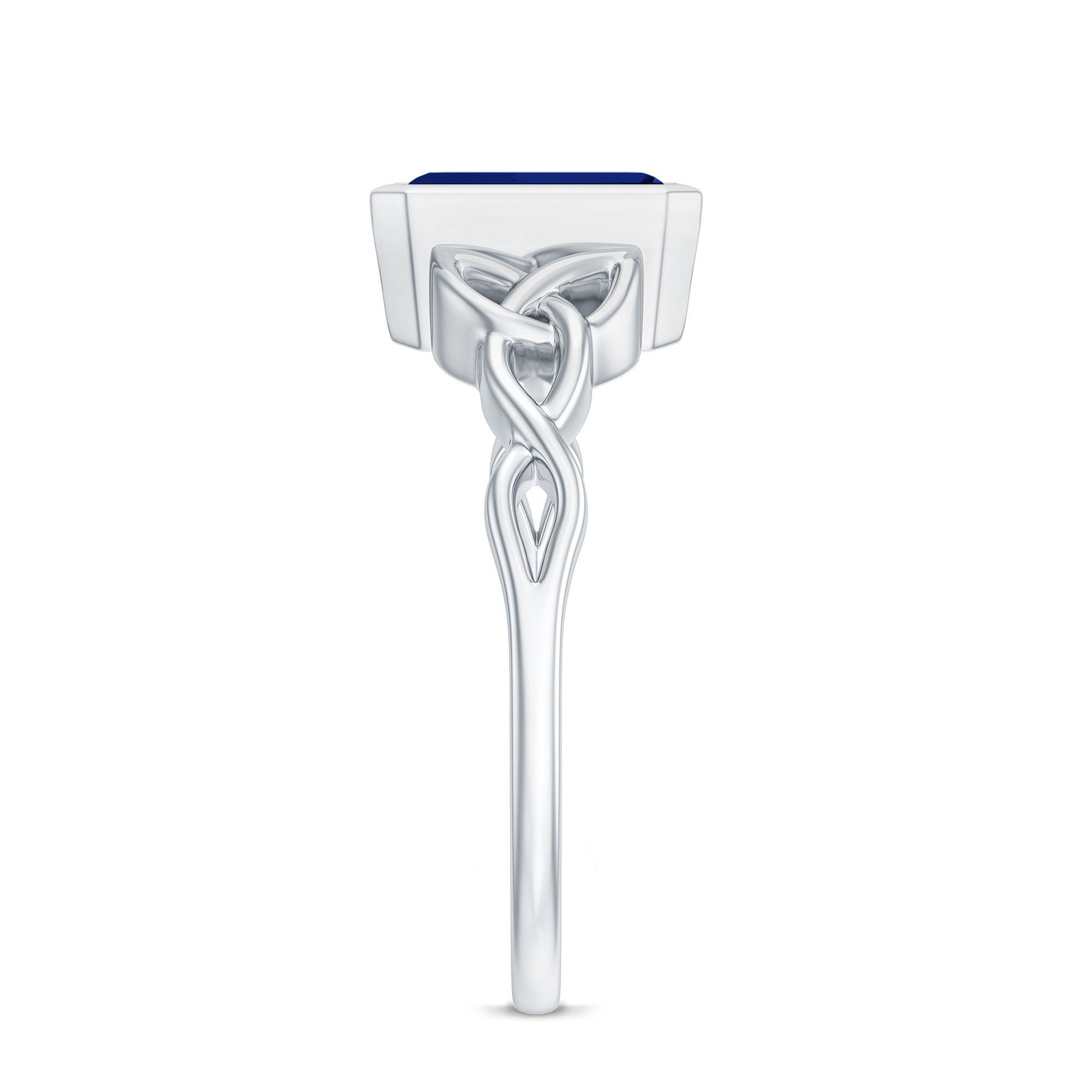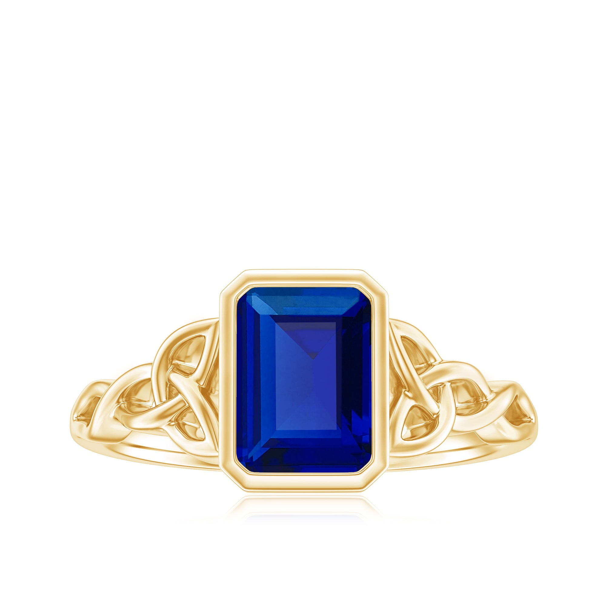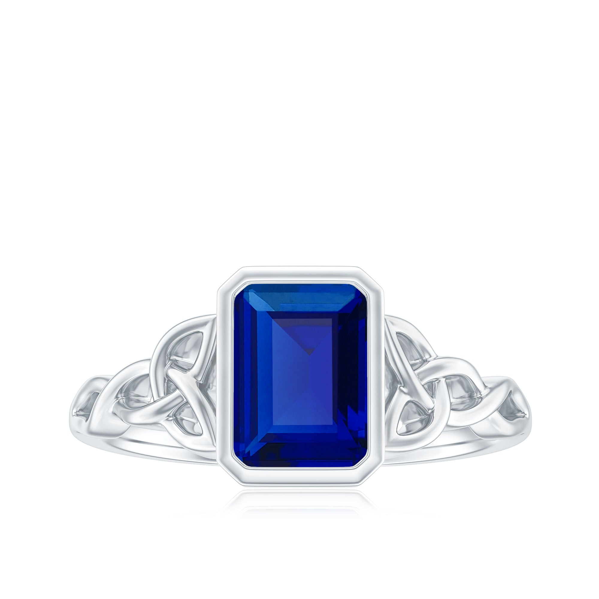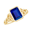 This Celtic Engagement Ring is beautifully adorned with Emerald Cut Lab Created Blue Sapphire secured in Prong Setting while dainty Round Diamond studded on the bridge of the ring. Pamper your better half by getting this Solitaire Ring as an anniversary gift for her.