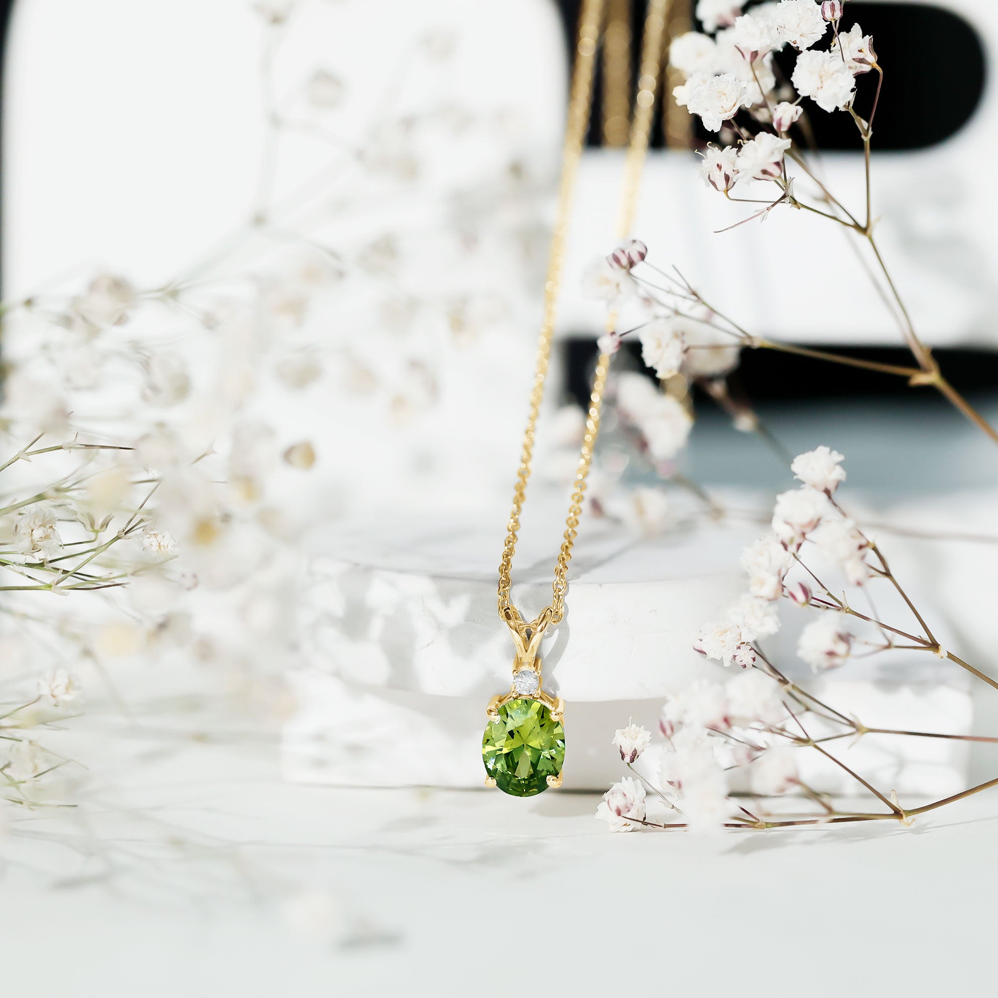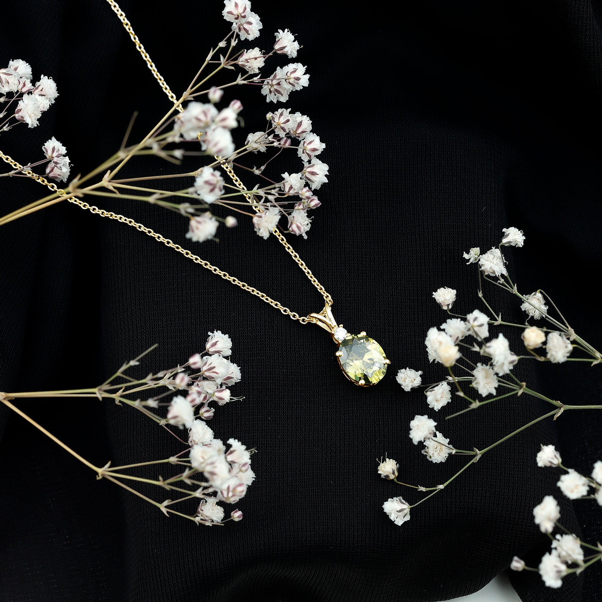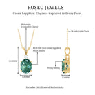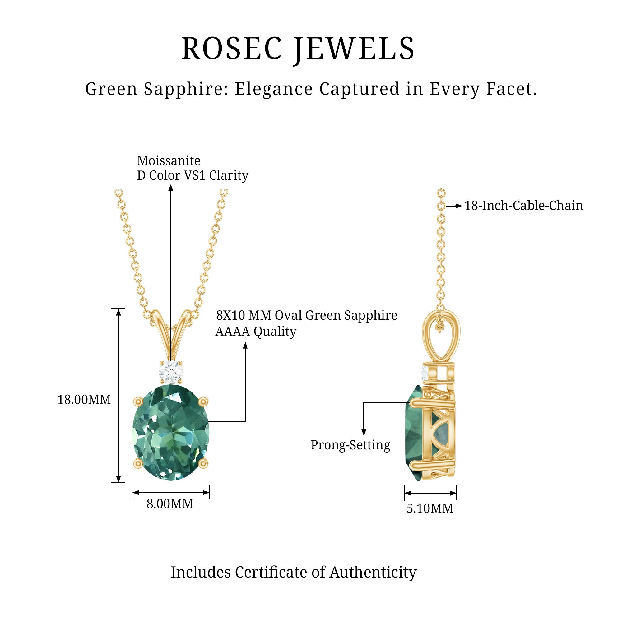 Add elegance to your neckline with this Solitaire Necklace. Featuring an Oval Cut Created Green Sapphire in a prong setting, complemented by a shimmering Moissanite stone. This created sapphire necklace is the perfect accessory to showcase your sophisticated style.