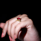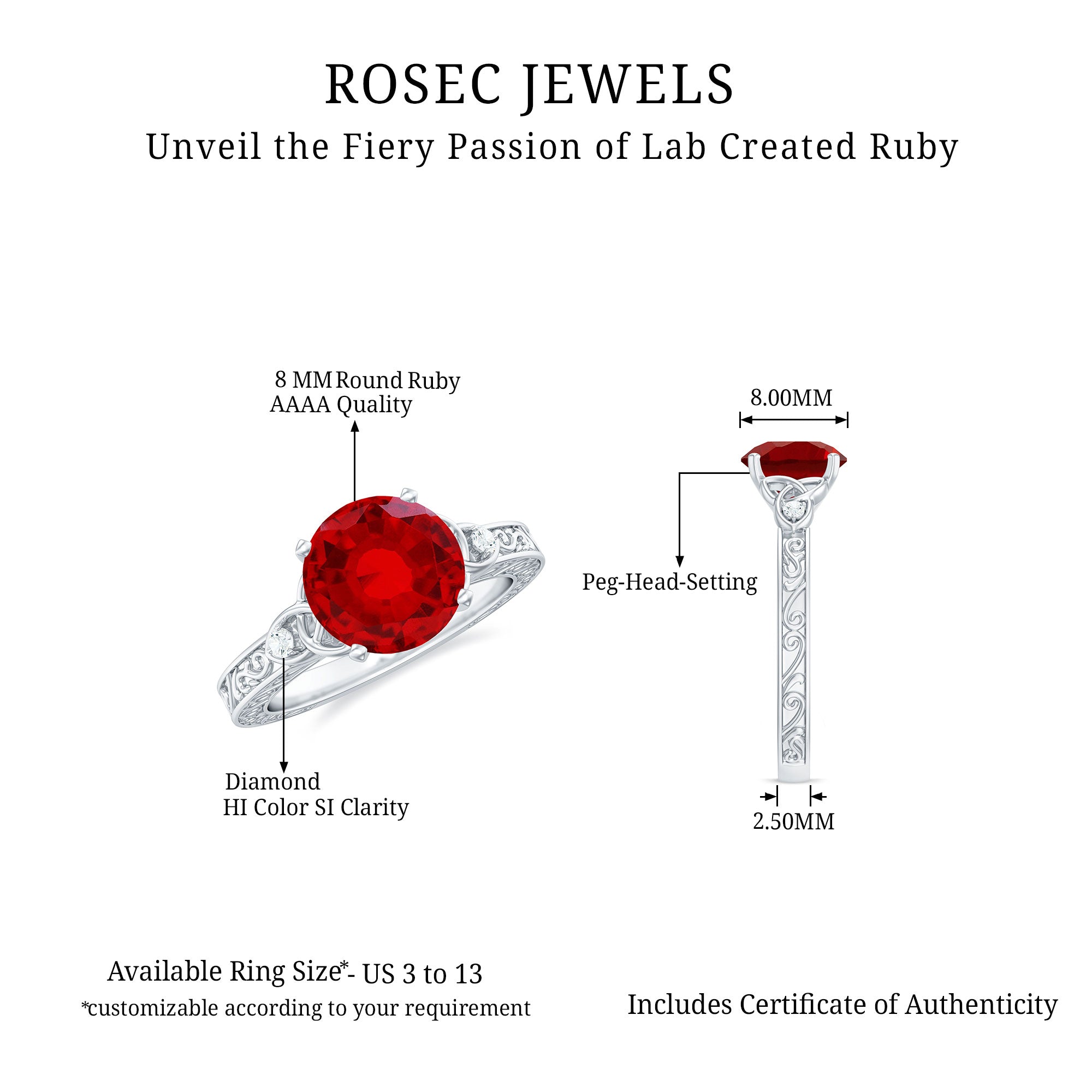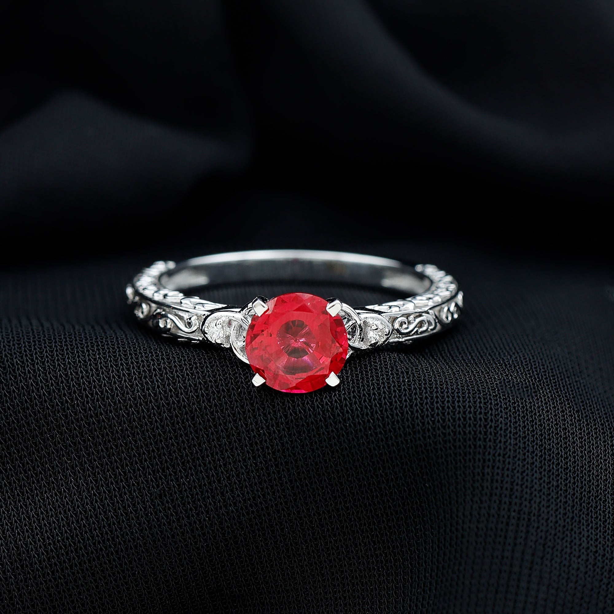 This beautiful solitaire ring features a created ruby center stone with unique Celtic knot design, accented with shimmering Diamond stone on each side. The deep red hue of the created ruby adds a touch of passion and romance to the ring, while the intricate knot design symbolizes eternal love and commitment. The shimmering Diamond stones provide a stunning contrast and add a touch of glamour and sophistication to the ring.