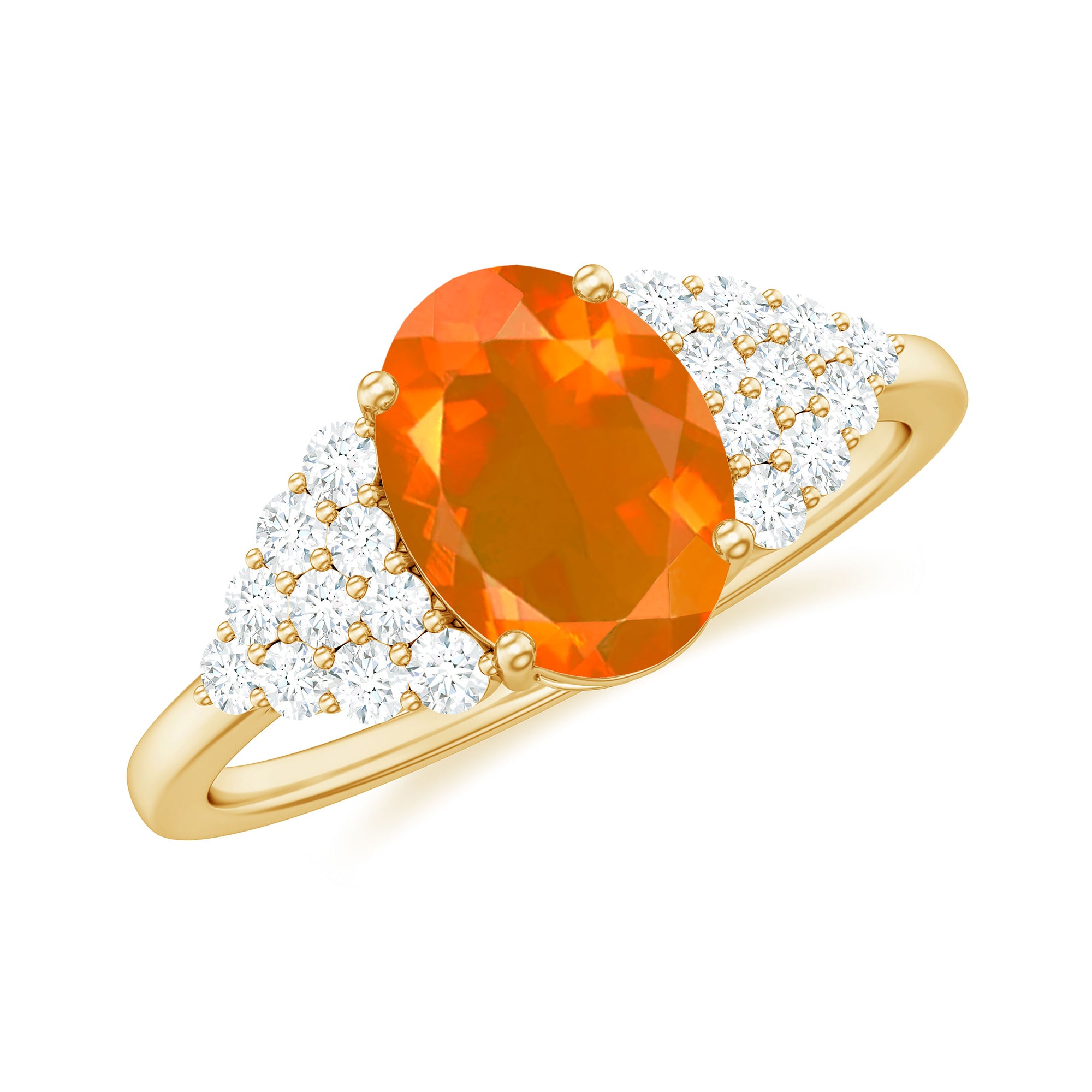 Profess your undying love for the woman of your life with this Oval Solitaire Engagement Ring. This Gold Engagement Ring is embellished with Oval Shape Fire Opal as a solitaire in a prong setting with a round Diamond as cluster in a prong setting. This Fire Opal Engagement Ring is available in gold metal.