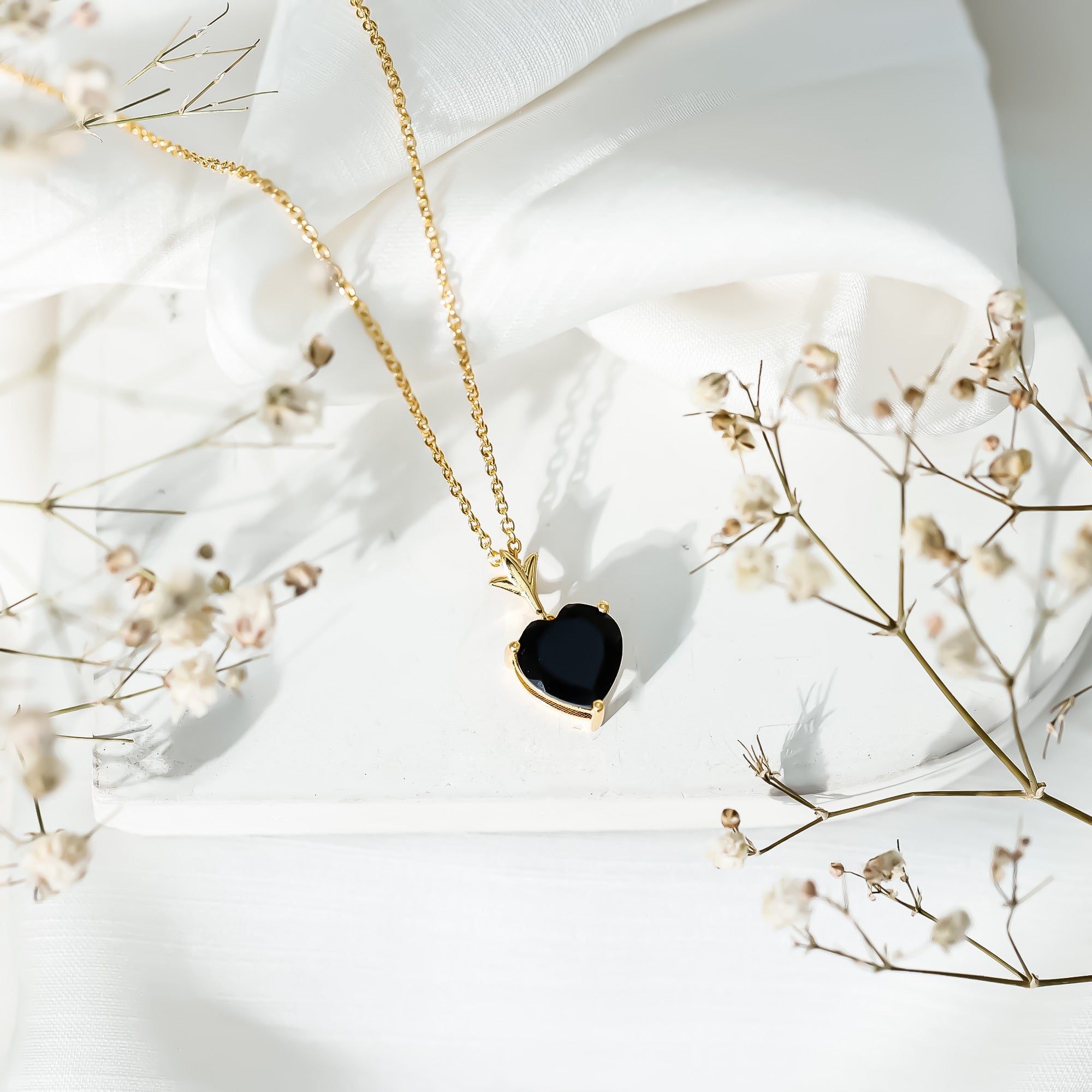 When elegance meets boldness, you get a necklace like this, classic in beauty and rich in meaning. This striking Heart Solitaire Necklace captures attention with its 10 MM lab created black diamond. Suspended delicately from a sleek chain, the Black Diamond Necklace speaks of fearless love and timeless strength. Crafted with care in 14K yellow gold plated silver, the contrast between the radiant golden tones and the intense black stone creates a look that is both refined and timeless. The Heart Locket Necklace is securely held in 3-prong setting, allowing the gemstone faceted brilliance to shine from every angle, while the designer metal motif at the top adds a subtle touch of sophistication and drama. This Black Diamond Heart Necklace is for the woman who writes her own rules, who embraces the beauty in contrast, and who understands that love comes in all shades. Whether worn as a daily staple or dressed up for special occasions, this necklace easily adapts to any style. Perfect for gifting on anniversaries, birthdays, or as a self-love treat, this beauty arrives in a premium jewelry box and includes a certificate of authenticity for peace of mind.