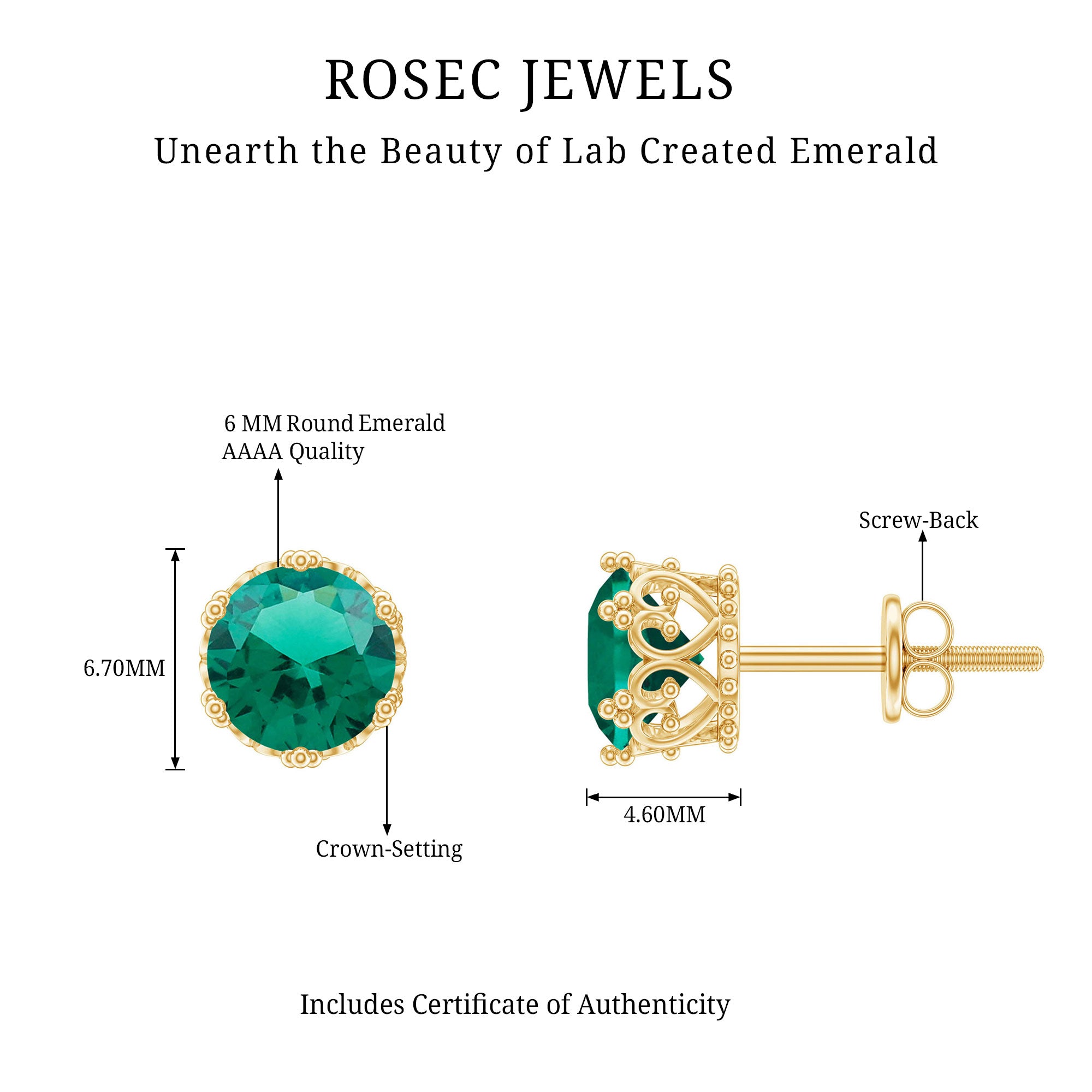 Inspired by royal elegance, these Lab Created Emerald Earrings bring a graceful charm that never goes out of style. The design features a 6 MM round cut lab created emerald, beautifully set in a delicate crown setting that enhances the stone’s rich green glow. The crown-inspired design adds a touch of regal sophistication, allowing the emeralds to sparkle beautifully as they catch the light from every angle. Crafted from high-quality metal, these Solitaire Studs are polished to perfection, offering both durability and elegance for everyday wear or special occasions. Designed with secure screw back closures, these Emerald Stud Earrings provide a comfortable and reliable fit, ensuring you can wear them with confidence all day long. Their simple yet classic look makes them versatile enough to pair with any outfit, adding just the right amount of color and sparkle. Whether you are celebrating a special moment or looking for the perfect gift, these Crown Stud Earrings make a thoughtful and elegant choice.