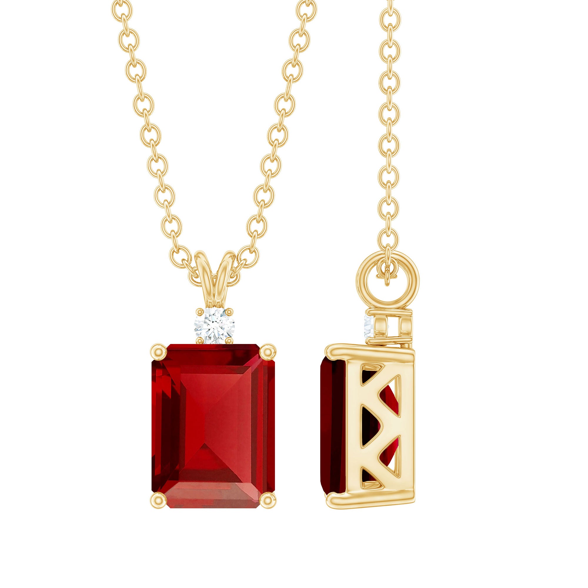 Designed to captivate, this Lab Grown Ruby Necklace brings bold color and timeless elegance to any jewelry collection. At the heart of the design is a striking 6X8 MM emerald cut lab created ruby, known for its vivid hue and AAAA quality. Above the ruby sits a dainty round lab grown diamond of EF-VS quality, meticulously set to add a hint of brilliance and contrast. The stones are securely held in place by prong setting, allowing light to enter from all angles and maximizing sparkle. The Ruby Solitaire Necklace has a deep red tone that symbolizes passion, strength, and love - making it a perfect gift for meaningful milestones or romantic occasions. The Ruby and Diamond Necklace is suspended from a graceful rabbit ear bail, offering a sleek and fluid connection to the chain. The entire piece is handcrafted in 14K yellow gold plated silver, giving it a warm, radiant glow while ensuring durability and comfort. Whether it is for a birthday, anniversary, holiday, or Valentine’s Day, this Emerald Cut Pendant makes a memorable gift that speaks volumes. It is also a standout choice for a bride if she wants something red to mark her big day or an elegant addition to evening wear. Modern yet timeless, bold yet graceful, this pendant necklace is designed to celebrate love, beauty, and life’s most unforgettable moments. A piece meant to be treasured, worn, and passed down for years to come.
