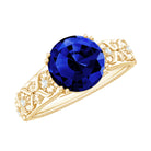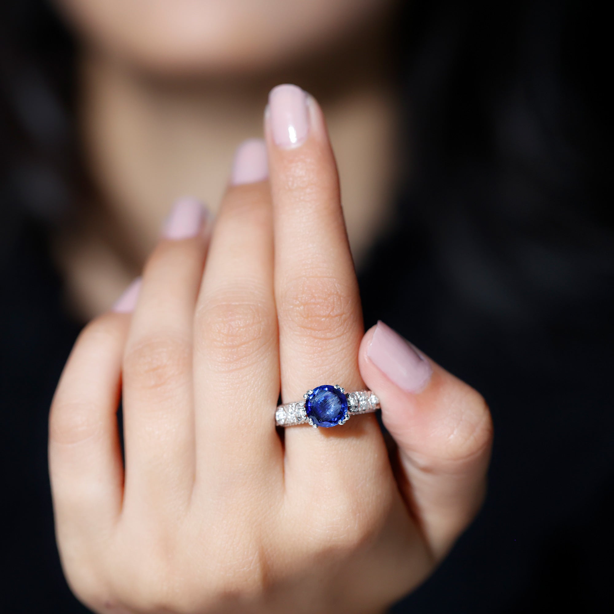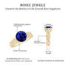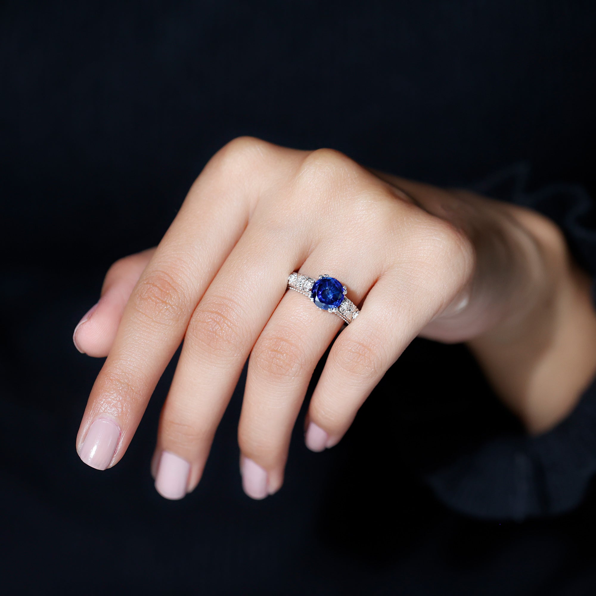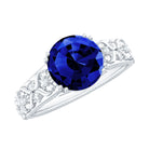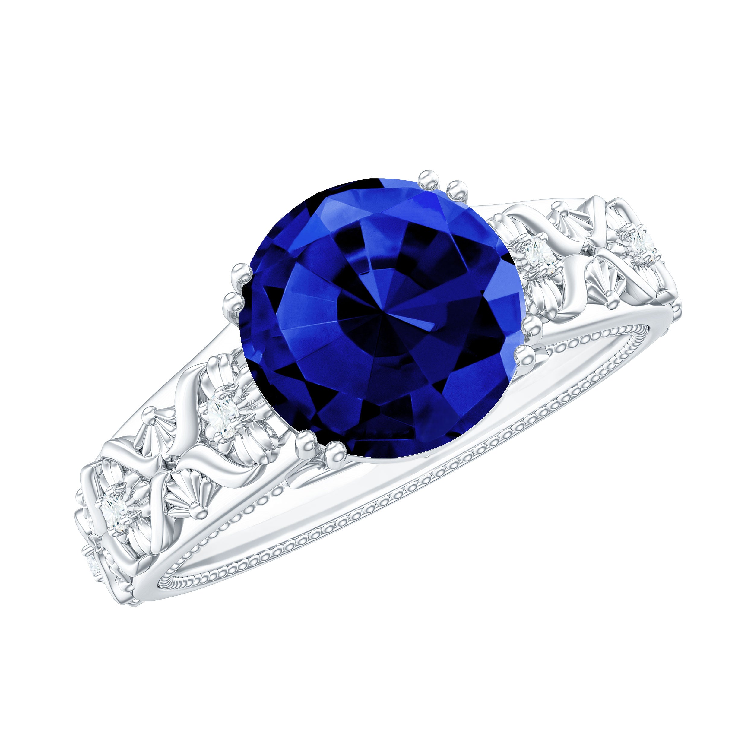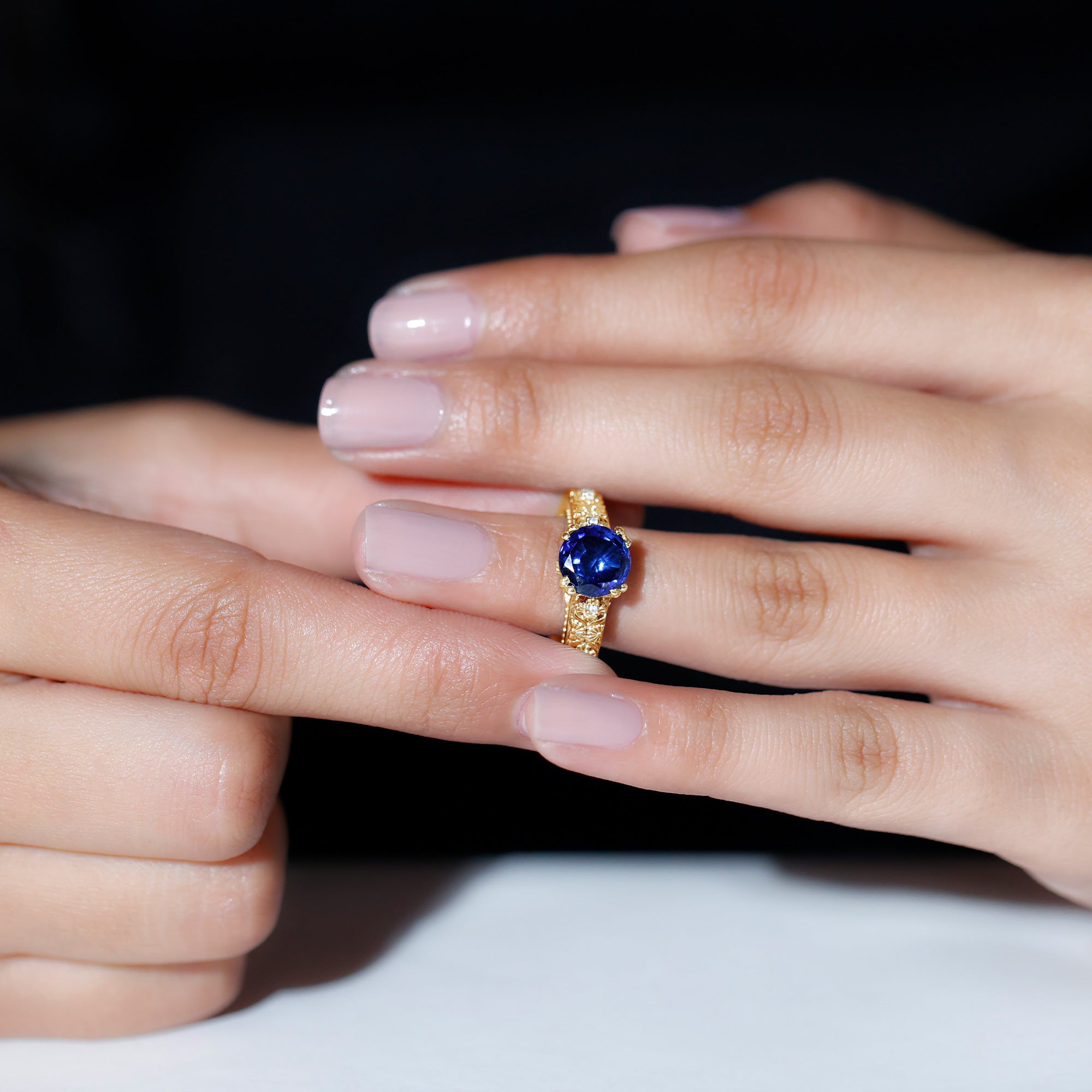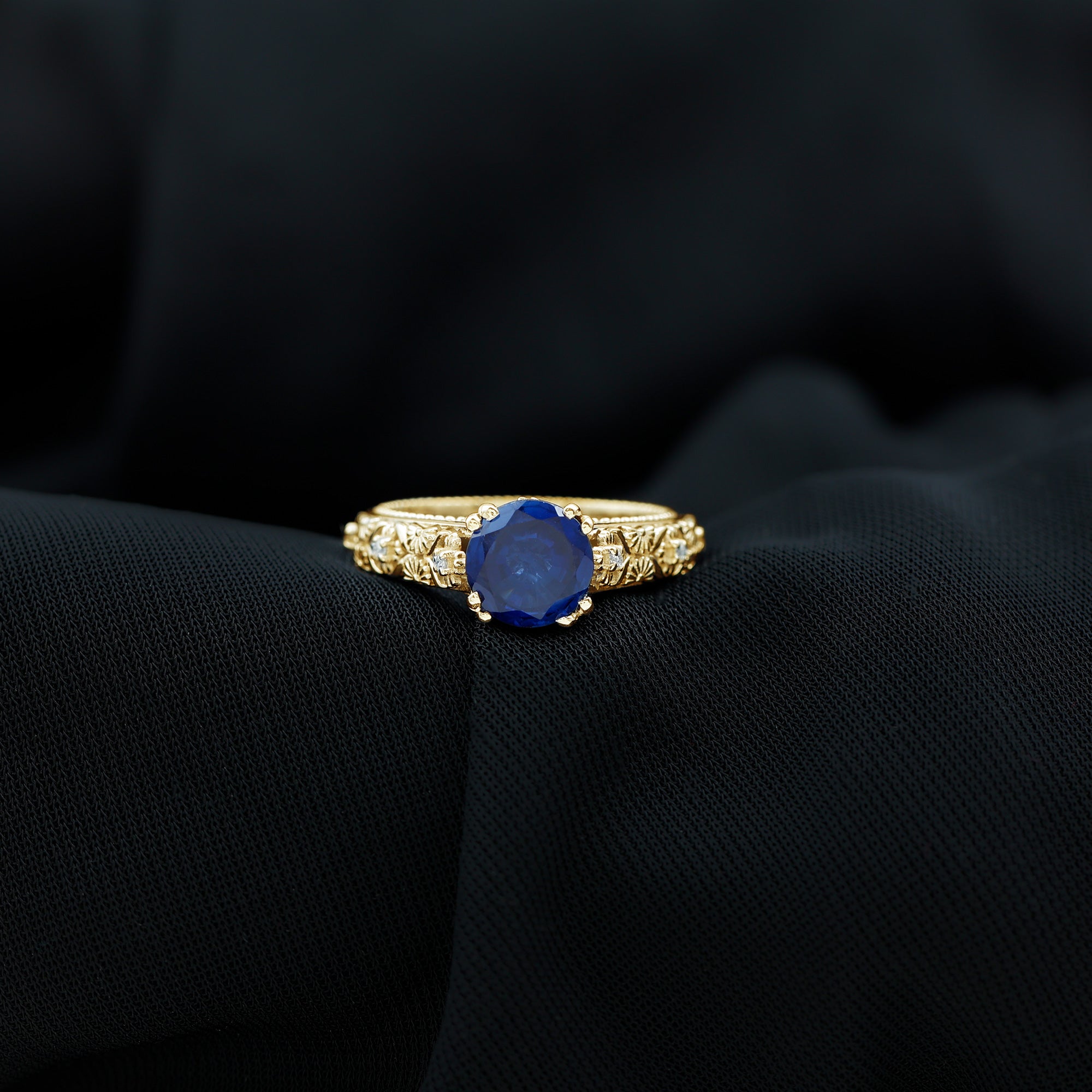 Dont miss out on this exquisite and delicate Flower Ring. Featuring a Round Shape Created Blue Sapphire in a Double Prong Setting with Diamond accents on a Solitaire Ring, it adds a stunning touch to any outfit. Declare your love with this Nature Inspired Engagement Ring and create a lasting impression.