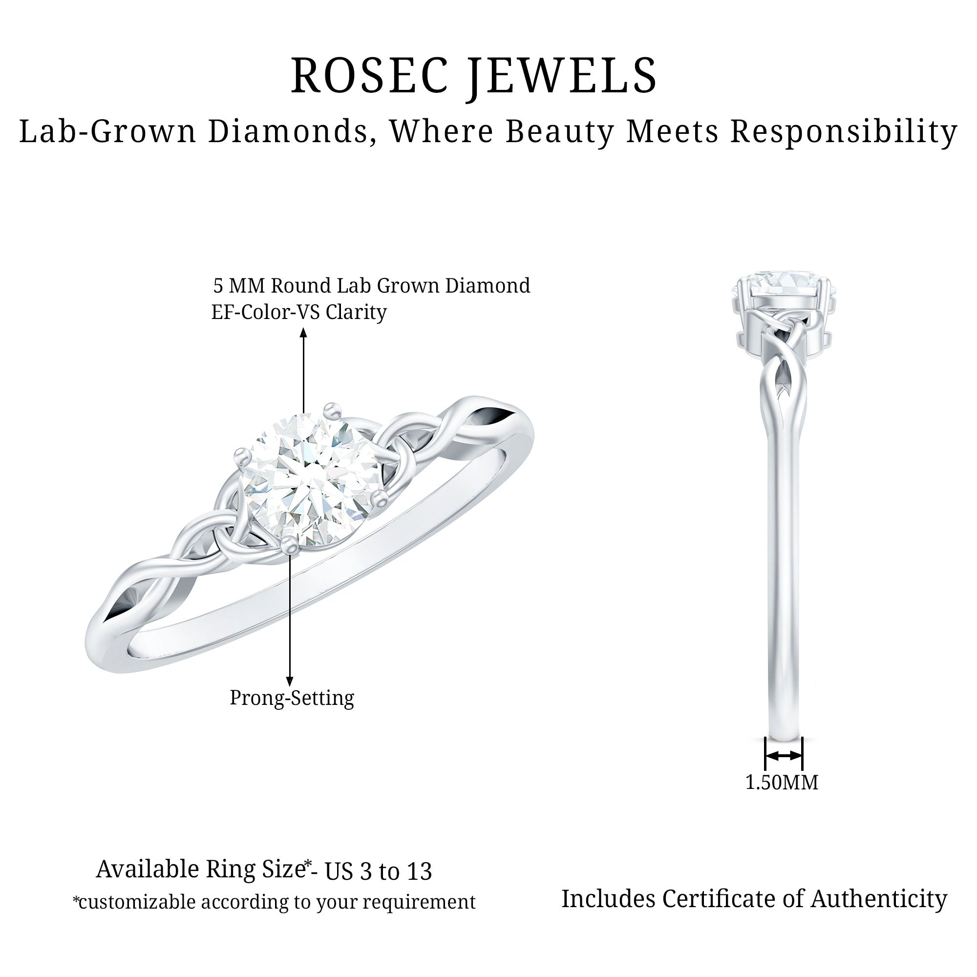 If you are searching for a Promise Ring for Her to present on Valentines Day, you have found the perfect choice! Rosec Jewels features this gorgeous Solitaire Promise Ring, made with a lab created diamond. We designed this Single Stone Ring with a 5 MM Round Cut Lab Grown Diamond, set in Prong Setting on a Celtic Shank. This Diamond Promise Ring, adorned with a trinity knot, represents your commitment in the most dazzling manner. Additionally, if you appreciate simple yet timeless styles, this Love Knot Ring can also be worn on your wedding day. It arrives in a premium jewelry box, ensuring safe delivery and creating unforgettable moments when you propose. This Celtic Knot Ring not only shines with its brilliance but also represents a meaningful style that blends classic elegance with modern sophistication. It strikes the perfect balance between timeless beauty and contemporary charm, making this Lab Grown Diamond Ring for Women a lovely tribute to modern romance. Its distinctive allure makes it perfect for any occasion, whether it is an Engagement, Valentines, or Anniversary.