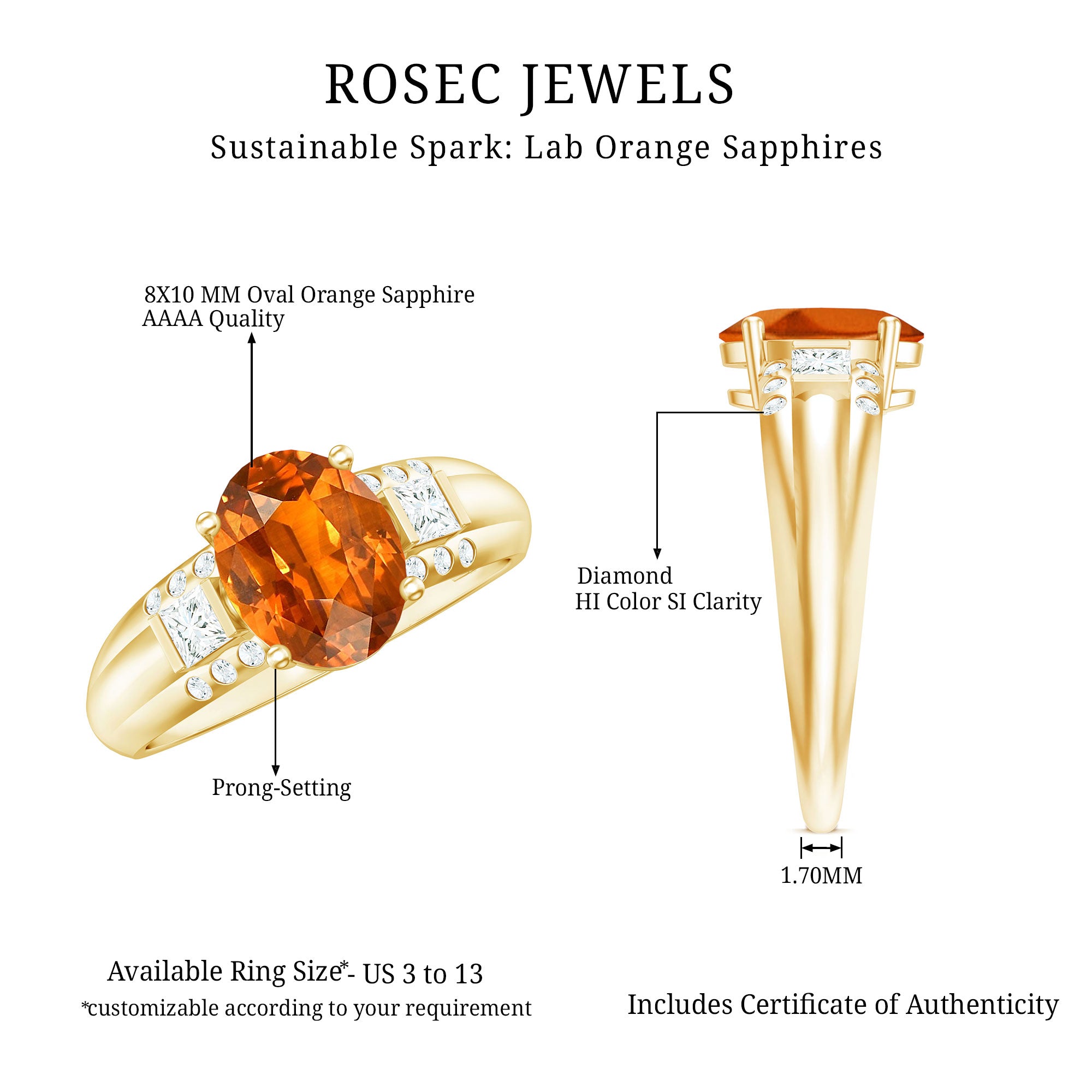 This Engagement Ring is an ideal ring that is highly suggested to make your partner wow. This Solitaire Ring is molded with Solid Gold and adorned with Oval Cut Lab Grown Orange Sapphire secured by Prong Setting while Princess and Round Shape Diamond studded on the shank. To give a new meaning to your love surprise your love with this Solitaire Ring this will surely take her heart away.