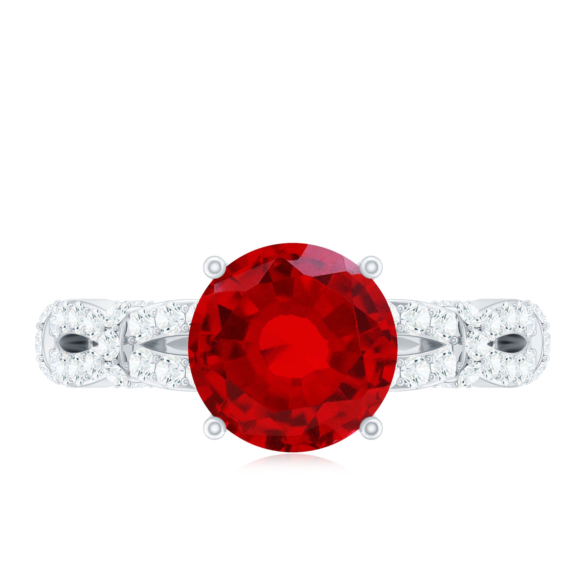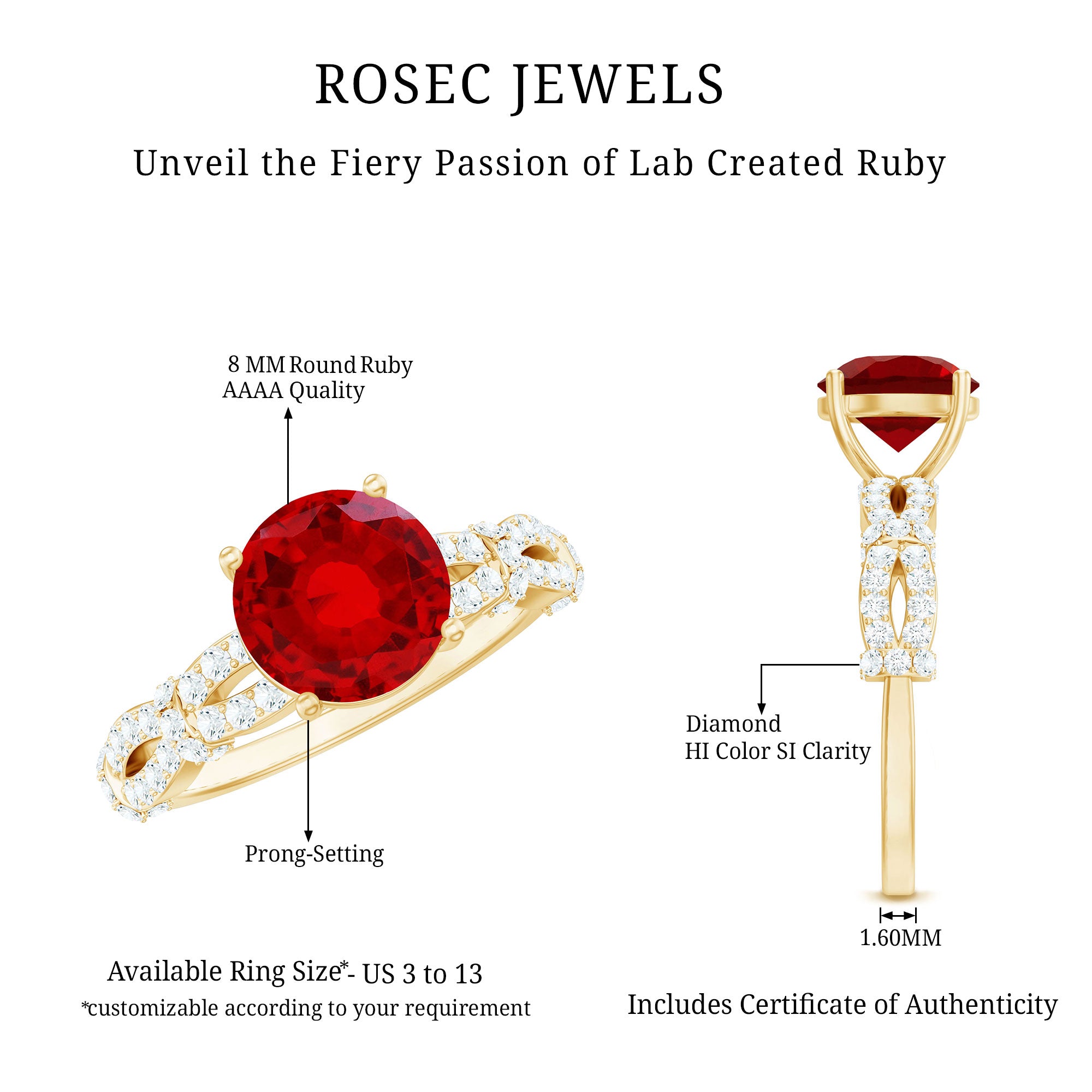 Designed to capture the magic of two hearts coming together. At the heart of this Solitaire Engagement Ring sits a stunning 8 MM round cut lab created ruby, shining bright and full of passion. The band adds a creative twist with diamonds that crisscross gently, making the design eye-catching and different from the usual. There is a sweet surprise too, a secret diamond set right beneath the main stone, adding a hidden touch of romance only you will know about. This Ruby and Diamond Engagement Ring is all about showing how your lives are connected and how your love grows stronger every day. With its mix of classic charm and modern style, this Crossover Engagement Ring is a symbol of your promise, a beautiful reminder of your journey together. Whether you are planning to pop the question or want a meaningful way to show your commitment, this Lab Created Ruby Ring is made to be cherished forever. Simple yet striking, it is the perfect way to tell your love story without saying a word. Available in US sizes 3 to 13 and crafted for a comfortable fit, it arrives in a luxury jewelry box, ready to be gifted and treasured forever.