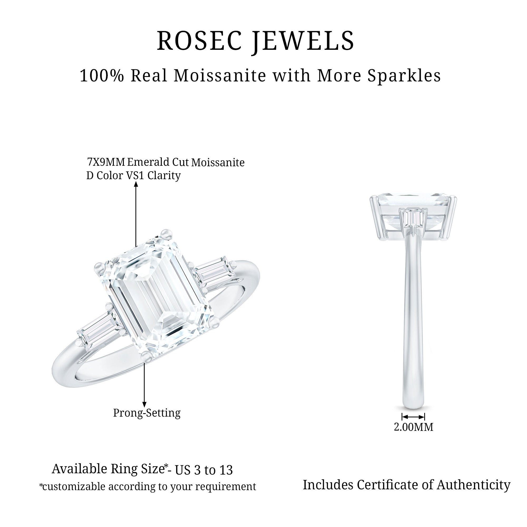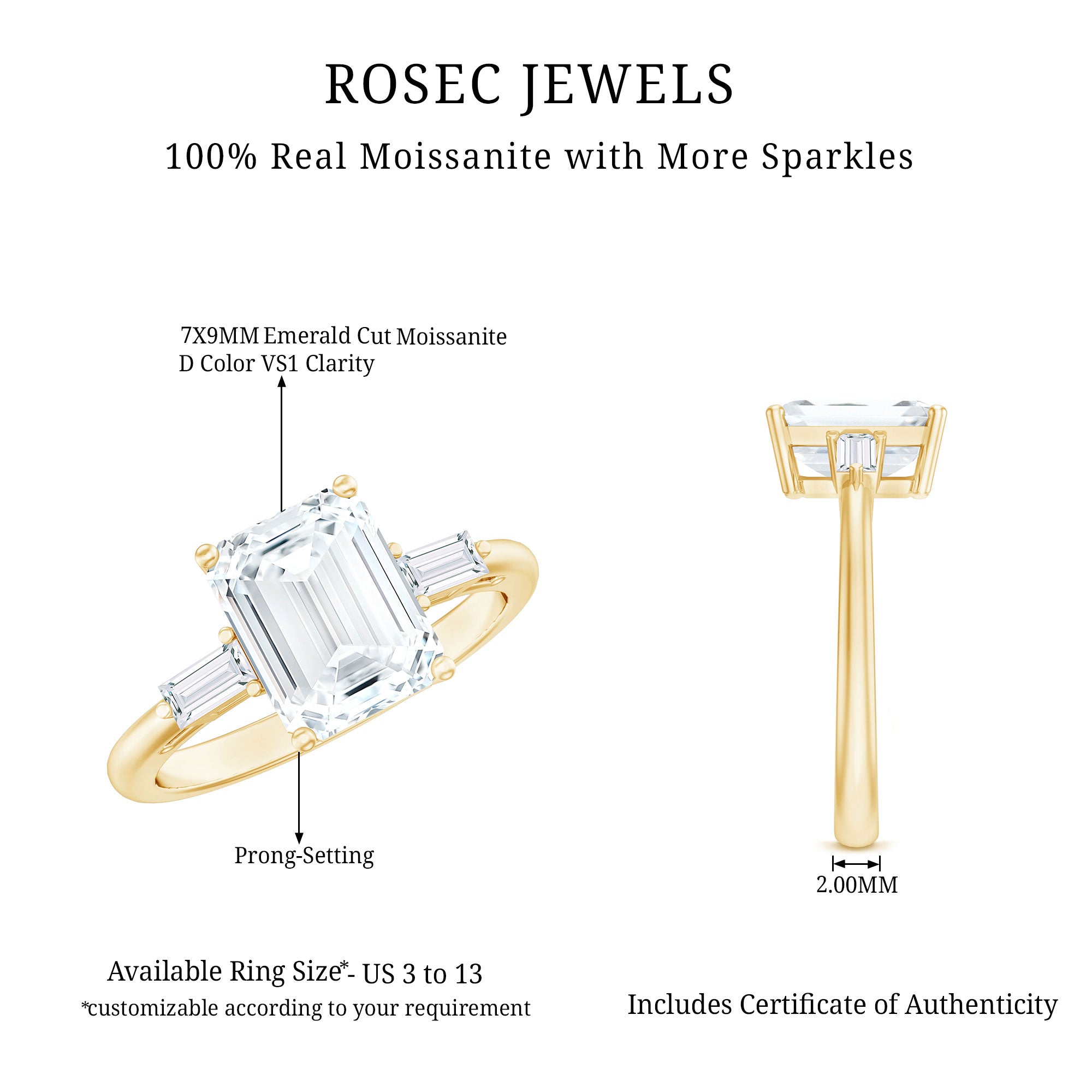 Discover the charm of timeless elegance with this Emerald Cut Moissanite Engagement Ring, a design that radiates both sophistication and uniqueness. At the heart of this stunning piece is a 7X9 MM emerald cut moissanite of D-VS1 quality, securely set in prong setting. The horizontally set 2X4 MM baguette cut moissanite stones on either side adds a unique flair to the Solitaire Engagement Ring. Carefully handcrafted, this Emerald Cut Ring is made for the modern bride who values the blend of classic features with a bold, contemporary edge. Ideal for engagements, anniversaries, or any memorable occasion, it transcends mere jewelry to become a timeless heirloom in the making. Beautifully presented in a signature jewelry box, this 2 Carat Moissanite Ring is poised to celebrate your most treasured moments with elegance and shine. A tribute to clarity, craftsmanship, and enduring beauty, this Moissanite Ring is a sophisticated reflection of your love story, bold, brilliant, and forever one-of-a-kind.