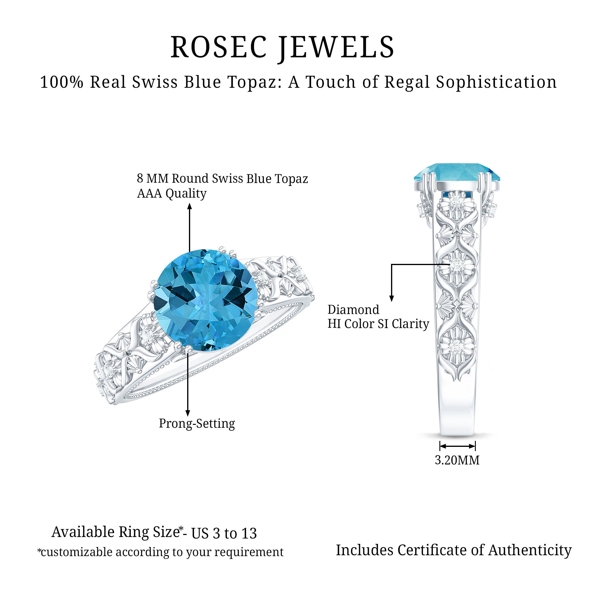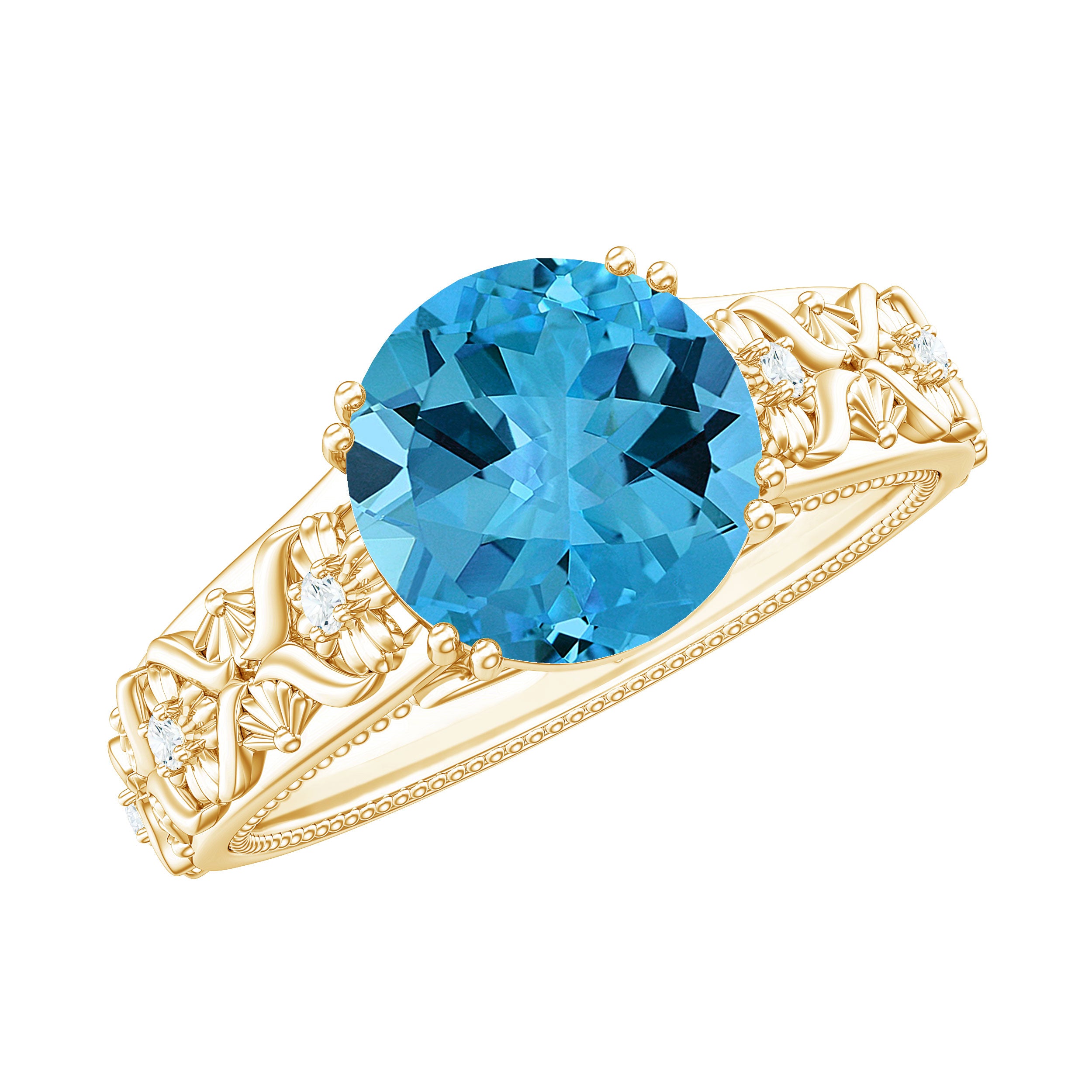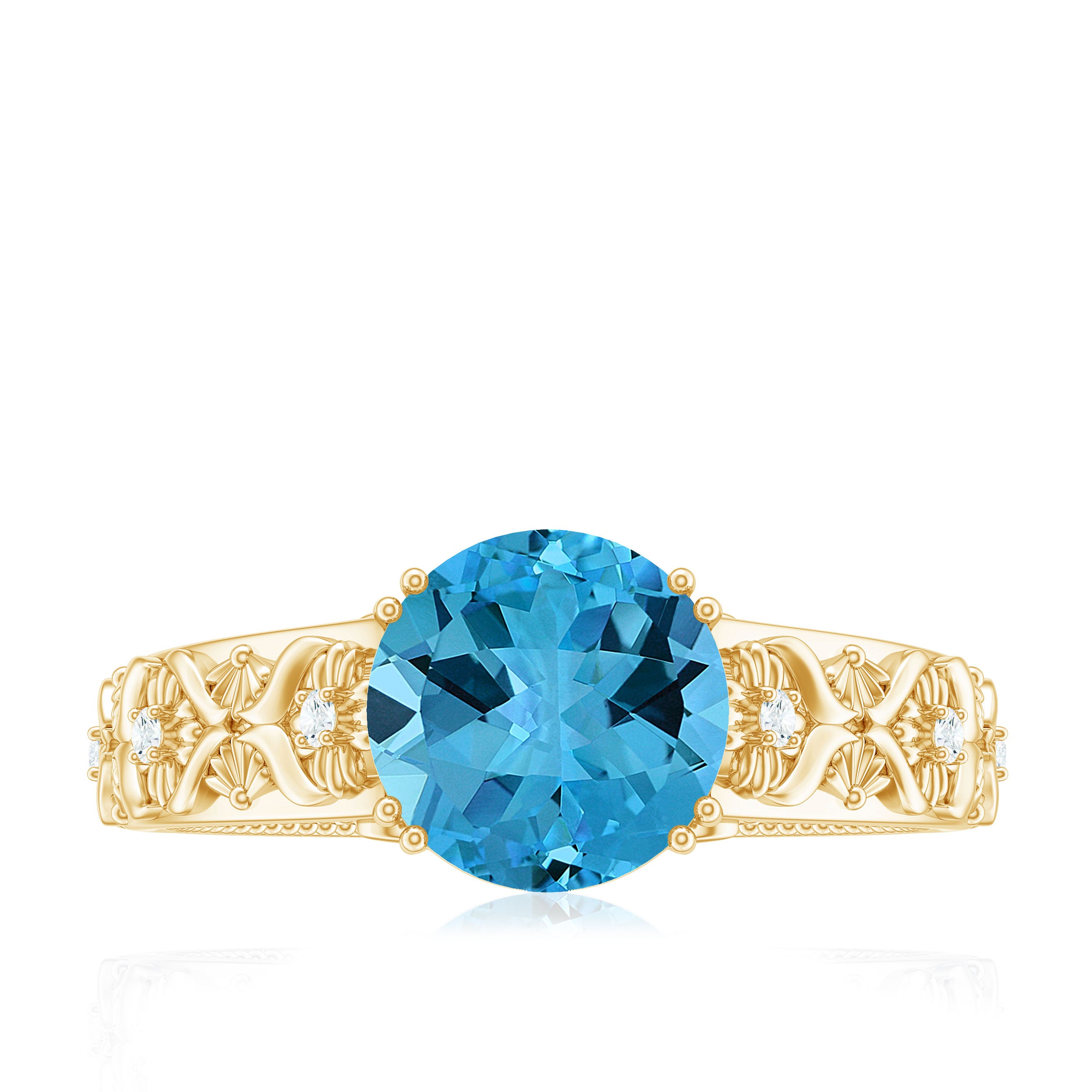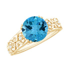 An engagement ring featuring a stunning 8 MM Round Shape Swiss Blue Topaz, delicately set in a double prong setting and further adorned with Round Diamond accents. The solitaire ring boasts a shank inspired by floral motifs, a heartfelt symbol of everlasting love for your beloved to treasure.