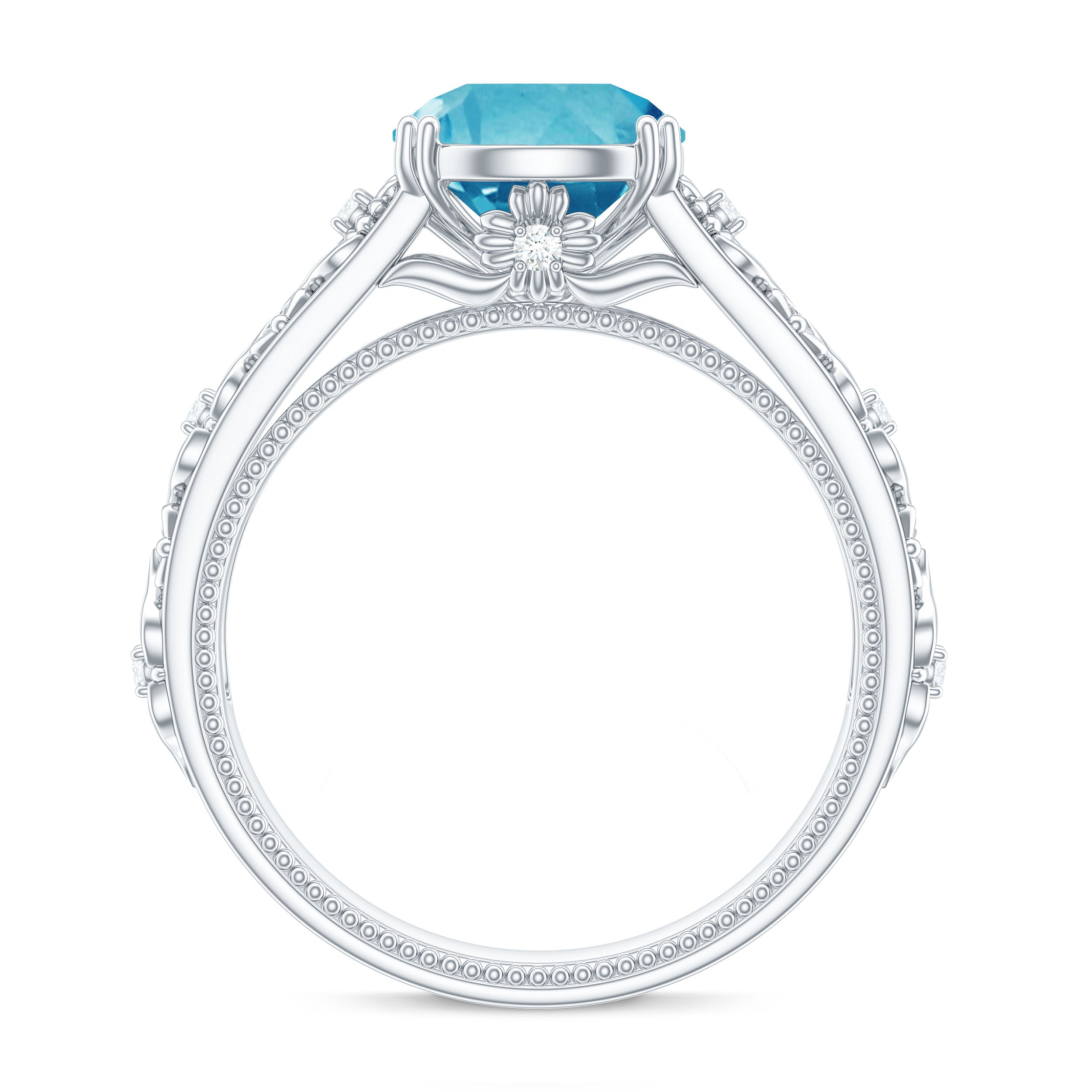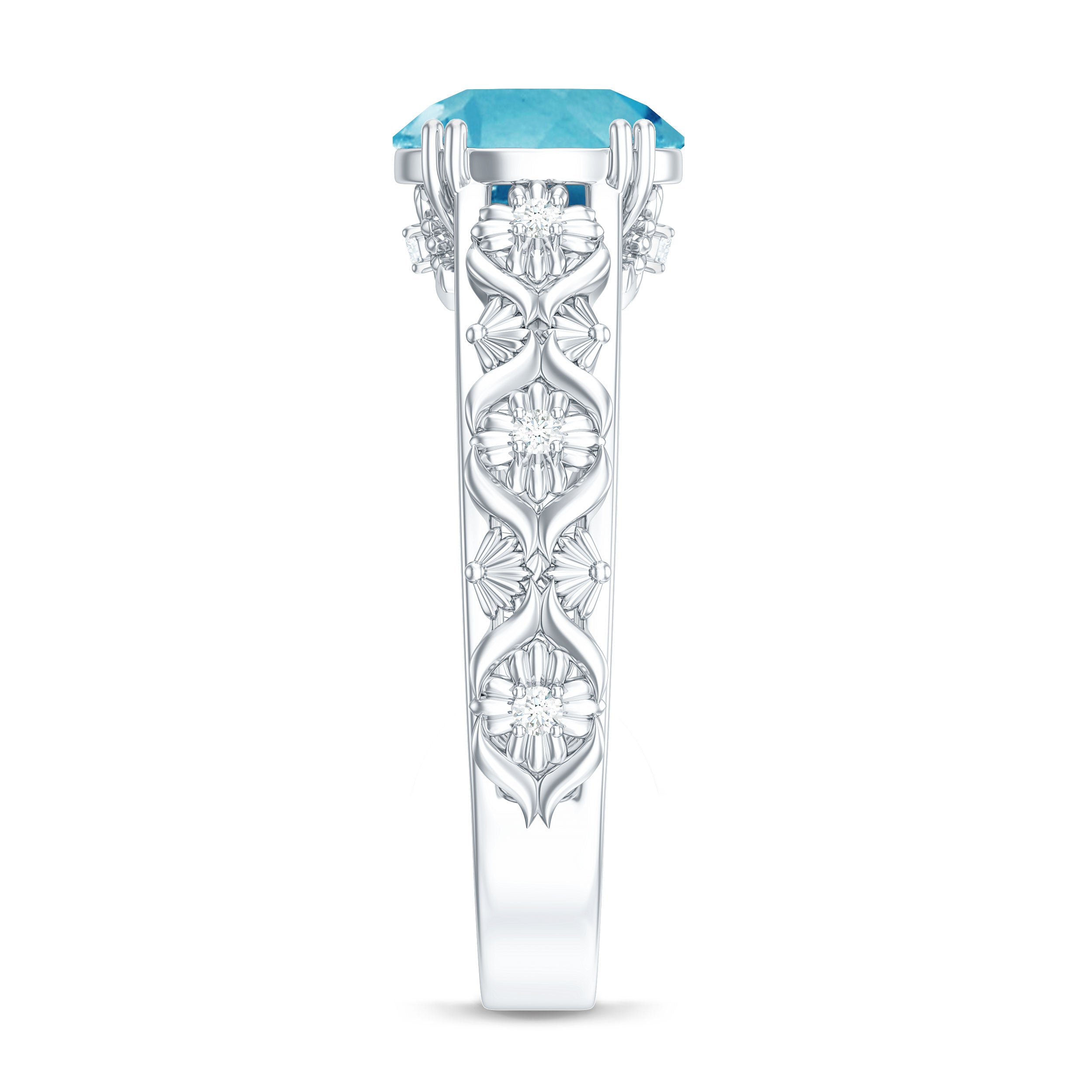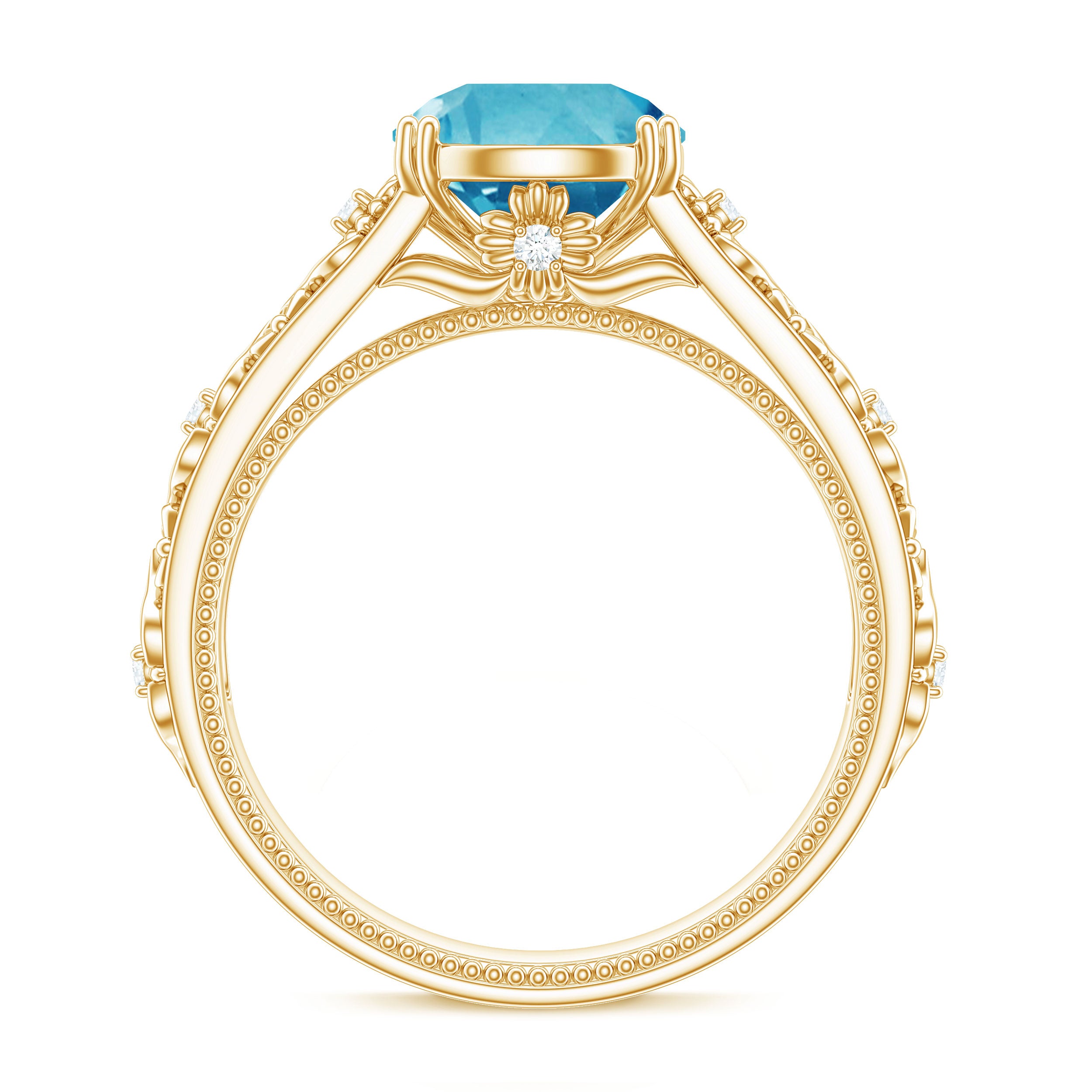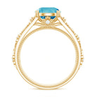 An engagement ring featuring a stunning 8 MM Round Shape Swiss Blue Topaz, delicately set in a double prong setting and further adorned with Round Diamond accents. The solitaire ring boasts a shank inspired by floral motifs, a heartfelt symbol of everlasting love for your beloved to treasure.