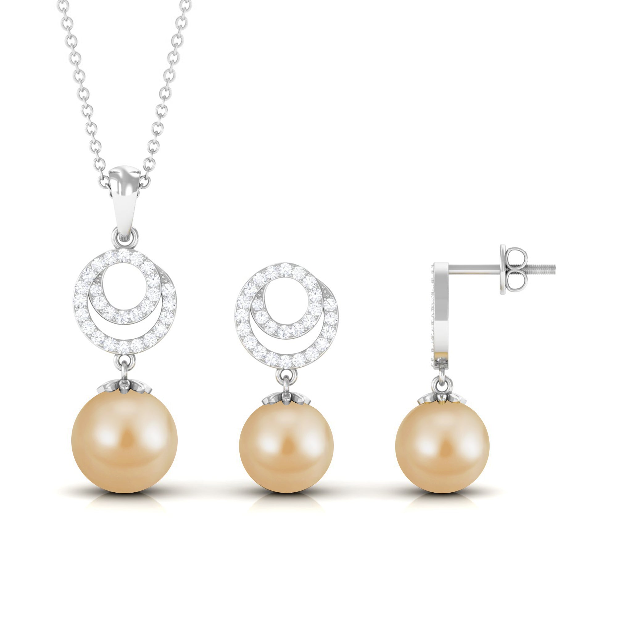 Experience the sheer brilliance of this meticulously crafted Pearl Jewelry Set, a testament to exquisite craftsmanship destined to leave an enduring mark. This Pendant and Earrings Set features an elegant South Sea Pearl delicately nestled within a Bead Setting. It gracefully dangles from a circle adorned with shimmering Moissanite gemstones, creating a stunning and captivating ensemble thats bound to make a lasting impression.
