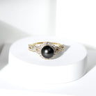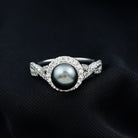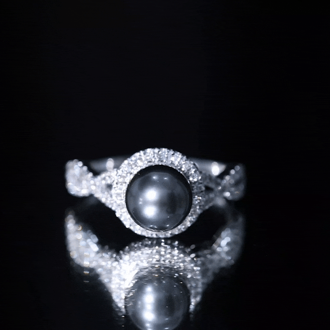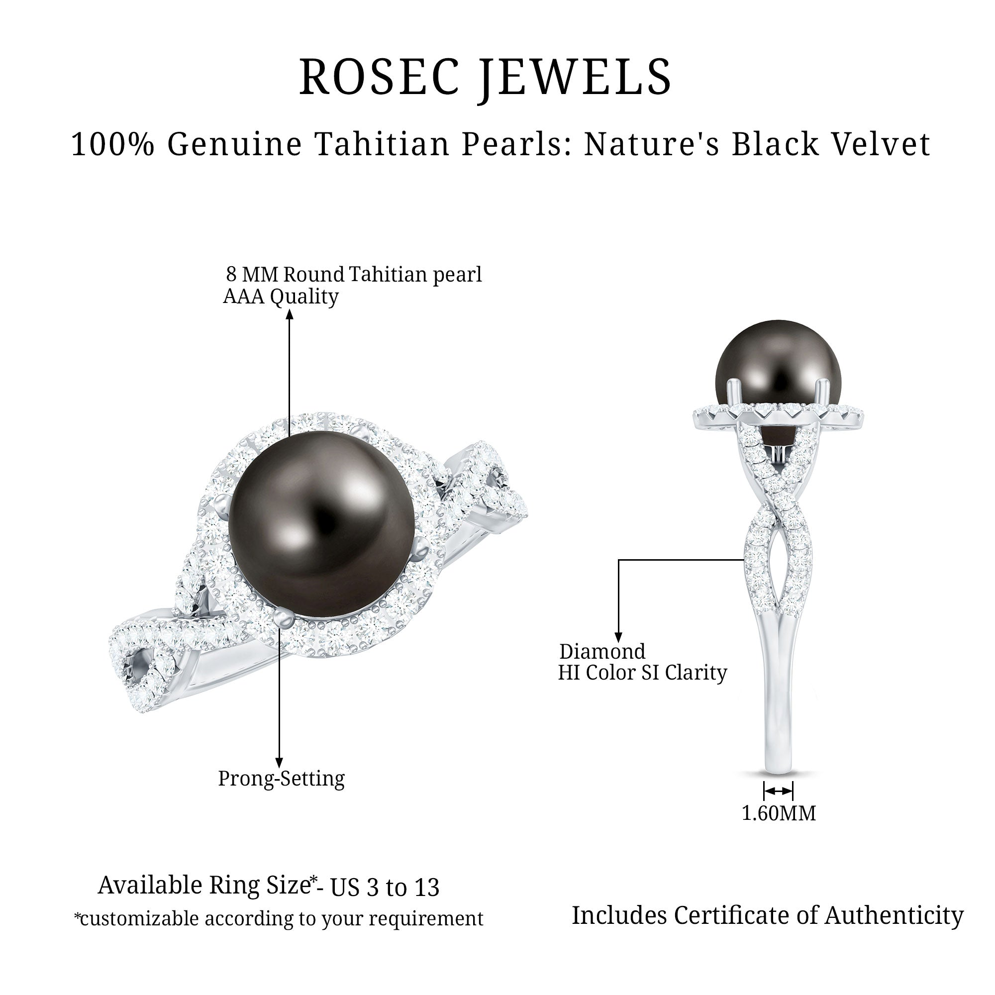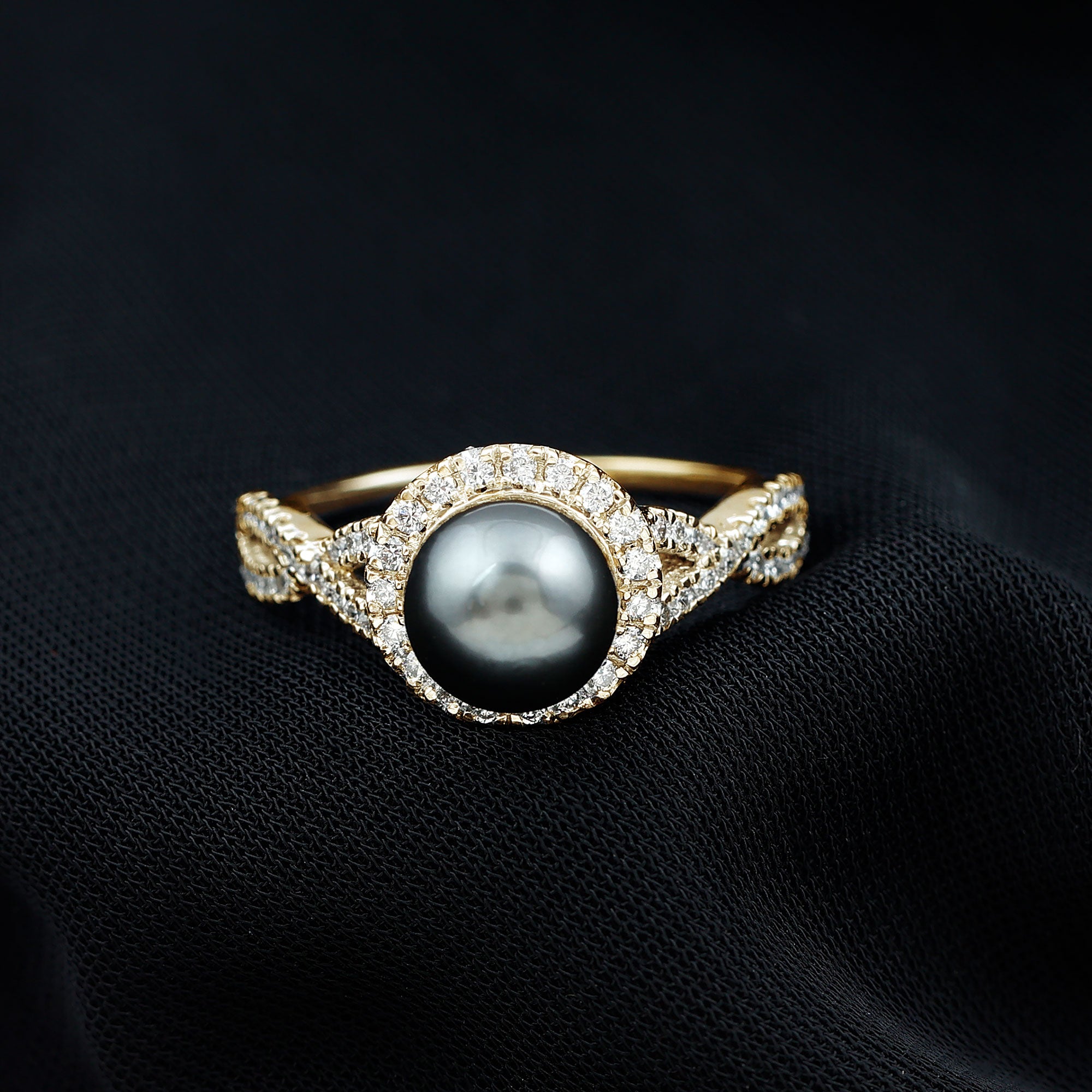A glow like midnight captured in a perfect sphere makes this Tahitian Pearl Engagement Ring a true celebration of natural beauty. Curated with an 8 MM round cut Tahitian pearl, set securely in bead setting. Surrounding the center pearl is a delicate halo of sparkling diamonds that adds brilliant light and creates a romantic look. The crossover shank brings a modern touch to this traditional style. Two gently twisting bands, each decorated with small diamonds, meet perfectly beneath the pearl. Their soft sparkle enhances the overall design without taking attention away from the center stone. Beneath the pearl, two surprise diamonds are set quietly into the band, adding a meaningful detail meant only for the wearer to see. These secret stones symbolize a love that is deep, personal, and lasting. This Tahitian Pearl and Diamond Engagement Ring is available in a variety of sizes, ensuring a comfortable and perfect fit. It arrives in an elegant jewelry box, ready for gifting on your special day. Whether for a proposal, anniversary, or promise of forever, this Crossover Engagement Ring is made to be cherished for a lifetime.